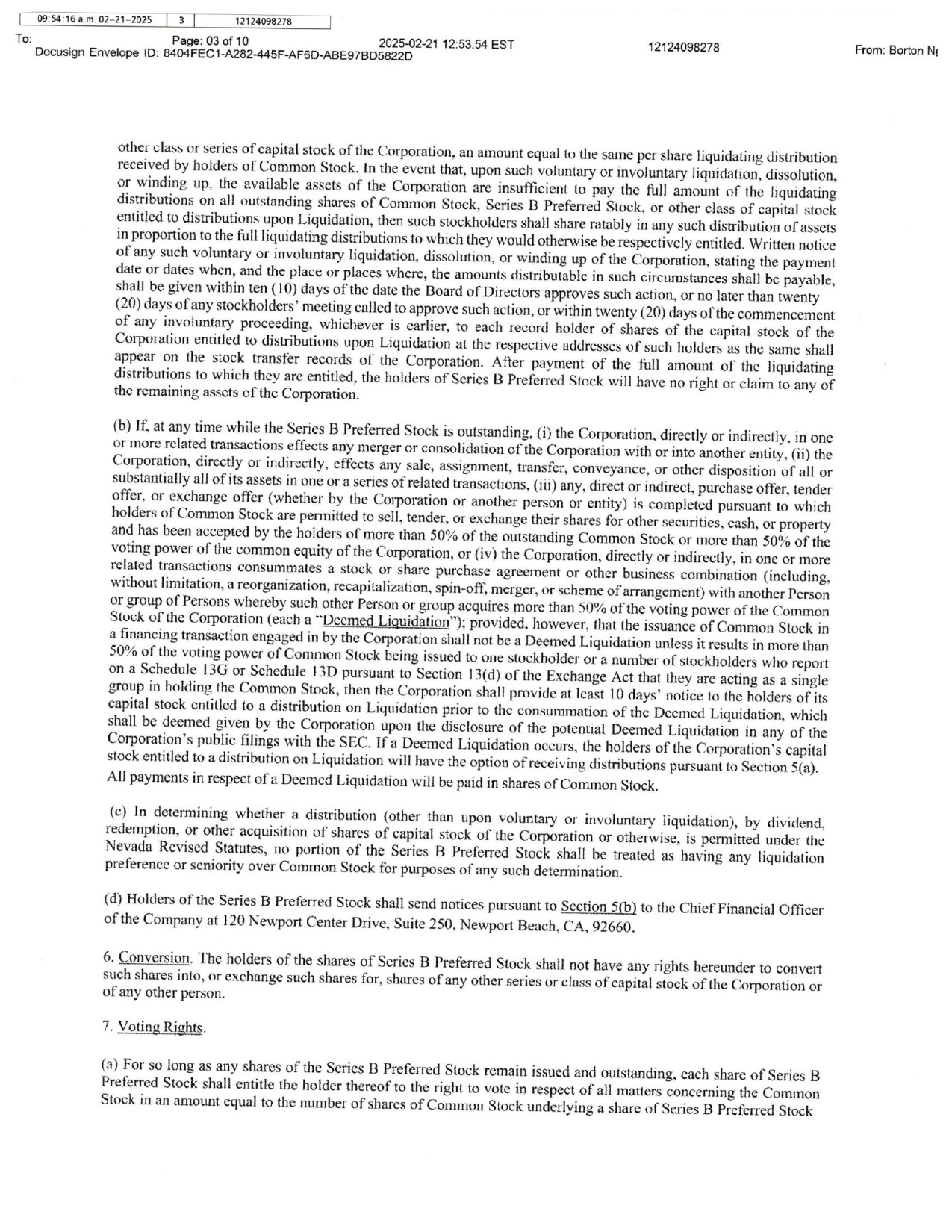 To: Page: 03 of 10 202542 - 21 12:53:54 EST Docus)gtJ Envelope 10. 8404FEC1 - A282 - 445F - AF6D - ABE97BO5822O 12t24O98278 other class or series of capital stock of the Corporation, an amount equal to the same per share liquidating distr i button received by holders of Common Stock . ma the event that, upon such voluntary or involuntary liquidation, dissolution, or winding up, the available assets of the Corporation arc insufficicni to pay the full amount of the liquidating distributions on all outstanding shares of Common Stock, Series B Preferred Stock, or other class of capital stock entitled to distributions upun Liquidation . then such stockholders shall share ratably in any such distribution of asseis in proportion to the full liquidating distributions to which they would otherwise be respectively entitled . Written notice of any such voluntary or involuntary liquidation, dissolution, or winding up of the Corpotation, stating the py yfnent date or dates when, and the place or places where, the amounts distributable ie such circumstances shall be payable, shall be given within ten ( 10 ) days of the date the Board of Directors approves such aciion, or no later than twenty ( 20 ) days of any stockholders’ meeting catled to approve such action, or within twenty ( 20 ) days of the commencement of any involuntary proceedint„ whichever is earlier, to each record holder of shares of the capital stock of the Corporation cntitlcd to distributions upt›n Liquidation at the respective addresses tit such holder as the same shall appear on the stock transt'er records of' the Corporation . Atier payment of‘ the fiill amount ot‘ the liquidating distributions to which they arc entitled, the holders of Series B Preferred Stock will have no right or claim to any of the remaining assets of the Corporation . (b) If . at any time while the Series B Preferred Stock is outst‹anding, (i) the Corporation, directly or indirectly . in one or more related transactions effects any merger or consolidation ot the Corporation with or into another entity, (ii) the Corporation, directly or indirectly, effects any sale, assignment, transfci, conveyance, or otlicr disposition of all or substantially all of its assets in one or a señes of related transactions, (iii) any, direct or indirect, purchase offer, tender offet, or exchange offer (whcthcr hy the Corporation or another person or entity) is completed pursuant to which holders of Common Stock are permitted to sell, tender, or exchant,e their shares for other securities, cash, or property and has been accepted by the holders of more than SOA» of the outstanding Common Stock or more than 50 iâ of the voting power or be common equity of the Corporation, or (iv) the Corporation, directly or indirectly, in one or more related transactions consummates a stock or share purchase agreement or other business combination (incl uding, without limitation, a reorganization, rccapitalization, spin - off, merger, or scheme of arrangement) with anothcr Person ι ^ 6 r u p o f Persons whereby such othcr Person or group acquires more than 50 % of the voting power of the Common Stock of the Corporation (each a “D eemed Liquidation ”) ; provided, however, that the issuance of Common Stork in y financing tmosaction engaged in by thc Corporation shall not be a Deemed Liquidation unless it results in more than 50 % of the voting power of Coiiiiiiun Stock being issued to one stockholder or a number of stockholders wlie report on a Schedule 13 G or Schedule 13 D pursuant to Section l 3 (d) of' the Exchange Act that they are acting as a single group in holding ihe Common Stock, then the Corporation shell provide at least 10 days' notice to Ihc hnlders of its capital stock entitled to o distribution on Liquidation prior to the consummation of thc Deemed Liquidation, which shall be deemed givcn by the Corporatism upon the disclosure of the potential Deemcd Liquidation in any of the Corporation's public filings with tlie SEC . If a Deemed Liquidation occurs . the holders of the Corporation’s capital stock entitled to a distribution on Liquidation will have the option of receiving distributions pursuant to Section 5 (a) . All payments in respect of a Deemed Liquidation will be paid in shares of Common Stock . (c) In determining whether a distribution (other I han upon voluntary or involuntary liquidation), by dividend, redemption, or other acquisition of shares of capital steck of the Corporation or otherwise, is permitted under the Nevada Revised Statutes, no ponion of the Series B Preferred Stock shall he treated as having any liquidation preference or seniority over Common Stock for purposes of any such determinalion . (d) Holders of the Series B Preferred Stock small send notices pursuant to Section 5 (b) to the ClJief Financial Officer of the Company at 120 Newport Center Drive, Suite 250 , Newport Beach, CA, 92660 . 6. Conversion . The folders of the shares of Series B Preferred Stock shall not have any rights hereunder to convert such shnres into, or exchange such fihores for, shores of nny other fieries or closs of cnpitnl stock of the Corporation or of any other person . 7. Voting Rights . (at For so long as any shares of the Series B Preferrcd Stock remain isseed and outstanding, each share of Scries B Preferred Stock shall entitle the holdcr thereof to the right to vote in respect of all ITiattCtS CODCe i ι 8 the Common Slock in an amount equal to the rim ther of shares of Common Stock underlying a share of Series B Prefers ed Stock From: Barton N!