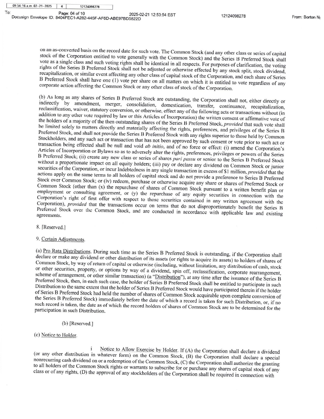 To: Page: 04 of 10 2025 - 02 - 21 12:53 - .54 ESD Docusigia Envelope ID: &4O4FEC1 - A2B2 - 445F - AF6D - ABE97BD5822D 1212409B278 on an as - converted basis on the record date for such vote . The Coiiunon Stock (and any other class or series of capital stock of the Corporation entitled to vote generally with the Common Stock) and the Series B Preferred Stock shall vote as a single class and such voting rights shall be identical in all respects . For purposes of clarification, the voting rights of the Series B Preferred Stock shall not be adjusted or olherwise effected by any stock split, stock dividend, recapitalization, or similar evcmt affecting any other class of cupital stock of the Corporation, and each share of Series B Preferred Stock shall have one (I ) vote per share on all matters on which it is entitled to vote regardless of any corporate action affecting the Common Stock or any other class of stock of the Corporation . (b) As long as any shares of Series B Preferred Stock are outstanding, the Corporation shall not, either directly or indirectly by amendment, merger, consolidation, domestication, transfer, continuance, recapitalization, reclassification, waiver, statutory conversion, or otherwise, effect any of the following acts or transactions without (in addition to any other vote required by law or this Articles of Incorpoiution) the written consent or affirmativc vote of th e holders of a majority of ihe then outstanding shares of the Series B i • referred Stock, provided that such vote shall be limited solely to matters directly and materially affecting the rights . preferences, and privileges of the . Series H Preferred Stock, end sholl not provide the Series B Preferred Stock with ony rights superior to those held by Common Stockholders, and any such act or transaction that has not been approved by such consent or vote prior to such act or transaction being effected shall be null and void at ioifio . and of no force or effect : (i) amend the Corporation's Articles of Incorporation or Bylaws so as to adversely alter the rights, preferences, privileges or powers of the Series B Preferred Stock ; (ii) create any new class or serics of shares part pu . men or senior to the Series B Preferred Stock without a proportionate impact on alt equity holders ; (iii) pay or declare any dividend on Common Stock or junior securities of the Corporation, or incur‘ Indebtedness in any single transaction in excess of $ 1 million, resided that the actions apply on the same terms to all holders of capital stock and do not provide a preference to Series B Preferred Stock over Common Stock ; or (iv) redeem, purchase or otherwise acquire any share or shares of Preferred Stock or Common Stock (other than (x) the repurchase of shares of Common Stock pursuant to a written benefit plan or employment or consulting agreement, or (y) the repurchase of any equity securities in connection with the Corporation’s right of first offer with respect to those securitics contained in any writtcn agreement with the Corporation), provided that the transactions occur on terns that do not disproportionately benefit the Series B Preferred Stock over the Common Stock, and nre conducted in accordance with applicable law and existing agreements . S . [Reserved . ] 9 . Certain AdjustmmLe . (a) Pro Rata Distributions . During sucb time as the Series B Preferred Stock is outstanding . if the Corporation shall declare or make any dividend or other distribution of its assets (or rights to acquire its assets) to holders of shares of Conmion Stock, by way of return of capital or otherwise (including, without limitation, any distribution of cash, stock or other securities, property . or options by way of a dividend, spin off . reclassification, corporate rearrangement, scheme of arrangement, or other similar transaction) (a “D istribution "), at any time after the issuance of the Series B Preferred Stock, then, in each such cnse, the holder of Series B Preferred Stock shall be entitled to participate in such Distribution to the same extent that the holder of Series B Preferred Stock would have participated therein if the holder of Series B Preferred Stock had held the number of shares of Common Stock acquirable upon complete conversion of the Series B Preferred Stock) immediately before the date of which a rerord is tnken for such Distribution, or, if no such record is taken, the date as of which the record holders of shares of Common Stock arc to be determined for the panicipation in such Distribution . (c) Notice to Holder. i Notice tg Allow Exercise by Holder . If(A) the Corporation shall declare a dividend (or any other distribution in whatever form) on the Common Stock, (B) the Corporation shall declare a special nonrecurring cash dividend on or a redemption of the Common Stock . (C) the Corporation shall authorize the grantmg to all holders of the Common Stock rights or warrant to subscribe for or purchase any shares of capital stock of any class or of any rights, (D) the approval of any stockholders of the Corporation shall be required in connection with From: Burton Ni