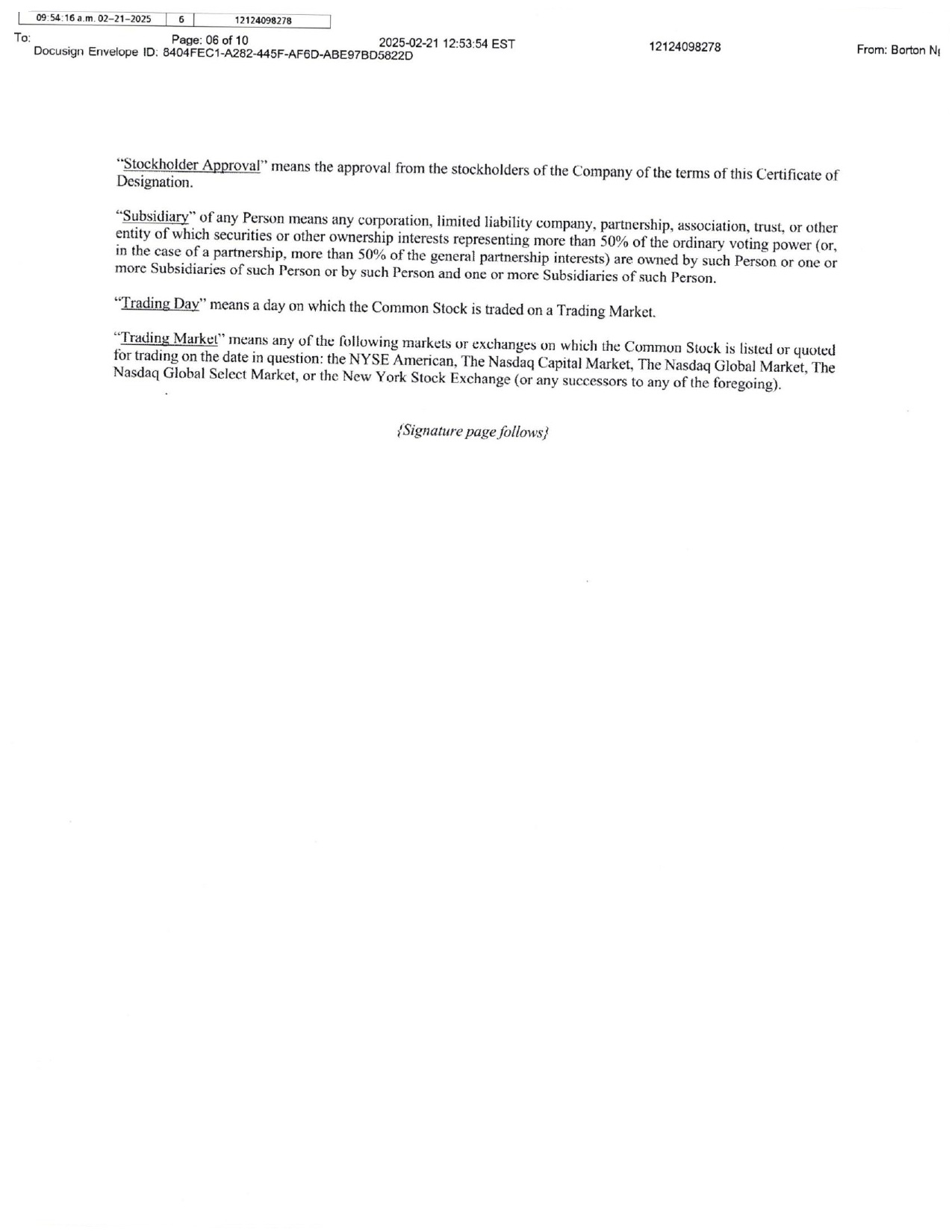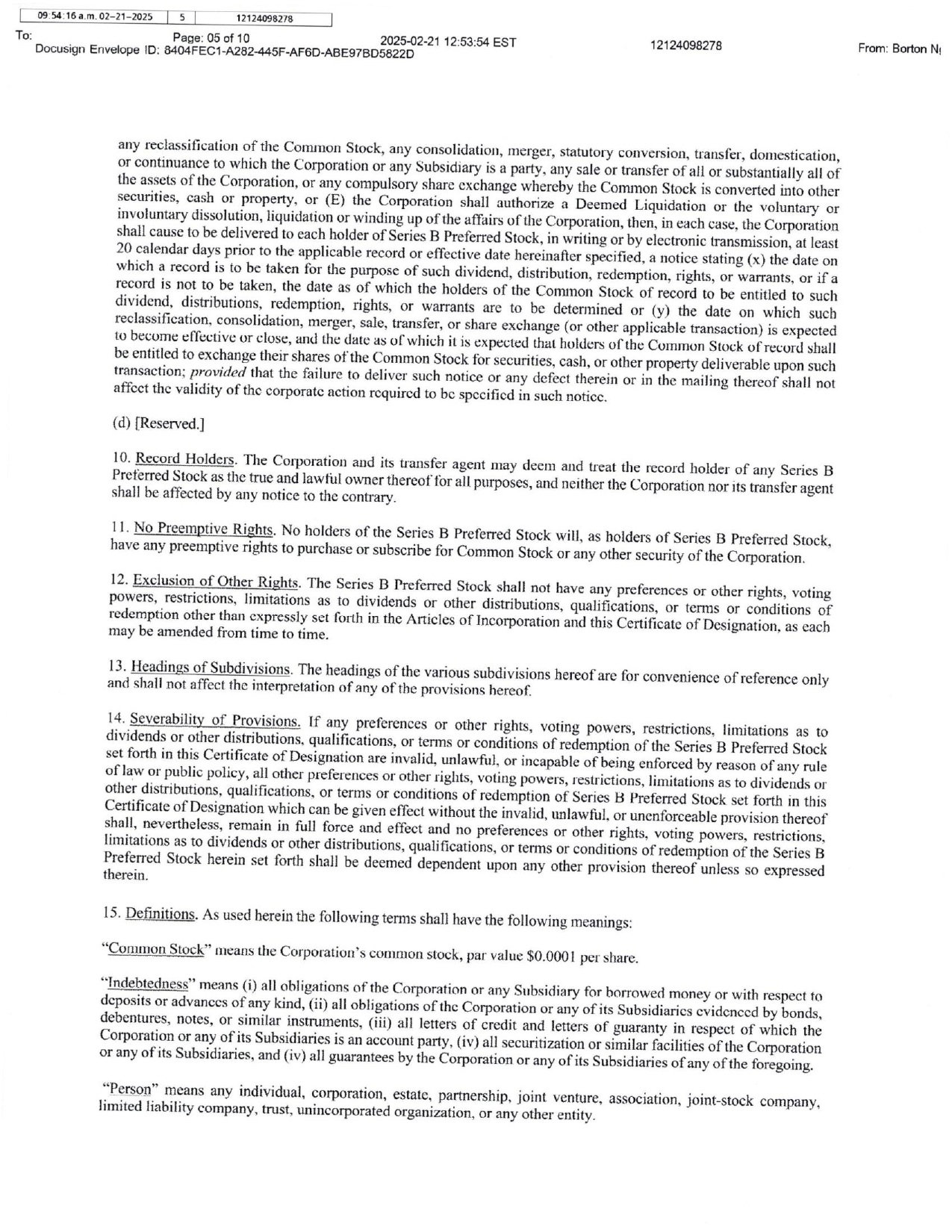 To.’ Page: 05 of 10 2025 - 0t - 21 12:53:54 EST Docusign Env&ope ID: 8404FEC1 - A2g2 - 445F - AF6D - ABE97BD5g22D any reclzssification of the Coinnion Stock, any consolidation, inerger, statutory conversion, transfcr, doiuesticatiou, or continuance to which the Corporation or any Sobsidiary is a party, any sale or transfer of all or substantîally all of the assets of the Corporation, or any compulsory shate exchange whereby the Coinmon Sxock is converted into other securities, cash or property, or (E) the Corporation shall authorize a Deemed Liquidation or the voluntary or involuntary dissolution, liquidation or winding up of the afPairs of the Corporation . then, in cach vase, the Corporation shall cause to be delivt : red to each holder of Series B Preferred Stock, in whiting or by electronic tmnsmission, at least 20 calendar days prior to the applicable record or effective date hereinafter specified . a notice stating (x) the date on which a record is to be taken for the purpose of such dividcnd, distribution, rcdemption, rights, or warrants, or if a record is not to be taken, the date as of which the holders of the Common Stock of record to be entitled to such dividend, distributions, redemption . rights, or warrants are to be determined or (y) the date on which such reclassification, consolidation, merger, sale, transfer, or share exchange (or other applicable transaction) is expected to bccumc effective or close, and the date as of which it is cnpcvted that holden of the Common Stock of rcccrd shall be entitled to exchange their shares of‘the Common Stock tör securities, cash, or other property deliverable upon sucli transaction ; JirovideN that the failure to deliver stich notice or any defecl therein or in the mailing thereof shall not affcct the validity of the corporate action rcquirod to bc spccificd in such notice . (d) [Reserved . ] 10. Record Holders . Tire Cortxn - ation and its transfer agent may deem and treat the record holder of any Series B Preferred Stoct ; as the true and lawtiil owner thereot for all purposes . and neither the Corporation nor its transfer agent shall be affected by any notice to thc contrary . 11. No Preemptive Rights . No holders of the Series B Preferred Stork will, as holders of Series B Preferred Stock, have any preemptive rights to purchase or subscribe for Common Stock or any other security of the Corporation . 12. E xclusion of Other Riehts . The Series D Preferred Stock shall not have any preferences or other rightg, voting powers, restrictions, limitations as to dividends or other distributions, qualifications, or rerms or conditions of redemption other than expressly set forth in the Articles of’ Incorporation and this Certificate of Dcsignation, as each may be amended from time to time . 13. H eadings of Subdivisions . The headings of the various subdivisions hereof are for convenience of reference only and shall not affect the interpretation of any of the provisions hereof . 14. S everability of Provisions . If any preferences or other rights, voting powers, restrictions, limitations as to dividends or other distributions . qualifications, or terms or conditions of redemption of the Series B Preferred Stock set forth in this Certificate of Oesignation are invalid, unlawful, or incapable of being enforced by reason of any rule of law or public policy, all other preferences or otlicr rights, voting growers, restrictions, limitations as to dividends or other distributions, qualifications, or terms ot conditions of redemption of Series B Preferred Stock set forth in this Certificate of Designation which can be given effect without the invalid, unlawful . or unenforceable provision thereof shall, nevertheless, remnin in full force end effect and no preferences or other rights, voting powers, restrictions, limitations as to dividends or other distributions, qualifications, or terms or conditions of redemption of the Series B Preferred Stock herein set forth shall be deemed dependent upon any other provision thereof unless so expressed therein . 15. Definitions. As used herein the following terms shall have the following meanings: “ Commun Stock ” rneans the Corporntion's conuiion stock, par value $0.0001 per sliarc. “I ndebtedness ” means (i) all obligations of the Corporal . ion or any Subsidiary for borrowe‹l money or with respect to deposits or advances of any kind, (ii) all obligations of the Corporation or any of its Subsidiaries cvidonccd by bonds, debentures, notes, or similar instniments, (iii) all letters of credit and letters of guaranty in respect of which the Corporation or any of its Subsidiaries is an account party, (iv) all securitization or similar facilities of the Corporation or any of its Subsidiaries, and (iv) all guarantees by the Corporation or any of its Subsidiaries of any of the foregoing . “Person” means any individual, corporation, estate, partnership, joint venture, association, joint - stock company, limited liability company, trust, unincorporated organization, or any other entity . Fmm:BononN+