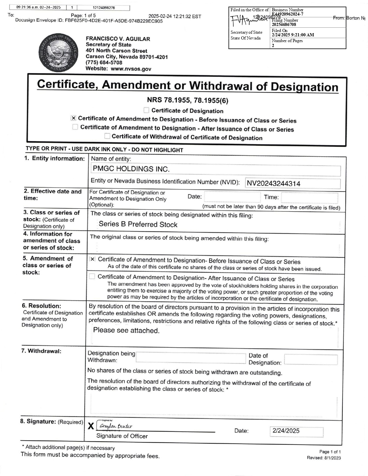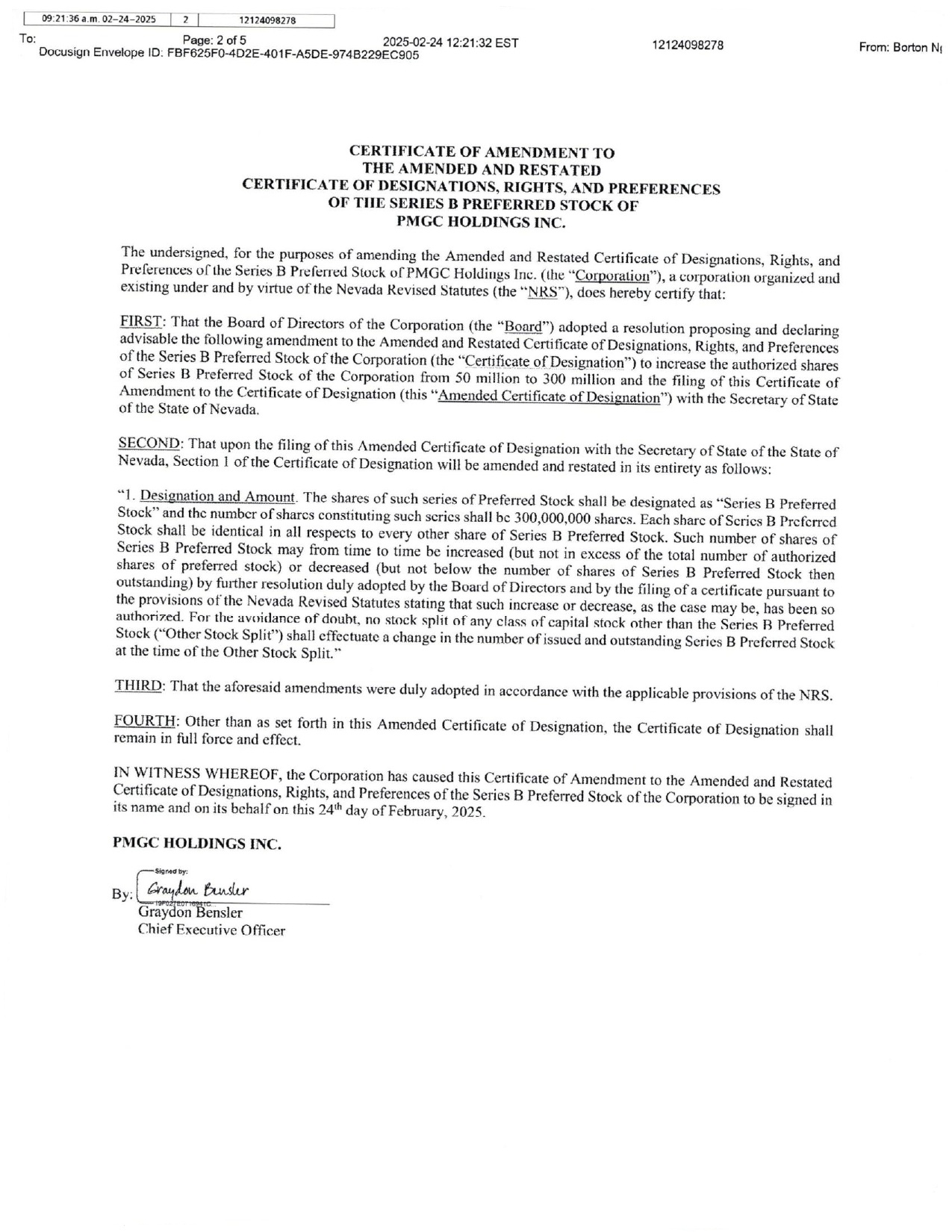 To: Page: 2 of 5 2025 - 02 - 24 12:21:32 EST Douusigi4 Envelope ID. FBF625F04D2E - 401F - A5DE - 974B229EC905 12124098278 CERTIFICATE OF AMENDNlENT TO TH E AM ENDED AND RESTATED C ERTI FICAT E OF DESIGNATIONS, RIGHTS, AND PREFERENCES' O F TlIK SERIES D PREFERRED STOCK OI ι PM GC HOLDINGS INC. The undersit,ned, for the purposes of amending the Amended and Restated Certi ficaae of Designs tions, Rights, and Prefer ciices of the Sci ice B Pi ufct red Stock ‹›f PMGC Huldi rigs I nc . (the "C or poratiuii ”), a cm poi ation organized arid existing under and by vin u e ot the Ncvada Revised Statutes (the “N RS" ), docs hereby certify that : £ IRST : That the Boord of Directors of the Corporation ( the “B oard ”) adopted a resolution proposing and declaring advisable the following amendment to the Aincndcd and Restated Ccrii ficaie of Designations, Rights, and Preferences of the Series B Preferred Stock of the Corporation (the “Certificate of Designation”) to increase the authorized shares r s«i n P«r«a stock of the Corporation troin 5 0 million to 300 million and the fi ling of this Ccrti ficate of Amendment to the € ertificate o f Designation (this “A naendcd Certificate of Dcsignatioii”) with the Sccretary of State of thc Statc of Ncyada . SLCOND : That upnn the filing efl this A mended Ccrti ficate of Designation with the Secretary of State of the State of Nc'vada . Section I ot the Certj ficate of Designation wiTT be amended and restated in its entirety as £ uilows : “ 1 . Desi ination and Amount . Th e shares of such series of P referred Stock shall be designated as Series B Preferred Stock” and the number of shares constituting such scrics shall bc 300 , 000 , 000 shares . Each share of Series B Prc fcrrcd Stock shall be identical in all i aspects to ever y othet share of Series B P i eferred Stock . Such number of shares of Series B Prefcrred Stock may from time to time be increased (but not in excess ot the tota! number of authorized shares of preferrcd stock) or decreased (but not below the numbet of shares of Series B Preferred Stock then outstanding) by further i esolution duly adopted by the Boar d of Directors and by thc fi ling of a certificate pui suaiit to t)ie provi . sions o I' the Nevada Revi sed S tattites stating that such increase or decrease, as thc case may be . has been so authorized . For the avoidance of doubt . no stock spi it of any c less of capital stock other than the Series R Preferred Stuck (“Other Stock Spl it”) shrill cffectuute n chani ; c in the nuinbcr tif issued and outstanding Series B Preferred Stock at the Time of the Other Stock Split . ” THIRD : That the aforesaid amendments were duly adopted in accordance with the applicable proc is ions of the NRS . FOURTH : Other than as set forth in this Aincnded C'ertificate of Designation . the Certificate of Dcsignalion shall rema in in full force and effeci . lN WITNESS WH EItEOF, Ihe Corporation has can . sed this Certificate of Amendment to the Amended and Restated Certificate of Designations, Rights . and Preferences oI the Series B Preferred Stock of the Corporation to be signed in its name and on its behalf on this 24 " day of February, 202 S . PMGC HOLD lNGS INC. • •• ι . By. Graydon Bensler From: Borton Nl