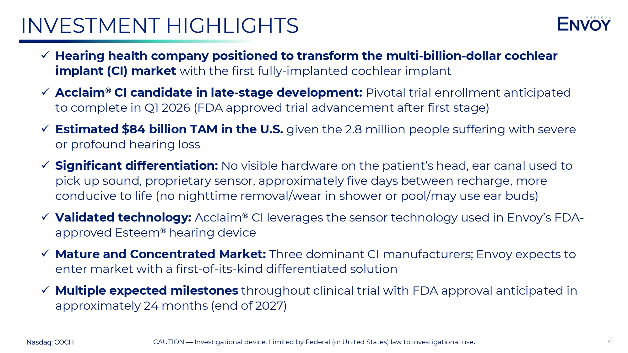 Nasdaq: COCH 2 FORWARD LOOKING STATEMENTS This presentation includes “forward - looking statements” within the meaning of the “safe harbor” provisions of the United States Private Securities Litigation Reform Act of 1995. Forward - Looking statements may be identified by the use of words such as “estimate,” “plan,” “project,” “forecast,” “intend,” “will,” “expect,” “anticipate,” “believe,” “seek,” “target” or other sim ila r expressions that predict or indicate future events or trends or that are not statements of historical matters, but the abse nce of these words does not mean that a statement is not forward - looking. Such statements may include, but are not limited to, statements reg arding the expectations of Envoy Medical concerning the outlook for its business, productivity, plans and goals for future operational improvements and capital investments; the timing and results of IRB approvals, site documents, logistics or activ ati ons, enrollments, follow - up visits, data, and clinical trials of the Acclaim CI, and the participation or any changes in participation of any subjects, institutions or healthcare professionals in such trials; the Acclaim CI being the first to mar ket fully implanted cochlear implant; the safety, performance, and market acceptance of the Acclaim CI; future market conditions or economic performance and developments in the capital and credit markets; the effect of proposed legislation on Medicare and i nsu rance reimbursement for the Esteem device and the impact of any such change to reimbursement policy on the business and financial results of Envoy Medical, and any information concerning possible or assumed future operations of Envo y M edical. The forward - looking statements contained in this Presentation reflect Envoy Medical’s current views about future events and are subject to numerous known and unknown risks, uncertainties, assumptions and changes in circumstances that may cau se its actual results to differ significantly from those expressed in any forward - looking statement. Envoy Medical does not guarantee that the events described will happen as described (or that they will happen at all). These forward - looking statem ents are subject to a number of risks and uncertainties, including, but not limited to changes in the market price of shares of Envoy Medical’s Class A Common Stock; changes in or removal of Envoy Medical’s shares inclusion in any index; Envoy Medical’s su ccess in retaining or recruiting, or changes required in, its officers, key employees or directors; unpredictability in the medical device industry, the regulatory process to approve medical devices, and the clinical development process of Envoy Med ica l products; competition in the medical device industry, and the failure to introduce new products and services in a timely manner or at competitive prices to compete successfully against competitors; disruptions in relationships with Envoy Medical’ s s uppliers, or disruptions in Envoy Medical’s own production capabilities for some of the key components and materials of its products; changes in the need for capital and the availability of financing and capital to fund these needs; changes in inter est rates or rates of inflation; legal, regulatory and other proceedings could be costly and time - consuming to defend; changes in applicable laws or regulations, or the application thereof on Envoy Medical; a loss of any of Envoy Medical’s key intellectua l p roperty rights or failure to adequately protect intellectual property rights; the effects of catastrophic events, including w ar, terrorism and other international conflicts; and other risks and uncertainties set forth in the section entitled “Risk Factor s” and “Cautionary Note Regarding Forward Looking Statements” in the Annual Report on Form 10 - K filed by Envoy Medical on March 31, 2025, and in other reports Envoy Medical files, with the SEC. If any of these risks materialize or Envoy Medical’s assump tio ns prove incorrect, actual results could differ materially from the results implied by these forward - looking statements. While forward - looking statements reflect Envoy Medical’s good faith beliefs, they are not guarantees of future performance. Envoy Medi cal disclaims any obligation to publicly update or revise any forward - looking statement to reflect changes in underlying assumptions or factors, new information, data or methods, future events or other changes after the date of this presentation, ex cept as required by applicable law. You should not place undue reliance on any forward - looking statements, which are based only on information currently available to Envoy Medical. No representations or warranties expressed or implied are given in, or in respect of, this Presentation. Industry and market dat a used in this Presentation have been obtained from third - party industry publication and sources as well as from research reports prepared for other purposes. Envoy Medical has not independently verified the data contained from these sources and c ann ot assure you of the data’s accuracy or completeness. This data is subject to change. Recipients of this Presentation are not to constitute its contents, or any prior or subsequent communications from or with Envoy or its representatives as invest men t, legal or tax advice. In addition, this Presentation does not purport to be all - inclusive or to contain all of the information that may be required to make a full analysis of Envoy Medical. Recipients of this Presentation should each make their own evaluati on of Envoy Medical and of the relevance and adequacy of the information and should make such other investigations as they deem necessary. Market, ranking and industry data used throughout this Presentation, including statements regarding market size, are based on in dustry sources and the good faith estimates of Envoy’s manageme