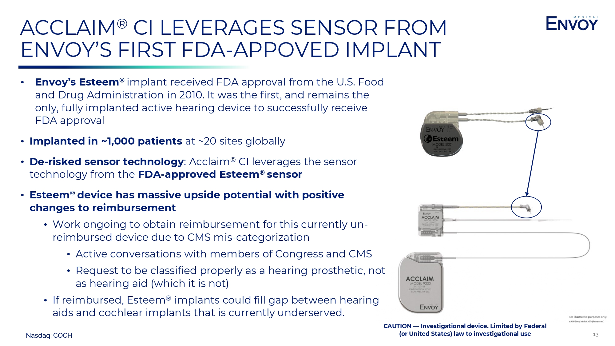 Nasdaq: COCH 12 FIRST - OF - ITS - KIND FULLY IMPLANTED COCHLEAR IMPLANT DISCREET • No need for externally worn components • Designed to use the ear to pick up sound DEPENDABLE • Designed to allow 24/7 hearing • For use in many environments and activities EASE OF USE • No expensive external sound processors to replace when lost or damaged, battery replaceable • Recharge every ~5 days vs daily charging • Replace battery once every ~10 years • No magnets. Designed to be MRI compatible* *MRI testing and compatibility not yet determined. CAUTION — Investigational device. Limited by Federal (or United States) law to investigational use