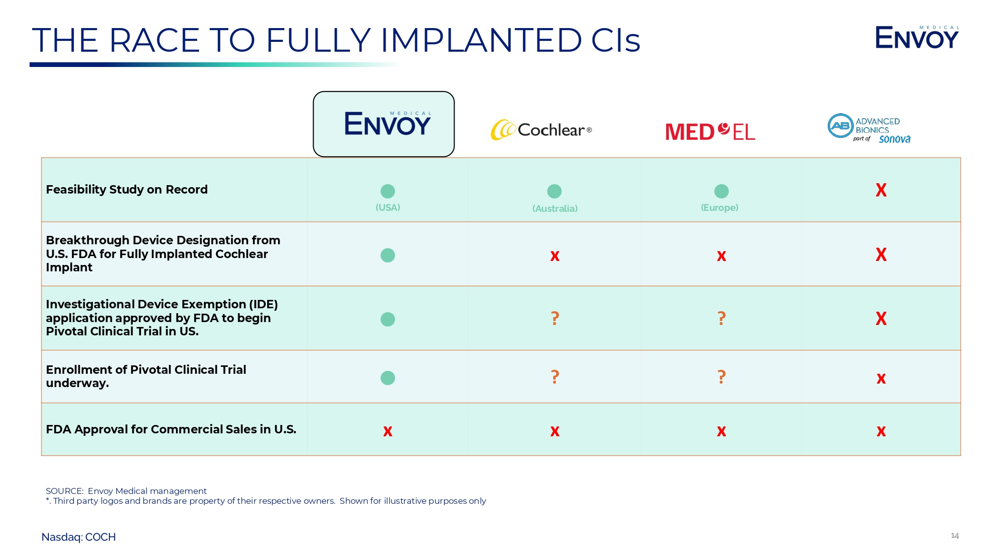 Nasdaq: COCH 13 ACCLAIM ® CI LEVERAGES SENSOR FROM ENVOY’S FIRST FDA - APPOVED IMPLANT • Envoy’s Esteem ® implant received FDA approval from the U.S. Food and Drug Administration in 2010. It was the first, and remains the only, fully implanted active hearing device to successfully receive FDA approval • Implanted in ~1,000 patients at ~20 sites globally • De - risked sensor technology : Acclaim ® CI leverages the sensor technology from the FDA - approved Esteem ® sensor • Esteem ® device has massive upside potential with positive changes to reimbursement • Work ongoing to obtain reimbursement for this currently un - reimbursed device due to CMS mis - categorization • Active conversations with members of Congress and CMS • Request to be classified properly as a hearing prosthetic, not as hearing aid (which it is not) • If reimbursed, Esteem ® implants could fill gap between hearing aids and cochlear implants that is currently underserved. CAUTION — Investigational device. Limited by Federal (or United States) law to investigational use