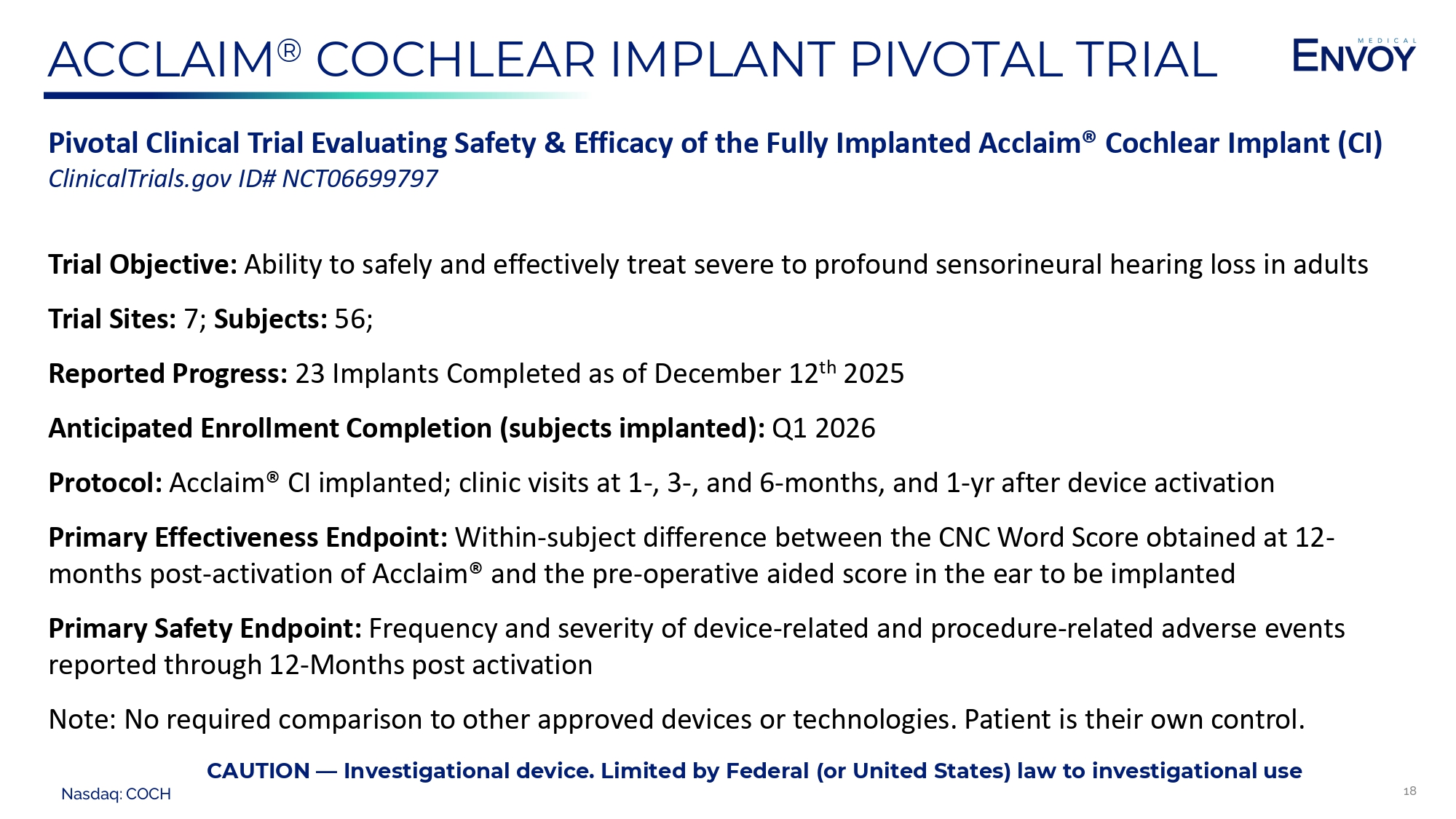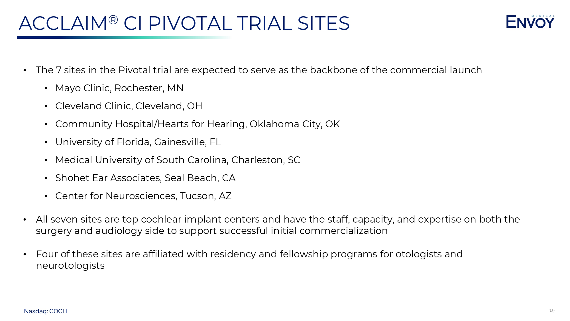 Nasdaq: COCH 18 ACCLAIM ® COCHLEAR IMPLANT PIVOTAL TRIAL Pivotal Clinical Trial Evaluating Safety & Efficacy of the Fully Implanted Acclaim® Cochlear Implant (CI) ClinicalTrials.gov ID# NCT06699797 Trial Objective: Ability to safely and effectively treat severe to profound sensorineural hearing loss in adults Trial Sites: 7; Subjects: 56; Reported Progress: 23 Implants Completed as of December 12 th 2025 Anticipated Enrollment Completion (subjects implanted): Q1 2026 Protocol: Acclaim® CI implanted; clinic visits at 1 - , 3 - , and 6 - months, and 1 - yr after device activation Primary Effectiveness Endpoint: Within - subject difference between the CNC Word Score obtained at 12 - months post - activation of Acclaim® and the pre - operative aided score in the ear to be implanted Primary Safety Endpoint: Frequency and severity of device - related and procedure - related adverse events reported through 12 - Months post activation Note: No required comparison to other approved devices or technologies. Patient is their own control. CAUTION — Investigational device. Limited by Federal (or United States) law to investigational use