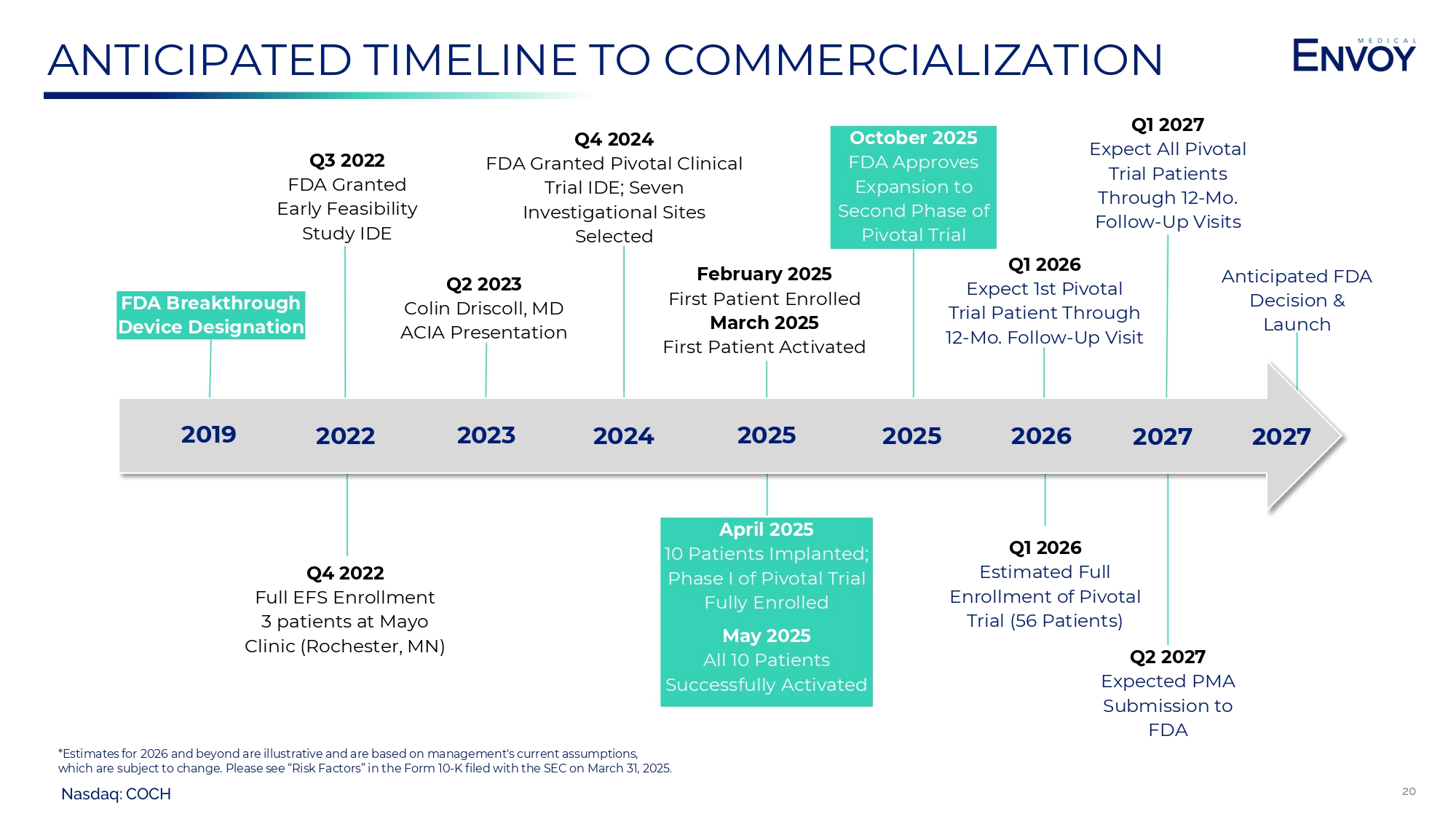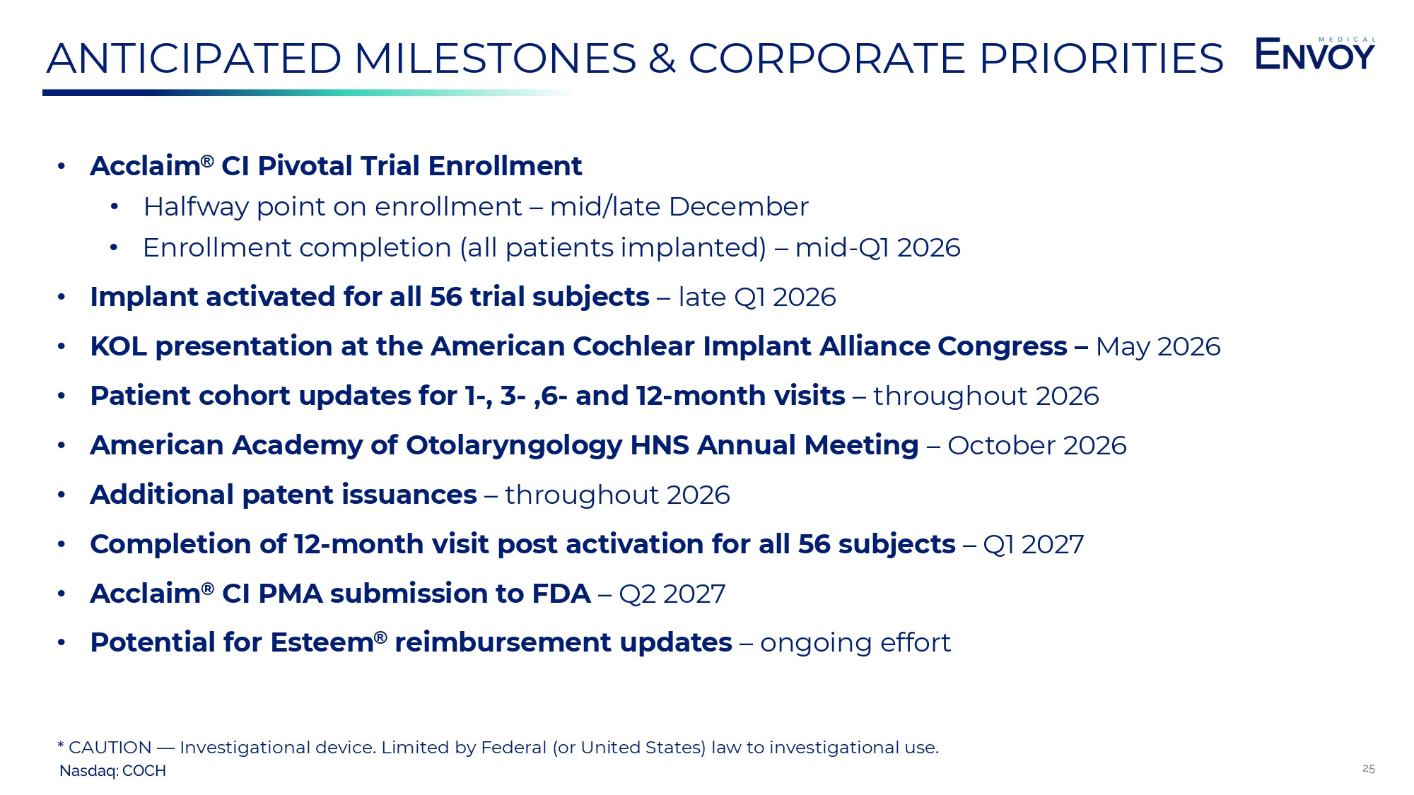 Nasdaq: COCH 25 ANTICIPATED MILESTONES & CORPORATE PRIORITIES ‡ ƬƬǼƏǣȅ Š  !X  ¨ǣɮȒɎƏǼ  ÁȸǣƏǼ  0ȇȸȒǼǼȅƺȇɎ  ‡ RƏǼǔɯƏɵ  ȵȒǣȇɎ  Ȓȇ  ƺȇȸȒǼǼȅƺȇɎ  ٫  ȅǣƳٖǼƏɎƺ  (ƺƬƺȅƫƺȸ ‡ 0ȇȸȒǼǼȅƺȇɎ  ƬȒȅȵǼƺɎǣȒȇ  ٢ƏǼǼ  ȵƏɎǣƺȇɎɀ  ǣȅȵǼƏȇɎƺƳ٣  ٫  ȅǣƳ ٮ ª ׏  א׎אה ‡ XȅȵǼƏȇɎ  ƏƬɎǣɮƏɎƺƳ  ǔȒȸ  ƏǼǼ  דה  ɎȸǣƏǼ  ɀɖƫǴƺƬɎɀ  ٫  ǼƏɎƺ  ª ׏  א׎אה ‡ k…n  ȵȸƺɀƺȇɎƏɎǣȒȇ  ƏɎ  Ɏǝƺ  ȅƺȸǣƬƏȇ  !ȒƬǝǼƺƏȸ  XȅȵǼƏȇɎ  ǼǼǣƏȇƬƺ  !ȒȇǕȸƺɀɀ  ٫  xƏɵ  א׎אה  ‡ ¨ƏɎǣƺȇɎ  ƬȒǝȒȸɎ  ɖȵƳƏɎƺɀ  ǔȒȸ  ׏ ٮ ً  ב ٮ  ً ה ٮ  ƏȇƳ  ׏א ٮ ȅȒȇɎǝ  ɮǣɀǣɎɀ  ٫  ɎǝȸȒɖǕǝȒɖɎ  א׎אה ‡ ȅƺȸǣƬƏȇ  ƬƏƳƺȅɵ  Ȓǔ  …ɎȒǼƏȸɵȇǕȒǼȒǕɵ  Rz³  ȇȇɖƏǼ  xƺƺɎǣȇǕ  ٫  …ƬɎȒƫƺȸ  א׎אה ‡ ƳƳǣɎǣȒȇƏǼ  ȵƏɎƺȇɎ  ǣɀɀɖƏȇƬƺɀ  ٫  ɎǝȸȒɖǕǝȒɖɎ  א׎אה ‡ !ȒȅȵǼƺɎǣȒȇ  Ȓǔ  ׏א ٮ ȅȒȇɎǝ  ɮǣɀǣɎ  ȵȒɀɎ  ƏƬɎǣɮƏɎǣȒȇ  ǔȒȸ  ƏǼǼ  דה  ɀɖƫǴƺƬɎɀ  ٫  ª ׏  א׎או ‡ ƬƬǼƏǣȅ ۱  !X  ¨x  ɀɖƫȅǣɀɀǣȒȇ  ɎȒ  I(  ٫  ª א  א׎או ‡ ¨ȒɎƺȇɎǣƏǼ  ǔȒȸ  0ɀɎƺƺȅ Š  ȸƺǣȅƫɖȸɀƺȅƺȇɎ  ɖȵƳƏɎƺɀ  ٫  ȒȇǕȒǣȇǕ  ƺǔǔȒȸɎ * CAUTION — Investigational device. Limited by Federal (or United States) law to investigational use.