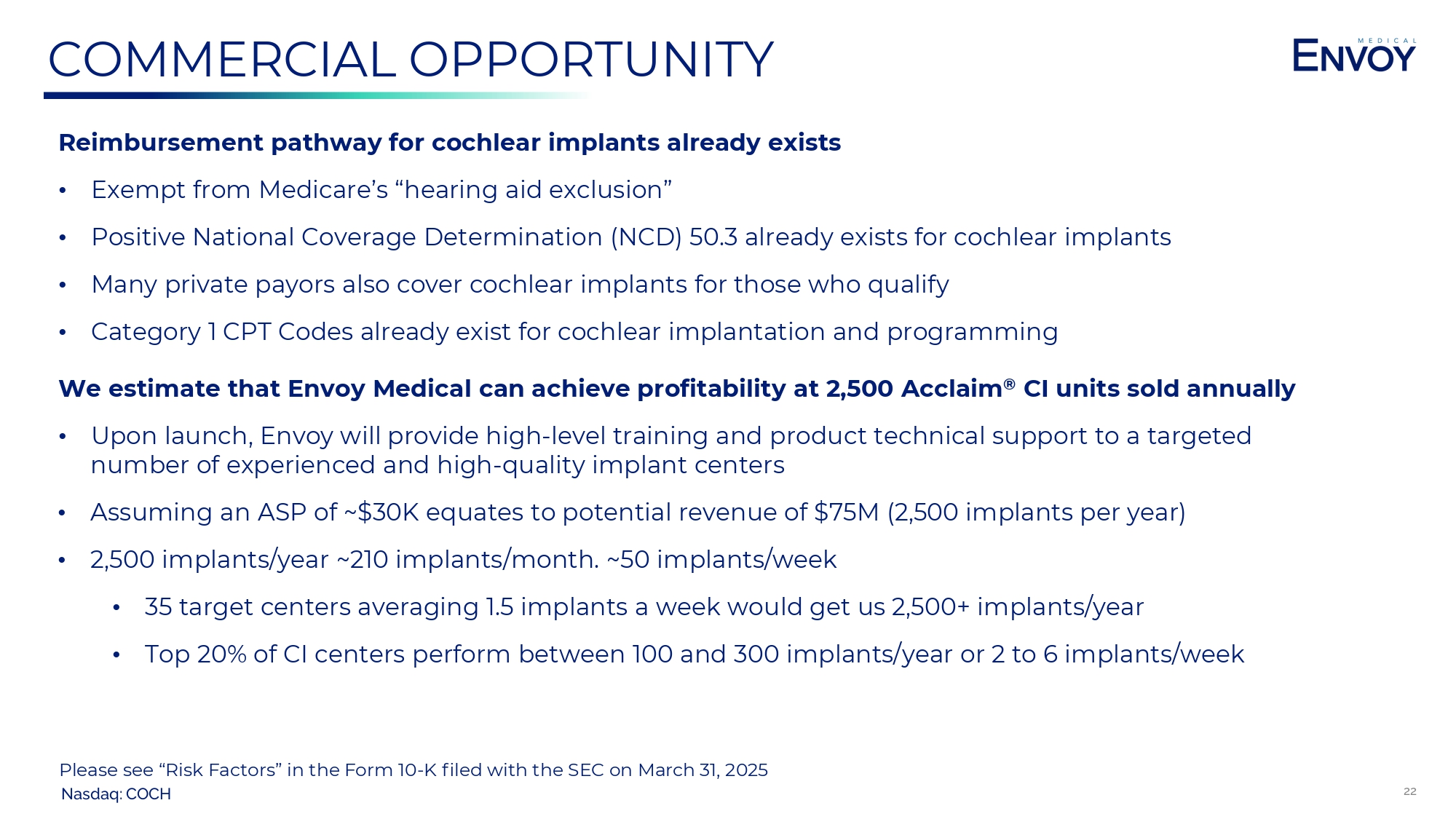 Nasdaq: COCH 21 TARGET SITES FOR IMPLANTATION AT LAUNCH 35 target launch sites include: • ACCLAIM CI ® pivotal trial sites • Envoy’s Cochlear Implant Advisory Board (CIAB) Member sites • Current ESTEEM ® implant sites • New sites that have indicated high interest in ACCLAIM CI ® These 35 sites accounted for roughly 4,000 cochlear implants in 2023, or just over 13% of all cochlear implants in the US . 10 - person commercial organization needed to call on & support the 35 sites • 5 surgical • 5 audiologists Multiple Sites Individual Sites Pivotal Trial Sites