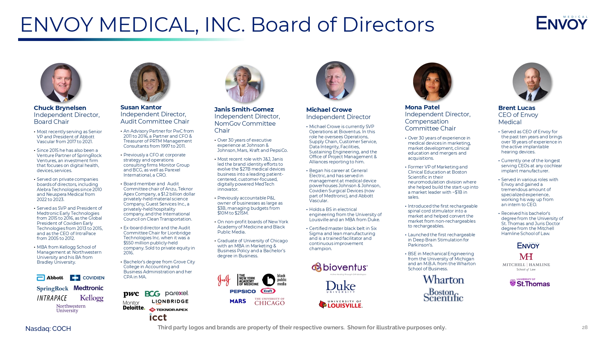 Nasdaq: COCH ENVOY MEDICAL, INC. Board of Directors hƏȇǣɀ³ȅǣɎǝ ٮ JȒȅƺɿ XȇƳƺȵƺȇƳƺȇɎ(ǣȸƺƬɎȒȸً zȒȅJȒɮ  !ȒȅȅǣɎɎƺƺ !ǝƏǣȸ ‡ …ɮƺȸ ב׎ ɵƺƏȸɀȒǔƺɴƺƬɖɎǣɮƺ ƺɴȵƺȸǣƺȇƬƺƏɎhȒǝȇɀȒȇۭ hȒǝȇɀȒȇًxƏȸɀًkȸƏǔɎƏȇƳ¨ƺȵɀǣ!Ȓِ ‡ xȒɀɎȸƺƬƺȇɎȸȒǼƺɯǣɎǝhۭhًhƏȇǣɀ ǼƺƳɎǝƺƫȸƏȇƳǣƳƺȇɎǣɎɵƺǔǔȒȸɎɀɎȒ ƺɮȒǼɮƺɎǝƺڟ או ȅƺƳǣƬƏǼƳƺɮǣƬƺɀ ƫɖɀǣȇƺɀɀǣȇɎȒƏǼƺƏƳǣȇǕȵƏɎǣƺȇɎ ٮ ƬƺȇɎƺȸƺƳًƬɖɀɎȒȅƺȸ ٮ ǔȒƬɖɀƺƳً ƳǣǕǣɎƏǼǼɵȵȒɯƺȸƺƳxƺƳÁƺƬǝ ǣȇȇȒɮƏɎȒȸِ ‡ ¨ȸƺɮǣȒɖɀǼɵƏƬƬȒɖȇɎƏƫǼƺ¨ۭn ȒɯȇƺȸȒǔƫɖɀǣȇƺɀɀƺɀƏɀǼƏȸǕƺƏɀ ڟ ב ًȅƏȇƏǕǣȇǕƫɖƳǕƺɎɀǔȸȒȅ ڟ ׏׎ xɎȒڟ א׏ד xِ ‡ …ȇȇȒȇ ٮ ȵȸȒˡɎƫȒƏȸƳɀȒǔzƺɯçȒȸǸ ƬƏƳƺȅɵȒǔxƺƳǣƬǣȇƺƏȇƳ ǼƏƬǸ ¨ɖƫǼǣƬxƺƳǣƏِ ‡ JȸƏƳɖƏɎƺȒǔÈȇǣɮƺȸɀǣɎɵȒǔ!ǝǣƬƏǕȒ ɯǣɎǝƏȇx ǣȇxƏȸǸƺɎǣȇǕۭ ɖɀǣȇƺɀɀ¨ȒǼǣƬɵƏȇƳƏ ƏƬǝƺǼȒȸ ټ ɀ ƳƺǕȸƺƺǣȇ ɖɀǣȇƺɀɀِ Susan Kantor Independent Director, Audit Committee Chair • An Advisory Partner for PwC from 2011 to 2016, a Partner and CFO & Treasurer of PRTM Management Consultants from 1997 to 2011. • Previously a CFO at corporate strategy and operations consulting firms Monitor Group and BCG, as well as Parexel International, a CRO. • Board member and Audit Committee chair of Anzu, Teknor Apex Company, a $1.2 billion dollar privately - held material science Company, Guest Services Inc., a privately - held hospitality company, and the International Council on Clean Transportation. • Ex - board director and the Audit Committee Chair for Lionbridge Technologies Inc. when it was a $550 million publicly - held company. Sold to private equity in 2016. • Bachelor’s degree from Grove City College in Accounting and Business Administration and her CPA in MA. Mona Patel Independent Director, Compensation Committee Chair • Over 30 years of experience in medical devices in marketing, market development, clinical education and mergers and acquisitions. • Former VP of Marketing and Clinical Education at Boston Scientific in their neuromodulation division where she helped build the start - up into a market leader with ~$1B in sales. • Introduced the first rechargeable spinal cord stimulator into a market and helped convert the market from non - rechargeables to rechargeables. • Launched the first rechargeable in Deep Brain Stimulation for Parkinson’s. • BSE in Mechanical Engineering from the University of Michigan and an M.B.A. from the Wharton School of Business. Michael Crowe Independent Director • Michael Crowe is currently SVP Operations at Bioventus. In this role he oversees Operations, Supply Chain, Customer Service, Data Integrity, Facilities, Sustaining Engineering, and the Office of Project Management & Alliances reporting to him. • Began his career at General Electric, and has served in management at medical device powerhouses Johnson & Johnson, Covidien Surgical Devices (now part of Medtronic), and Abbott Vascular. • Holds a BS in electrical engineering from the University of Louisville and an MBA from Duke. • Certified master black belt in Six Sigma and lean manufacturing and is a trained facilitator and continuous improvement champion. Brent Lucas CEO of Envoy Medical • Served as CEO of Envoy for the past ten years and brings over 18 years of experience in the active implantable hearing devices. • Currently one of the longest serving CEOs at any cochlear implant manufacturer. • Served in various roles with Envoy and gained a tremendous amount of specialized experience, working his way up from an intern to CEO. • Received his bachelor’s degree from the University of St. Thomas and Juris Doctor degree from the Mitchell Hamline School of Law. Chuck Brynelsen Independent Director, Board Chair • Most recently serving as Senior VP and President of Abbott Vascular from 2017 to 2021. • Since 2015 he has also been a Venture Partner of SpringRock Ventures, an investment firm that focuses on digital health, devices, services. • Served on private companies boards of directors, including Alebra Technologies since 2010 and Neuspera Medical from 2022 to 2023. • Served as SVP and President of Medtronic Early Technologies from 2015 to 2016, as the Global President of Covidien Early Technologies from 2013 to 2015, and as the CEO of IntraPace from 2005 to 2012. • MBA from Kellogg School of Management at Northwestern University and his BA from Bradley University. 28 Third party logos and brands are property of their respective owners. Shown for illustrative purposes only.