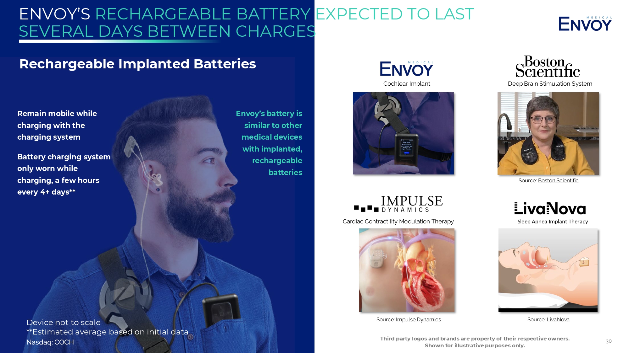 Nasdaq: COCH 30 ENVOY’S RECHARGEABLE BATTERY EXPECTED TO LAST SEVERAL DAYS BETWEEN CHARGES Remain mobile while charging with the charging system Battery charging system only worn while charging, a few hours every 4+ days** 0ȇɮȒɵ ټ ɀ ƫƏɎɎƺȸɵǣɀ ɀǣȅǣǼƏȸɎȒȒɎǝƺȸ ȅƺƳǣƬƏǼƳƺɮǣƬƺɀ ɯǣɎǝǣȅȵǼƏȇɎƺƳً ȸƺƬǝƏȸǕƺƏƫǼƺ ƫƏɎɎƺȸǣƺɀ Rechargeable Implanted Batteries Source: Boston Scientific Deep Brain Stimulation System Sleep Apnea Implant Therapy Source: LivaNova Source: Impulse Dynamics Cochlear Implant åƂĈijåā΅  ŜœƖƂåāƖijʼnijƖƼ΅ i ŜĈƞʼnåƖijŜœ΅ ¯ ĮĎƂåſƼ Third party logos and brands are property of their respective owners. Shown for illustrative purposes only. Device not to scale **Estimated average based on initial data