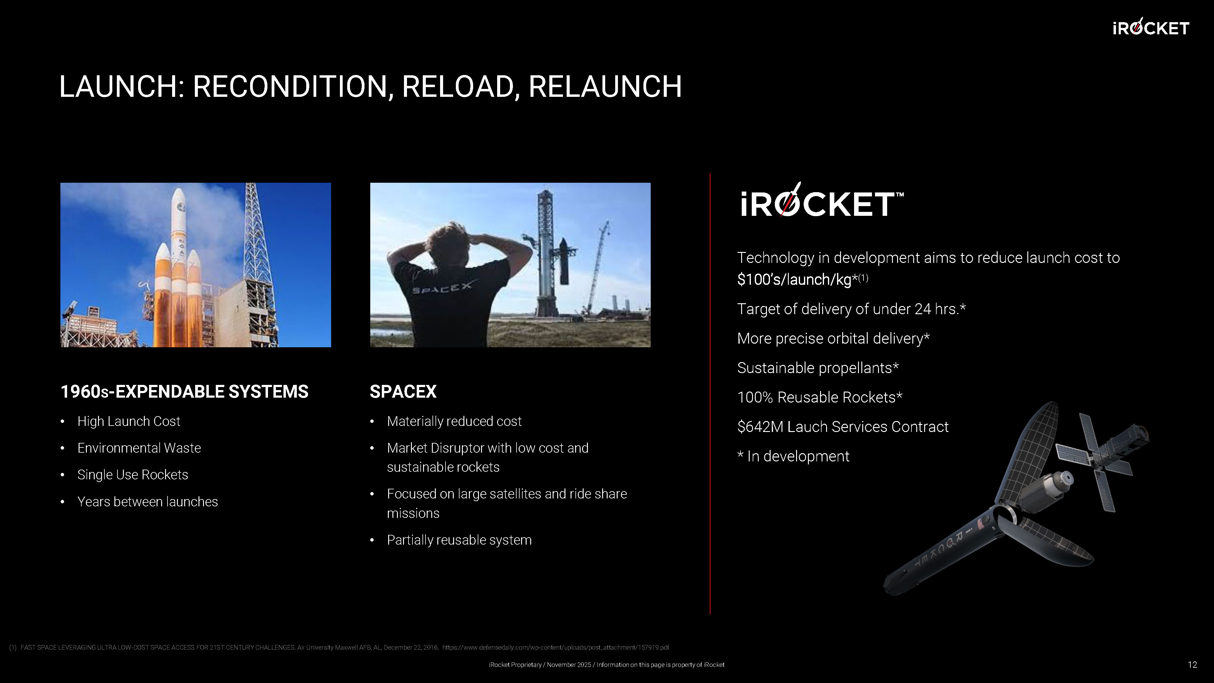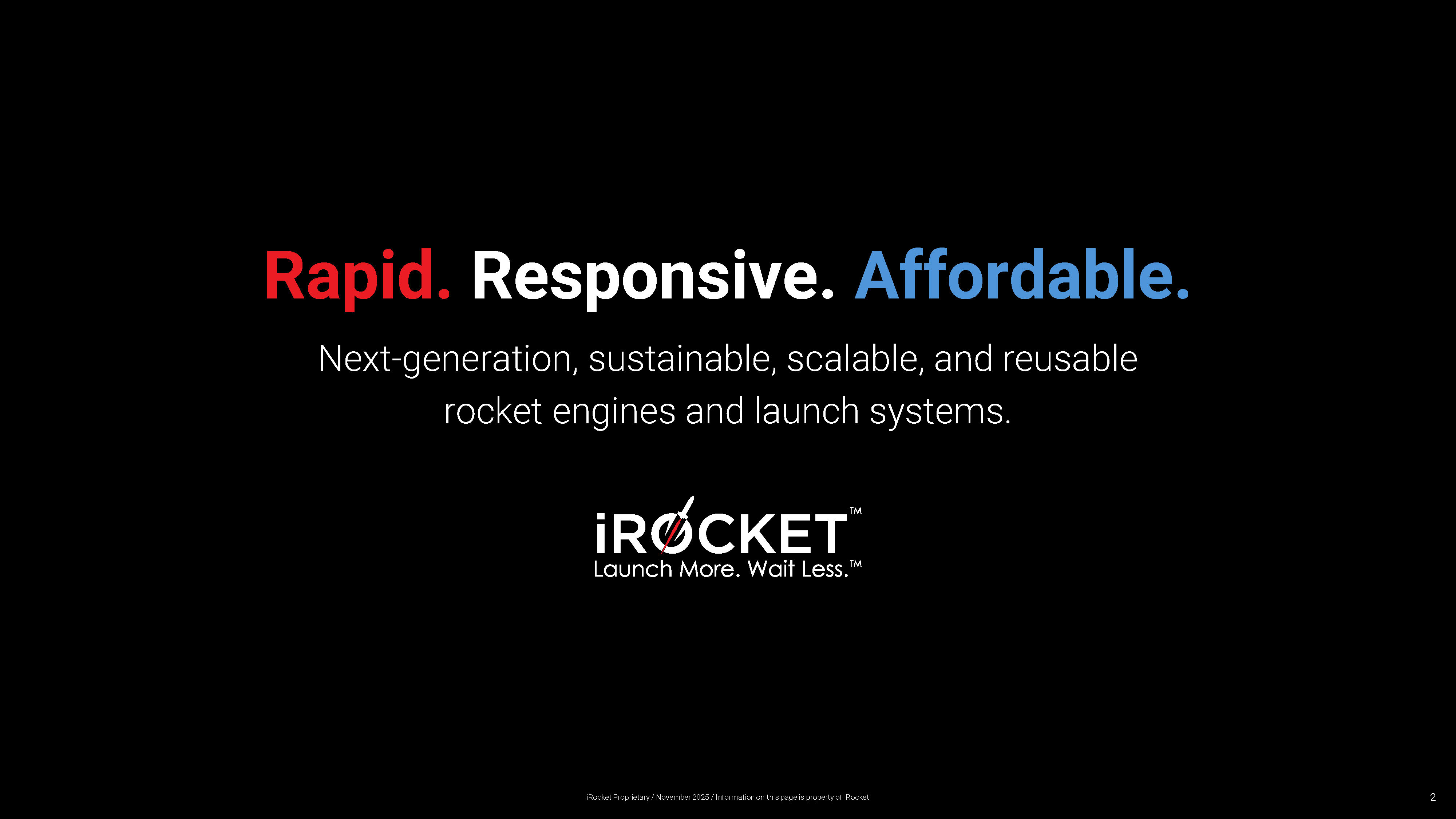 Rapid. Responsive. Affordable. Next - generation, sustainable, scalable, and reusable rocket engines and launch systems. 2 iRocket Proprietary / November 2025 / Information on this page is property of iRocket