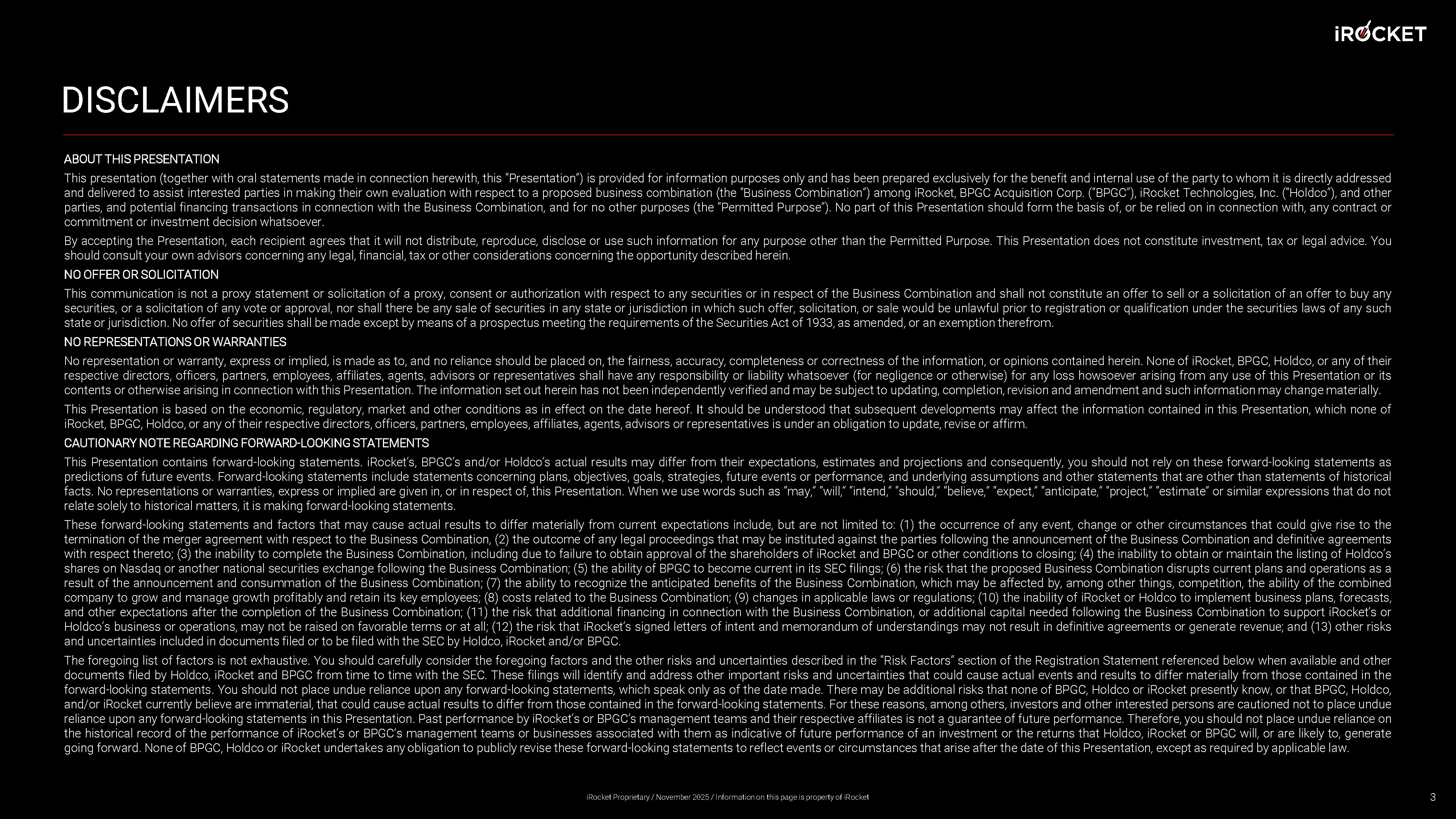 ABOUT THIS PRESENTATION This presentation (together with oral statements made in connection herewith, this “Presentation”) is provided for information purposes only and has been prepared exclusively for the benefit and internal use of the party to whom it is directly addressed and delivered to assist interested parties in making their own evaluation with respect to a proposed business combination (the “Business Combination”) among iRocket, BPGC Acquisition Corp . (“BPGC”), iRocket Technologies, Inc . (“Holdco”), and other parties, and potential financing transactions in connection with the Business Combination, and for no other purposes (the “Permitted Purpose”) . No part of this Presentation should form the basis of, or be relied on in connection with, any contract or commitment or investment decision whatsoever . By accepting the Presentation, each recipient agrees that it will not distribute, reproduce, disclose or use such information for any purpose other than the Permitted Purpose . This Presentation does not constitute investment, tax or legal advice . You should consult your own advisors concerning any legal, financial, tax or other considerations concerning the opportunity described herein . NO OFFER OR SOLICITATION This communication is not a proxy statement or solicitation of a proxy, consent or authorization with respect to any securities or in respect of the Business Combination and shall not constitute an offer to sell or a solicitation of an offer to buy any securities, or a solicitation of any vote or approval, nor shall there be any sale of securities in any state or jurisdiction in which such offer, solicitation, or sale would be unlawful prior to registration or qualification under the securities laws of any such state or jurisdiction . No offer of securities shall be made except by means of a prospectus meeting the requirements of the Securities Act of 1933 , as amended, or an exemption therefrom . NO REPRESENTATIONS OR WARRANTIES No representation or warranty, express or implied, is made as to, and no reliance should be placed on, the fairness, accuracy, completeness or correctness of the information, or opinions contained herein . None of iRocket , BPGC, Holdco, or any of their respective directors, officers, partners, employees, affiliates, agents, advisors or representatives shall have any responsibility or liability whatsoever (for negligence or otherwise) for any loss howsoever arising from any use of this Presentation or its contents or otherwise arising in connection with this Presentation . The information set out herein has not been independently verified and may be subject to updating, completion, revision and amendment and such information may change materially . This Presentation is based on the economic, regulatory, market and other conditions as in effect on the date hereof . It should be understood that subsequent developments may affect the information contained in this Presentation, which none of iRocket, BPGC, Holdco, or any of their respective directors, officers, partners, employees, affiliates, agents, advisors or representatives is under an obligation to update, revise or affirm . CAUTIONARY NOTE REGARDING FORWARD - LOOKING STATEMENTS This Presentation contains forward - looking statements . iRocket’s, BPGC’s and/or Holdco’s actual results may differ from their expectations, estimates and projections and consequently, you should not rely on these forward - looking statements as predictions of future events . Forward - looking statements include statements concerning plans, objectives, goals, strategies, future events or performance, and underlying assumptions and other statements that are other than statements of historical facts . No representations or warranties, express or implied are given in, or in respect of, this Presentation . When we use words such as “may,” “will,” “intend,” “should,” “believe,” “expect,” “anticipate,” “project,” “estimate” or similar expressions that do not relate solely to historical matters, it is making forward - looking statements . These forward - looking statements and factors that may cause actual results to differ materially from current expectations include, but are not limited to : ( 1 ) the occurrence of any event, change or other circumstances that could give rise to the termination of the merger agreement with respect to the Business Combination, ( 2 ) the outcome of any legal proceedings that may be instituted against the parties following the announcement of the Business Combination and definitive agreements with respect thereto ; ( 3 ) the inability to complete the Business Combination, including due to failure to obtain approval of the shareholders of iRocket and BPGC or other conditions to closing ; ( 4 ) the inability to obtain or maintain the listing of Holdco’s shares on Nasdaq or another national securities exchange following the Business Combination ; ( 5 ) the ability of BPGC to become current in its SEC filings ; ( 6 ) the risk that the proposed Business Combination disrupts current plans and operations as a result of the announcement and consummation of the Business Combination ; ( 7 ) the ability to recognize the anticipated benefits of the Business Combination, which may be affected by, among other things, competition, the ability of the combined company to grow and manage growth profitably and retain its key employees ; ( 8 ) costs related to the Business Combination ; ( 9 ) changes in applicable laws or regulations ; ( 10 ) the inability of iRocket or Holdco to implement business plans, forecasts, and other expectations after the completion of the Business Combination ; ( 11 ) the risk that additional financing in connection with the Business Combination, or additional capital needed following the Business Combination to support iRocket’s or Holdco’s business or operations, may not be raised on favorable terms or at all ;