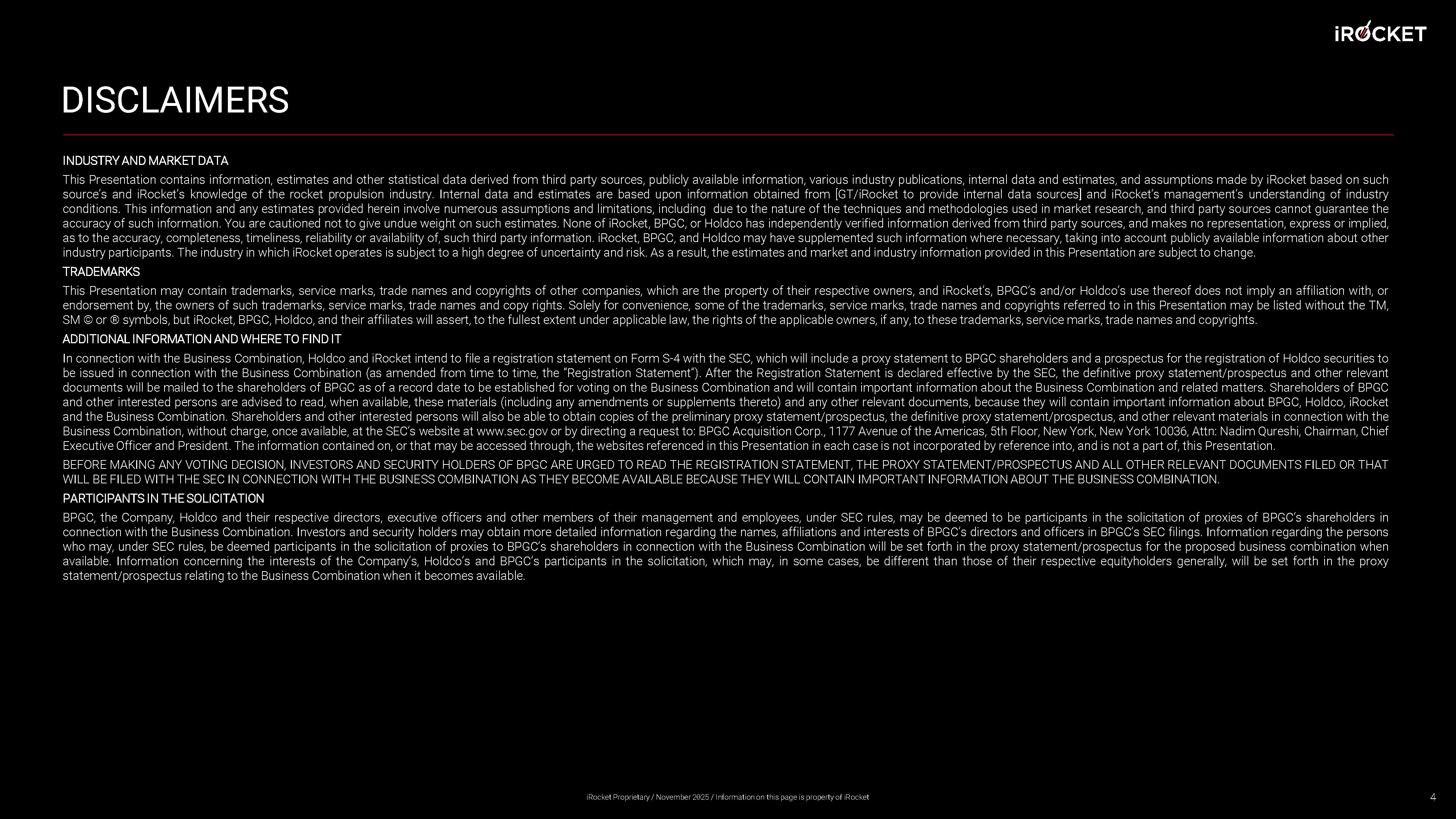 DISCLAIMERS INDUSTRY AND MARKET DATA This Presentation contains information, estimates and other statistical data derived from third party sources, publicly available information, various industry publications, internal data and estimates, and assumptions made by iRocket based on such source’s and iRocket’s knowledge of the rocket propulsion industry . Internal data and estimates are based upon information obtained from [GT/iRocket to provide internal data sources] and iRocket’s management’s understanding of industry conditions . This information and any estimates provided herein involve numerous assumptions and limitations, including due to the nature of the techniques and methodologies used in market research, and third party sources cannot guarantee the accuracy of such information . You are cautioned not to give undue weight on such estimates . None of iRocket , BPGC, or Holdco has independently verified information derived from third party sources, and makes no representation, express or implied, as to the accuracy, completeness, timeliness, reliability or availability of, such third party information . iRocket , BPGC, and Holdco may have supplemented such information where necessary, taking into account publicly available information about other industry participants . The industry in which iRocket operates is subject to a high degree of uncertainty and risk . As a result, the estimates and market and industry information provided in this Presentation are subject to change . TRADEMARKS This Presentation may contain trademarks, service marks, trade names and copyrights of other companies, which are the property of their respective owners, and iRocket’s, BPGC’s and/or Holdco’s use thereof does not imply an affiliation with, or endorsement by, the owners of such trademarks, service marks, trade names and copy rights . Solely for convenience, some of the trademarks, service marks, trade names and copyrights referred to in this Presentation may be listed without the TM, SM © or ® symbols, but iRocket, BPGC, Holdco, and their affiliates will assert, to the fullest extent under applicable law, the rights of the applicable owners, if any, to these trademarks, service marks, trade names and copyrights . ADDITIONAL INFORMATION AND WHERE TO FIND IT In connection with the Business Combination, Holdco and iRocket intend to file a registration statement on Form S - 4 with the SEC, which will include a proxy statement to BPGC shareholders and a prospectus for the registration of Holdco securities to be issued in connection with the Business Combination (as amended from time to time, the “Registration Statement”) . After the Registration Statement is declared effective by the SEC, the definitive proxy statement/prospectus and other relevant documents will be mailed to the shareholders of BPGC as of a record date to be established for voting on the Business Combination and will contain important information about the Business Combination and related matters . Shareholders of BPGC and other interested persons are advised to read, when available, these materials (including any amendments or supplements thereto) and any other relevant documents, because they will contain important information about BPGC, Holdco, iRocket and the Business Combination . Shareholders and other interested persons will also be able to obtain copies of the preliminary proxy statement/prospectus, the definitive proxy statement/prospectus, and other relevant materials in connection with the Business Combination, without charge, once available, at the SEC’s website at www . sec . gov or by directing a request to : BPGC Acquisition Corp . , 1177 Avenue of the Americas, 5 th Floor, New York, New York 10036 , Attn : Nadim Qureshi, Chairman, Chief Executive Officer and President . The information contained on, or that may be accessed through, the websites referenced in this Presentation in each case is not incorporated by reference into, and is not a part of, this Presentation . BEFORE MAKING ANY VOTING DECISION, INVESTORS AND SECURITY HOLDERS OF BPGC ARE URGED TO READ THE REGISTRATION STATEMENT, THE PROXY STATEMENT/PROSPECTUS AND ALL OTHER RELEVANT DOCUMENTS FILED OR THAT WILL BE FILED WITH THE SEC IN CONNECTION WITH THE BUSINESS COMBINATION AS THEY BECOME AVAILABLE BECAUSE THEY WILL CONTAIN IMPORTANT INFORMATION ABOUT THE BUSINESS COMBINATION . PARTICIPANTS IN THE SOLICITATION BPGC, the Company, Holdco and their respective directors, executive officers and other members of their management and employees, under SEC rules, may be deemed to be participants in the solicitation of proxies of BPGC’s shareholders in connection with the Business Combination . Investors and security holders may obtain more detailed information regarding the names, affiliations and interests of BPGC’s directors and officers in BPGC’s SEC filings . Information regarding the persons who may, under SEC rules, be deemed participants in the solicitation of proxies to BPGC’s shareholders in connection with the Business Combination will be set forth in the proxy statement/prospectus for the proposed business combination when available . Information concerning the interests of the Company’s, Holdco’s and BPGC’s participants in the solicitation, which may, in some cases, be different than those of their respective equityholders generally, will be set forth in the proxy statement/prospectus relating to the Business Combination when it becomes available . 4 iRocket Proprietary / November 2025 / Information on this page is property of iRocket
