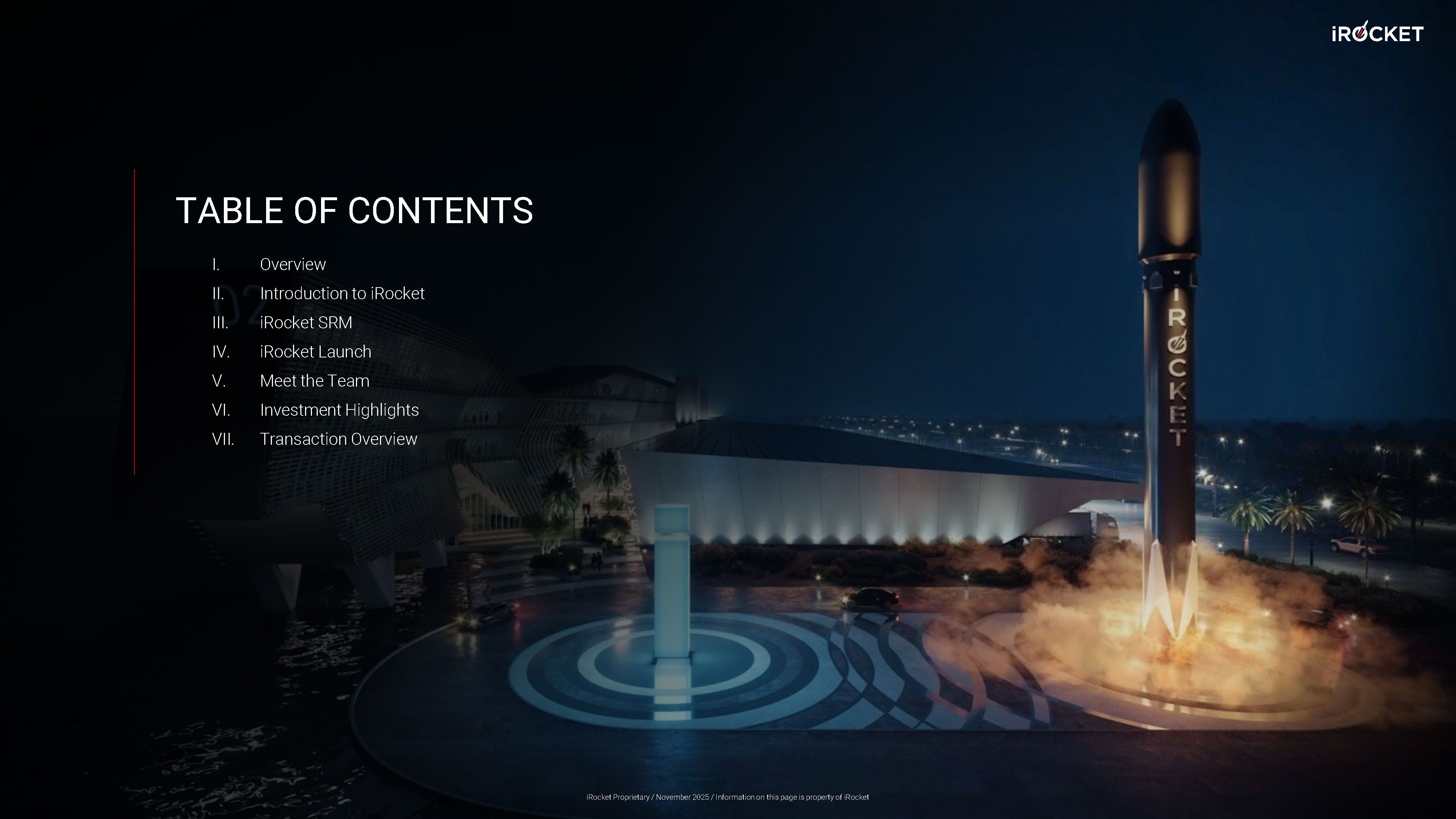 I. Overview II. Introduction to iRocket III. iRocket SRM IV. iRocket Launch V. Meet the Team VI. Investment Highlights VII. Transaction Overview TABLE OF CONTENTS iRocket Proprietary / November 2025 / Information on this page is property of iRocket