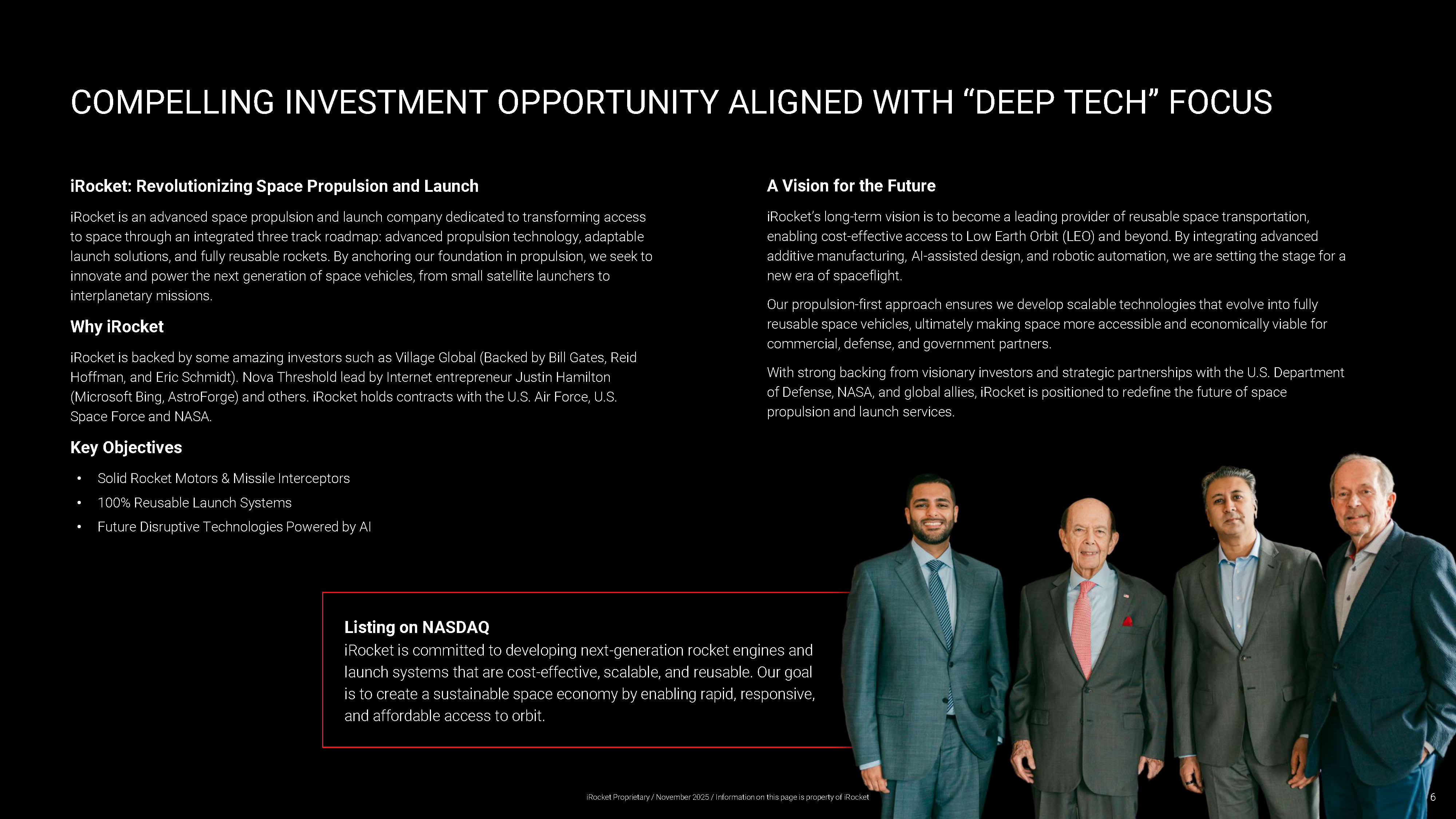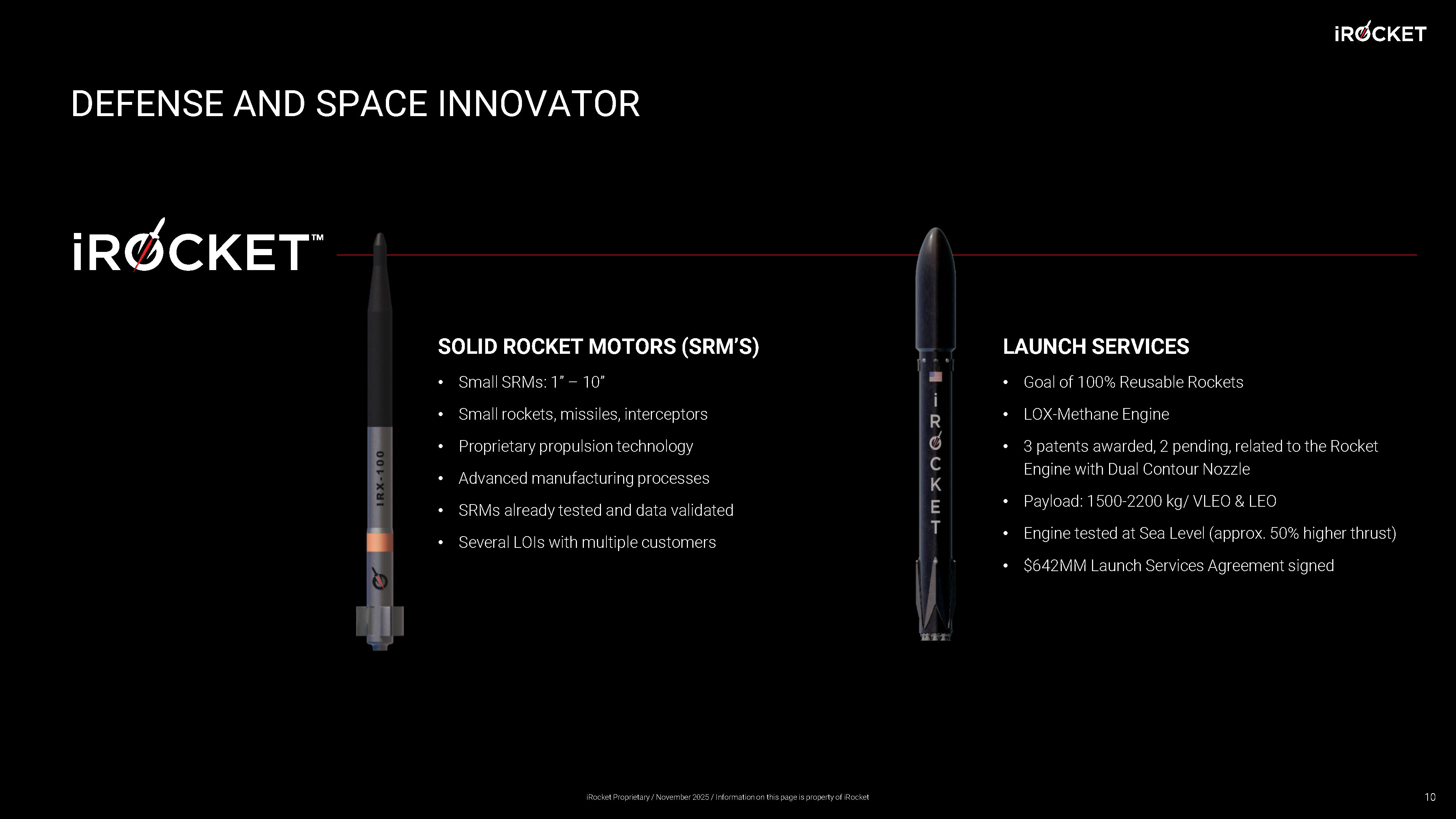 Listing on NASDAQ iRocket is committed to developing next - generation rocket engines and launch systems that are cost - effective, scalable, and reusable. Our goal is to create a sustainable space economy by enabling rapid, responsive, and affordable access to orbit. COMPELLING INVESTMENT OPPORTUNITY ALIGNED WITH “DEEP TECH” FOCUS iRocket : Revolutionizing Space Propulsion and Launch iRocket is an advanced space propulsion and launch company dedicated to transforming access to space through an integrated three track roadmap: advanced propulsion technology, adaptable launch solutions, and fully reusable rockets. By anchoring our foundation in propulsion, we seek to innovate and power the next generation of space vehicles, from small satellite launchers to interplanetary missions. Why iRocket iRocket is backed by some amazing investors such as Village Global (Backed by Bill Gates, Reid Hoffman, and Eric Schmidt). Nova Threshold lead by Internet entrepreneur Justin Hamilton (Microsoft Bing, AstroForge ) and others. iRocket holds contracts with the U.S. Air Force, U.S. Space Force and NASA. Key Objectives • Solid Rocket Motors & Missile Interceptors • 100% Reusable Launch Systems • Future Disruptive Technologies Powered by AI A Vision for the Future iRocket’s long - term vision is to become a leading provider of reusable space transportation, enabling cost - effective access to Low Earth Orbit (LEO) and beyond. By integrating advanced additive manufacturing, AI - assisted design, and robotic automation, we are setting the stage for a new era of spaceflight. Our propulsion - first approach ensures we develop scalable technologies that evolve into fully reusable space vehicles, ultimately making space more accessible and economically viable for commercial, defense, and government partners. With strong backing from visionary investors and strategic partnerships with the U.S. Department of Defense, NASA, and global allies, iRocket is positioned to redefine the future of space propulsion and launch services. 6 iRocket Proprietary / November 2025 / Information on this page is property of iRocket