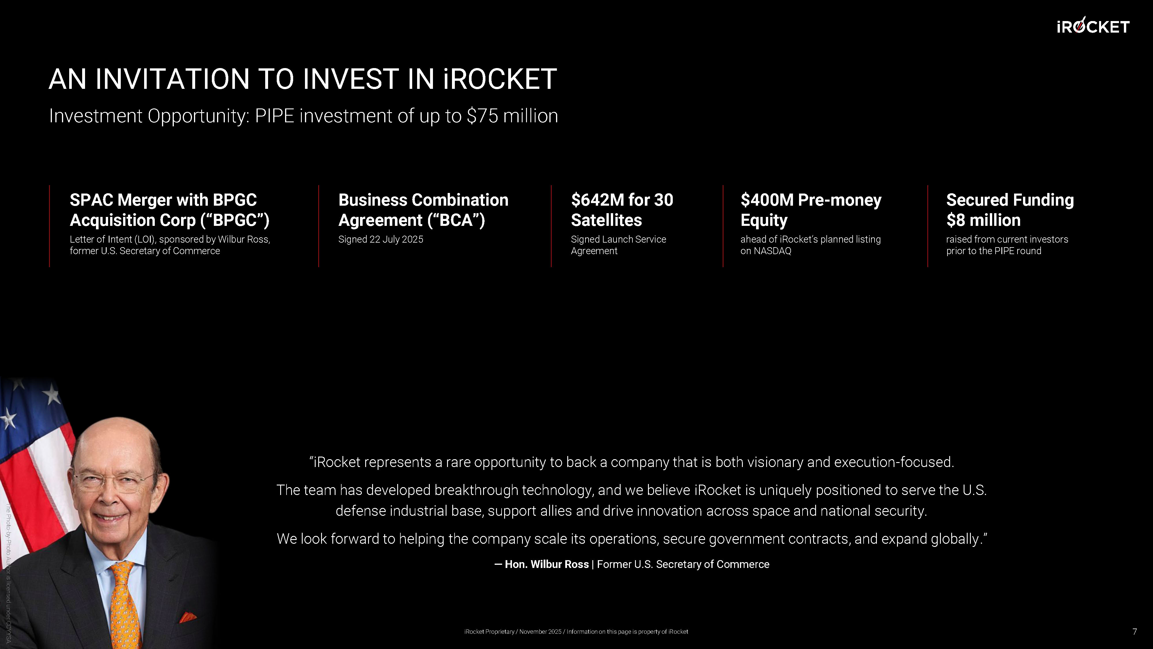 AN INVITATION TO INVEST IN i ROCKET Investment Opportunity: PIPE investment of up to $75 million “ iRocket represents a rare opportunity to back a company that is both visionary and execution - focused. The team has developed breakthrough technology, and we believe iRocket is uniquely positioned to serve the U.S. defense industrial base, support allies and drive innovation across space and national security. We look forward to helping the company scale its operations, secure government contracts, and expand globally .” — Hon. Wilbur Ross | Former U.S. Secretary of Commerce The Photo - by - Photo Author is licensed under CCYYSA. SPAC Merger with BPGC Acquisition Corp (“BPGC”) Letter of Intent (LOI), sponsored by Wilbur Ross, former U.S. Secretary of Commerce Business Combination Agreement (“BCA”) Signed 22 July 2025 $400M Pre - money Equity ahead of iRocket’s planned listing on NASDAQ Secured Funding $8 million raised from current investors prior to the PIPE round $642M for 30 Satellites Signed Launch Service Agreement 7 iRocket Proprietary / November 2025 / Information on this page is property of iRocket