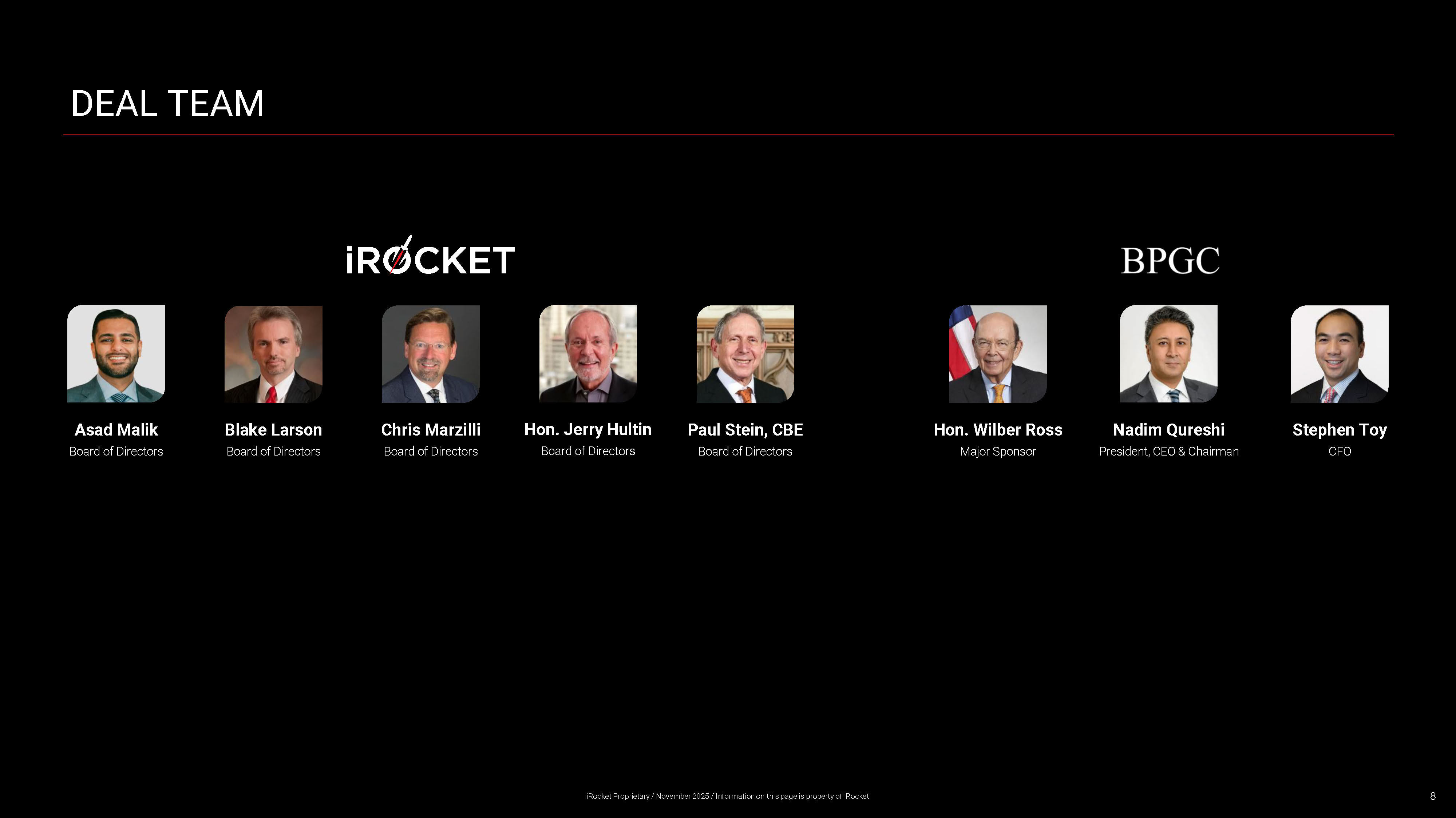 Asad Malik Board of Directors DEAL TEAM Blake Larson Board of Directors Chris Marzilli Board of Directors Hon. Jerry Hultin Board of Directors Paul Stein, CBE Board of Directors Hon. Wilber Ross Major Sponsor Nadim Qureshi President, CEO & Chairman Stephen Toy CFO 8 iRocket Proprietary / November 2025 / Information on this page is property of iRocket