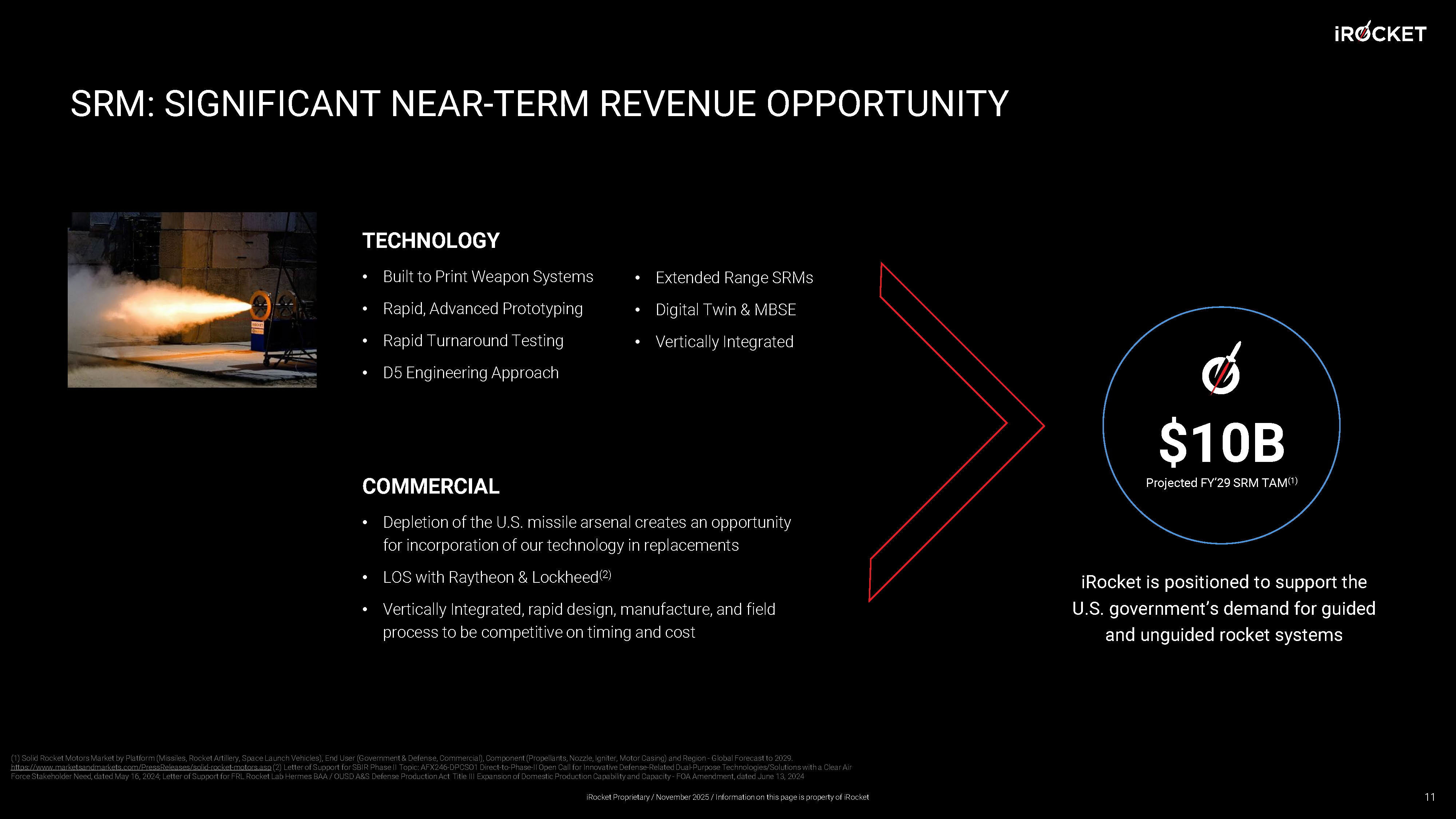 SRM: SIGNIFICANT NEAR - TERM REVENUE OPPORTUNITY iRocket is positioned to support the U.S. government’s demand for guided and unguided rocket systems $10B Projected FY’29 SRM TAM (1) TECHNOLOGY • Built to Print Weapon Systems • Rapid, Advanced Prototyping • Rapid Turnaround Testing • D5 Engineering Approach COMMERCIAL • Depletion of the U.S. missile arsenal creates an opportunity for incorporation of our technology in replacements • LOS with Raytheon & Lockheed (2) • Vertically Integrated, rapid design, manufacture, and field process to be competitive on timing and cost • Extended Range SRMs • Digital Twin & MBSE • Vertically Integrated 11 (1) Solid Rocket Motors Market by Platform (Missiles, Rocket Artillery, Space Launch Vehicles), End User (Government & Defens e, Commercial), Component (Propellants, Nozzle, Igniter, Motor Casing) and Region - Global Forecast to 2029. https://www.marketsandmarkets.com/PressReleases/solid - rocket - motors. asp (2) Letter of Support for SBIR Phase II Topic: AFX246 - DPCSO1 Direct - to - Phase - II Open Call for Innovative Defense - Related Dual - P urpose Technologies/Solutions with a Clear Air Force Stakeholder Need, dated May 16, 2024; Letter of Support for FRL Rocket Lab Hermes BAA / OUSD A&S Defense Production Act Ti tle III Expansion of Domestic Production Capability and Capacity - FOA Amendment, dated June 13, 2024 iRocket Proprietary / November 2025 / Information on this page is property of iRocket