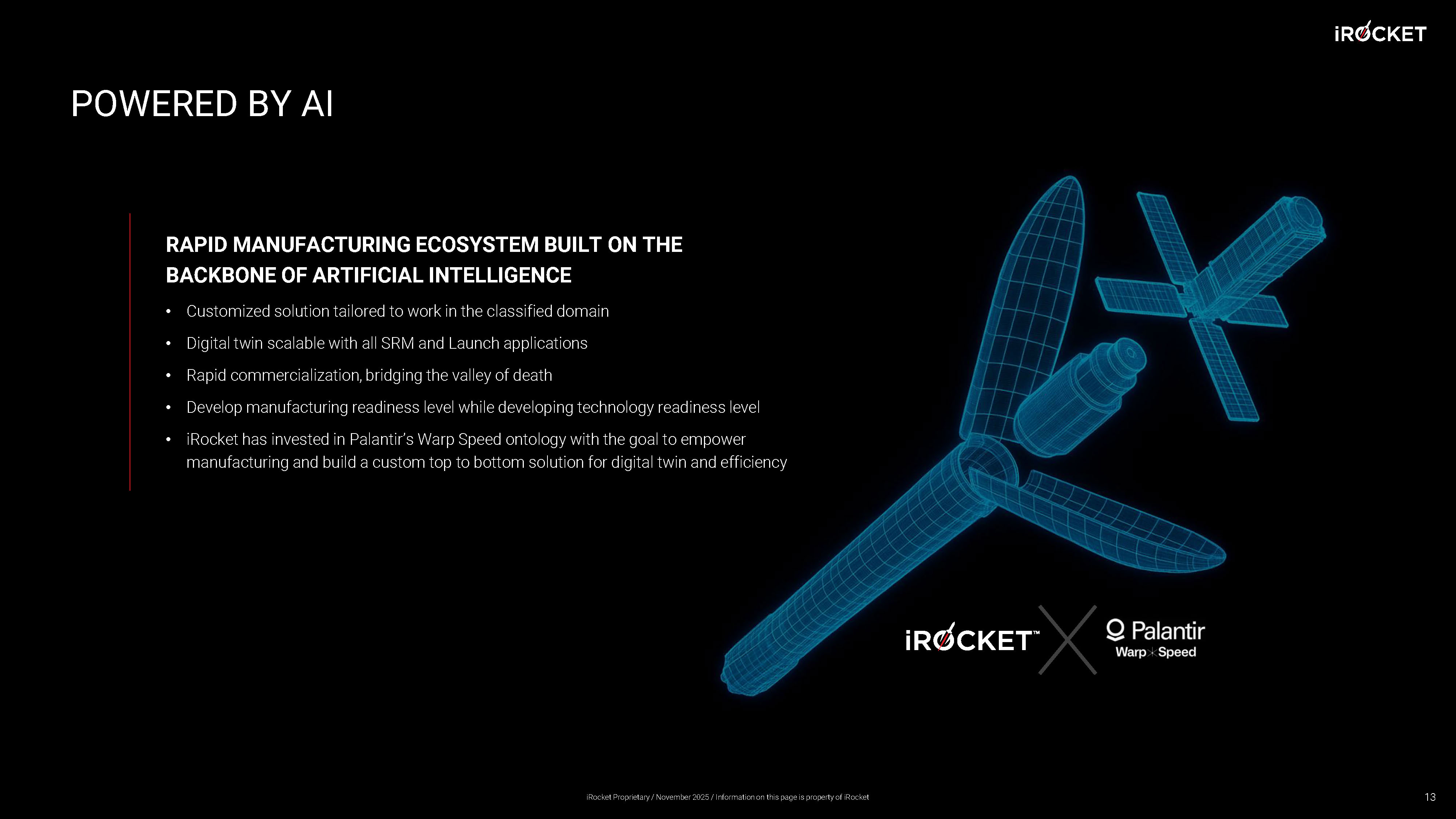 POWERED BY AI RAPID MANUFACTURING ECOSYSTEM BUILT ON THE BACKBONE OF ARTIFICIAL INTELLIGENCE • Customized solution tailored to work in the classified domain • Digital twin scalable with all SRM and Launch applications • Rapid commercialization, bridging the valley of death • Develop manufacturing readiness level while developing technology readiness level • iRocket has invested in Palantir’s Warp Speed ontology with the goal to empower manufacturing and build a custom top to bottom solution for digital twin and efficiency 13 iRocket Proprietary / November 2025 / Information on this page is property of iRocket