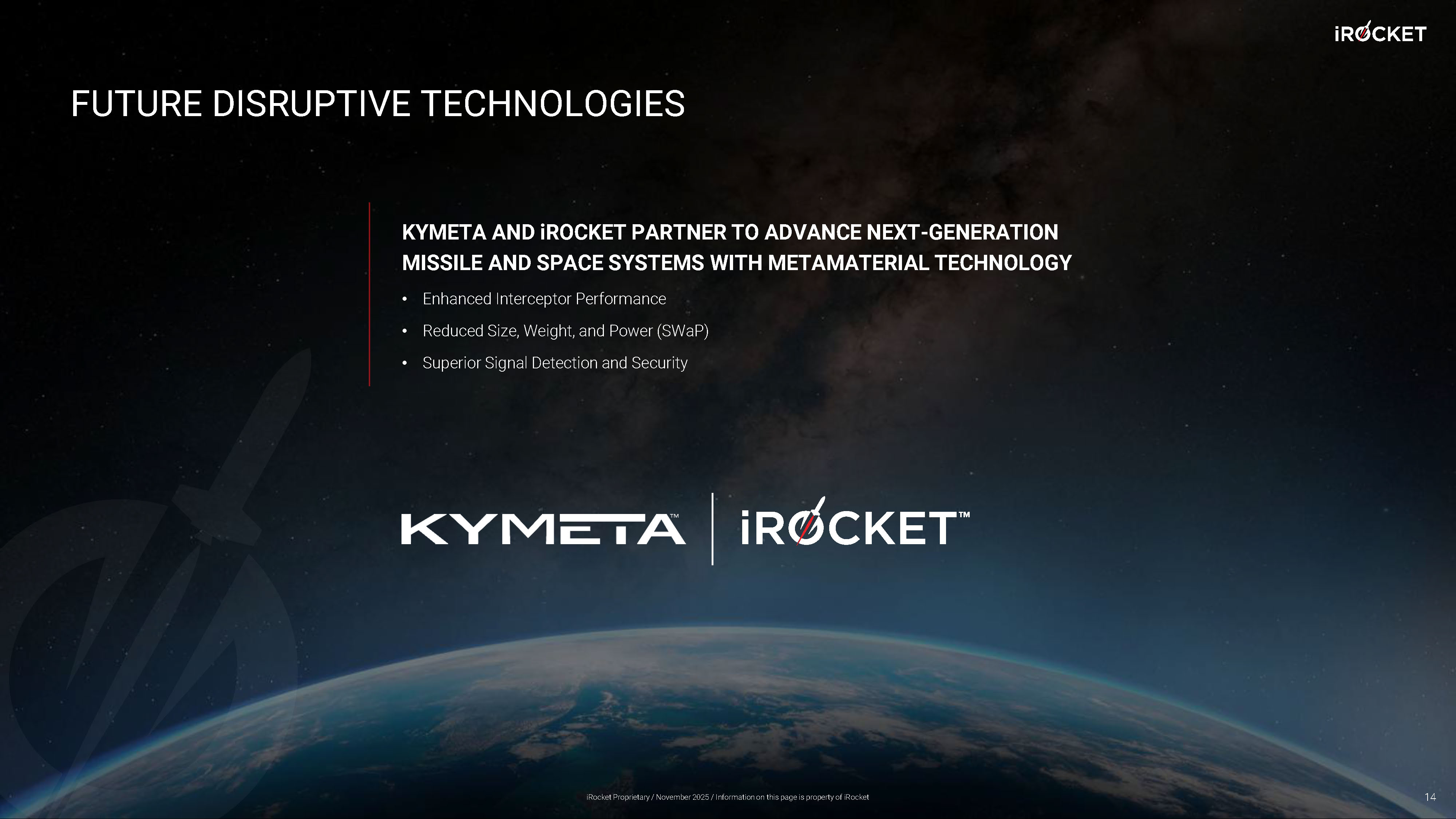 FUTURE DISRUPTIVE TECHNOLOGIES 14 KYMETA AND i ROCKET PARTNER TO ADVANCE NEXT - GENERATION MISSILE AND SPACE SYSTEMS WITH METAMATERIAL TECHNOLOGY • Enhanced Interceptor Performance • Reduced Size, Weight, and Power ( SWaP ) • Superior Signal Detection and Security iRocket Proprietary / November 2025 / Information on this page is property of iRocket
