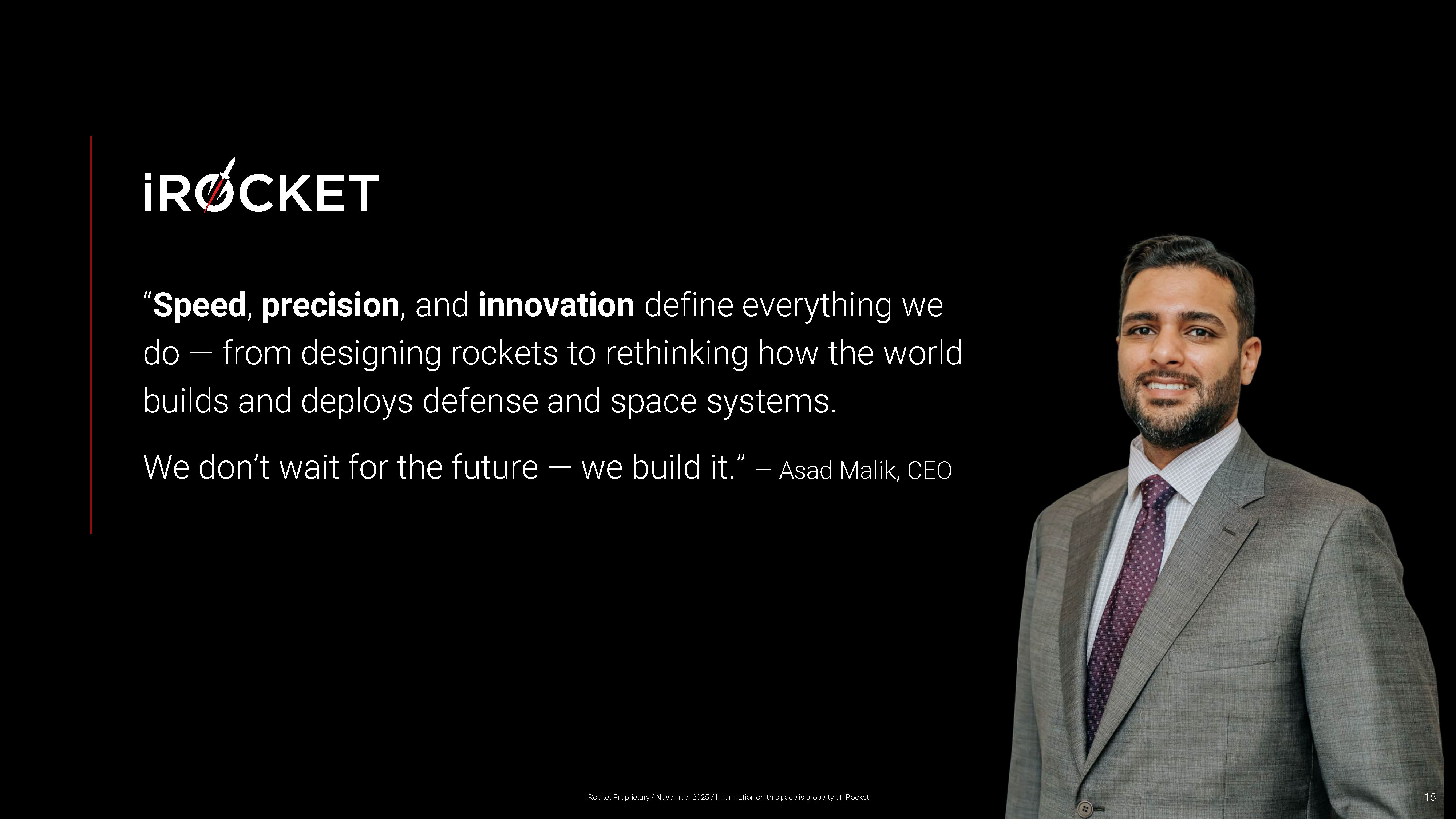 “ Speed , precision , and innovation define everything we do — from designing rockets to rethinking how the world builds and deploys defense and space systems. We don’t wait for the future — we build it.” — Asad Malik, CEO 15 iRocket Proprietary / November 2025 / Information on this page is property of iRocket