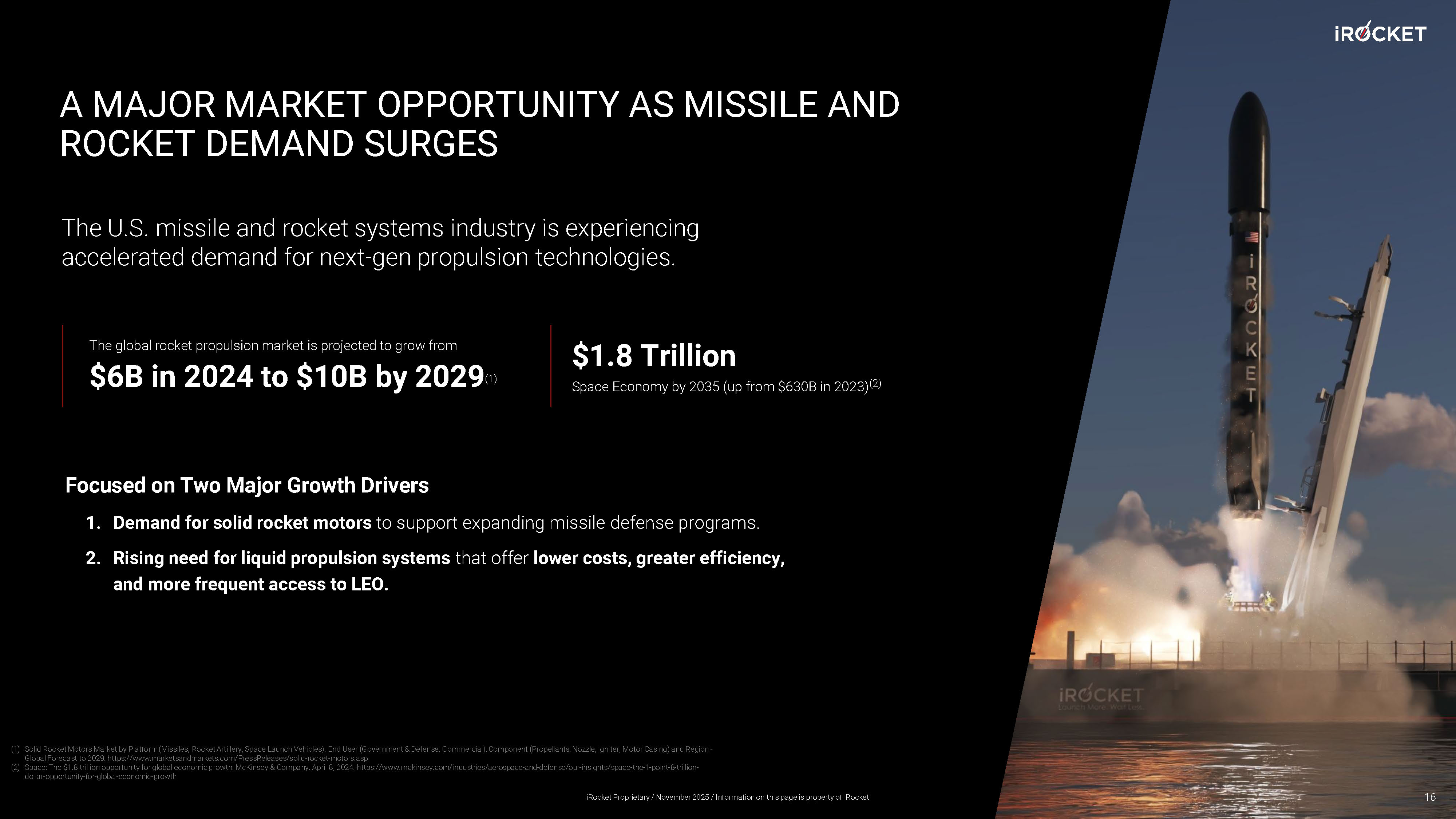 A MAJOR MARKET OPPORTUNITY AS MISSILE AND ROCKET DEMAND SURGES Focused on Two Major Growth Drivers 1. Demand for solid rocket motors to support expanding missile defense programs. 2. Rising need for liquid propulsion systems that offer lower costs, greater efficiency, and more frequent access to LEO. The U.S. missile and rocket systems industry is experiencing accelerated demand for next - gen propulsion technologies. The global rocket propulsion market is projected to grow from $6B in 2024 to $10B by 2029 (1) $1.8 Trillion Space Economy by 2035 (up from $630B in 2023) (2) 16 (1) Solid Rocket Motors Market by Platform (Missiles, Rocket Artillery, Space Launch Vehicles), End User (Government & Defense, C omm ercial), Component (Propellants, Nozzle, Igniter, Motor Casing) and Region - Global Forecast to 2029. https://www.marketsandmarkets.com/PressReleases/solid - rocket - motors.asp (2) Space: The $1.8 trillion opportunity for global economic growth. McKinsey & Company. April 8, 2024. https://www.mckinsey.com/ ind ustries/aerospace - and - defense/our - insights/space - the - 1 - point - 8 - trillion - dollar - opportunity - for - global - economic - growth iRocket Proprietary / November 2025 / Information on this page is property of iRocket