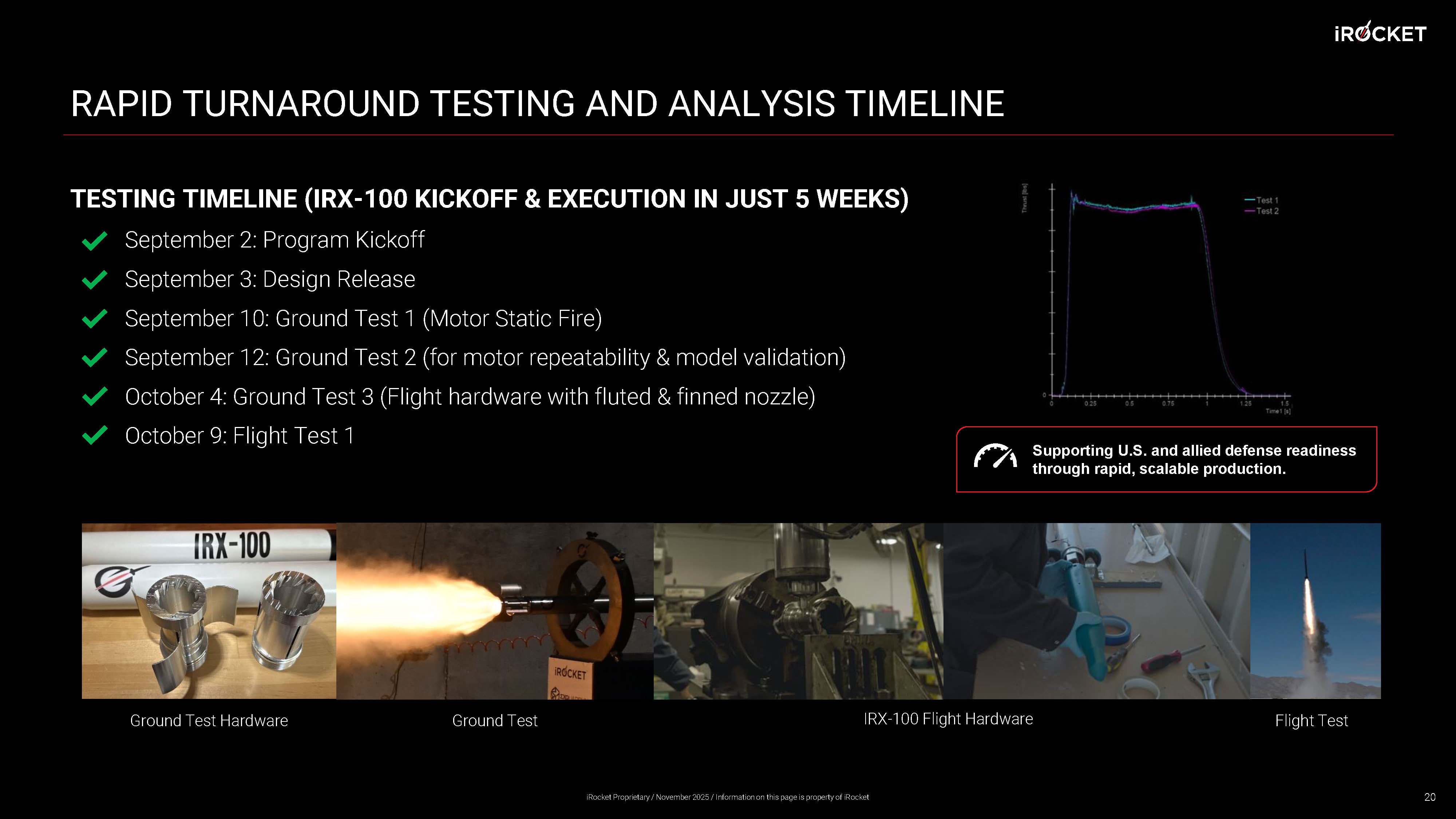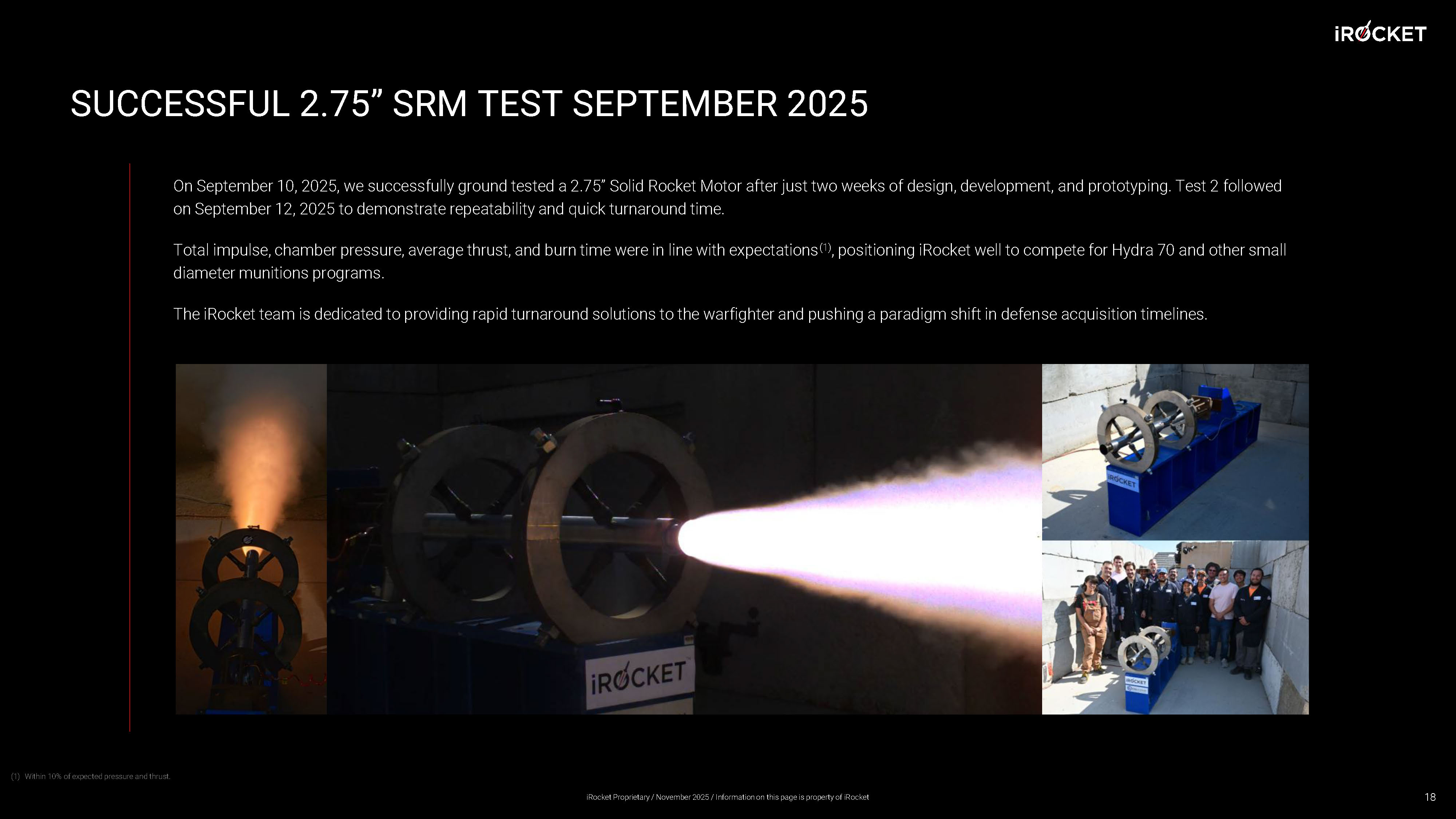 SUCCESSFUL 2.75” SRM TEST SEPTEMBER 2025 On September 10, 2025, we successfully ground tested a 2.75” Solid Rocket Motor after just two weeks of design, development, and prototyping. Test 2 followed on September 12, 2025 to demonstrate repeatability and quick turnaround time. Total impulse, chamber pressure, average thrust, and burn time were in line with expectations (1) , positioning iRocket well to compete for Hydra 70 and other small diameter munitions programs. The iRocket team is dedicated to providing rapid turnaround solutions to the warfighter and pushing a paradigm shift in defen se acquisition timelines. 18 (1) Within 10% of expected pressure and thrust. iRocket Proprietary / November 2025 / Information on this page is property of iRocket