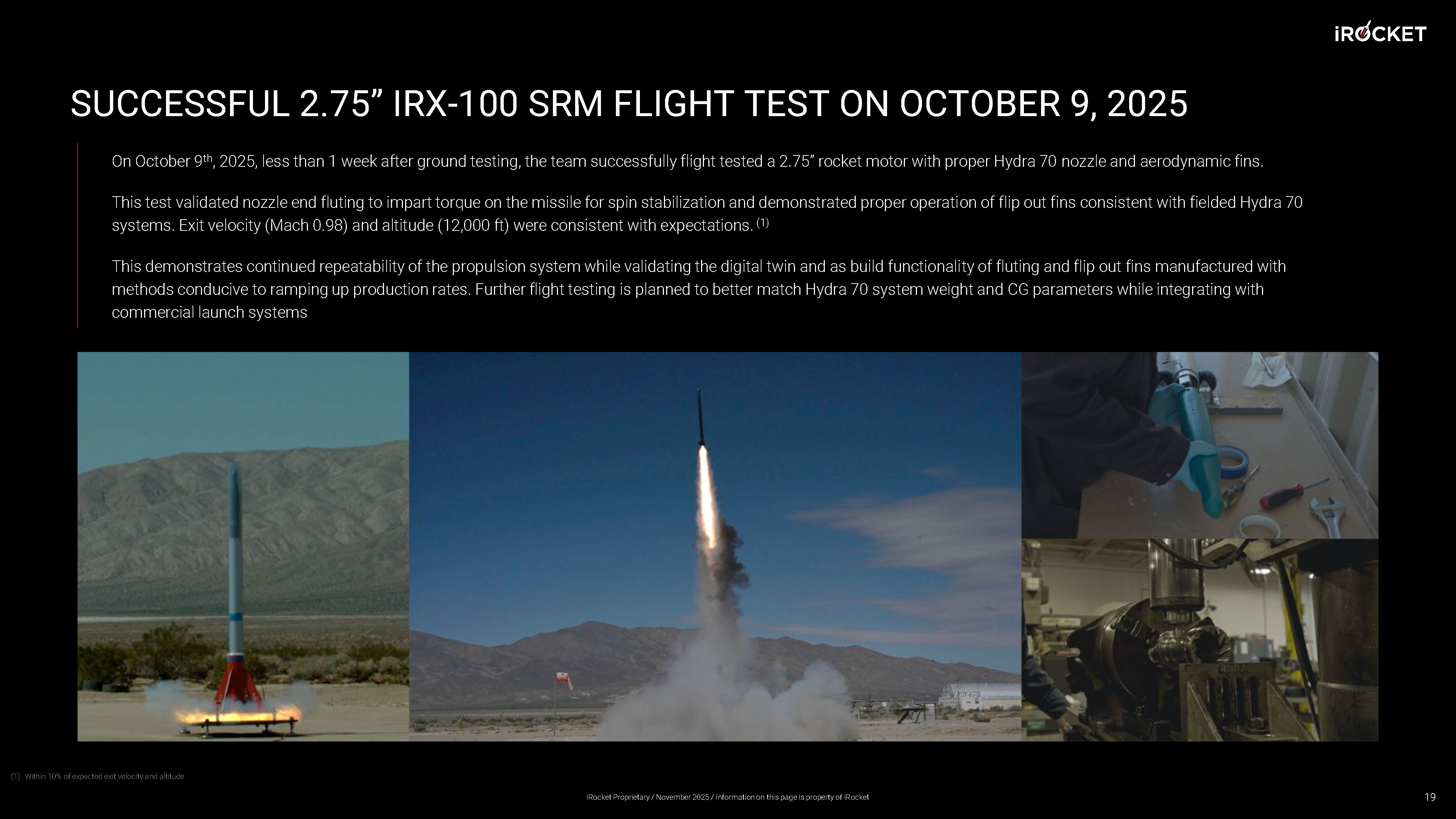 SUCCESSFUL 2.75” IRX - 100 SRM FLIGHT TEST ON OCTOBER 9, 2025 On October 9 th , 2025, less than 1 week after ground testing, the team successfully flight tested a 2.75” rocket motor with proper Hydra 70 noz zle and aerodynamic fins. This test validated nozzle end fluting to impart torque on the missile for spin stabilization and demonstrated proper operati on of flip out fins consistent with fielded Hydra 70 systems. Exit velocity (Mach 0.98) and altitude (12,000 ft) were consistent with expectations. (1) This demonstrates continued repeatability of the propulsion system while validating the digital twin and as build functionali ty of fluting and flip out fins manufactured with methods conducive to ramping up production rates. Further flight testing is planned to better match Hydra 70 system weight an d C G parameters while integrating with commercial launch systems (1) Within 10% of expected exit velocity and altitude 19 iRocket Proprietary / November 2025 / Information on this page is property of iRocket