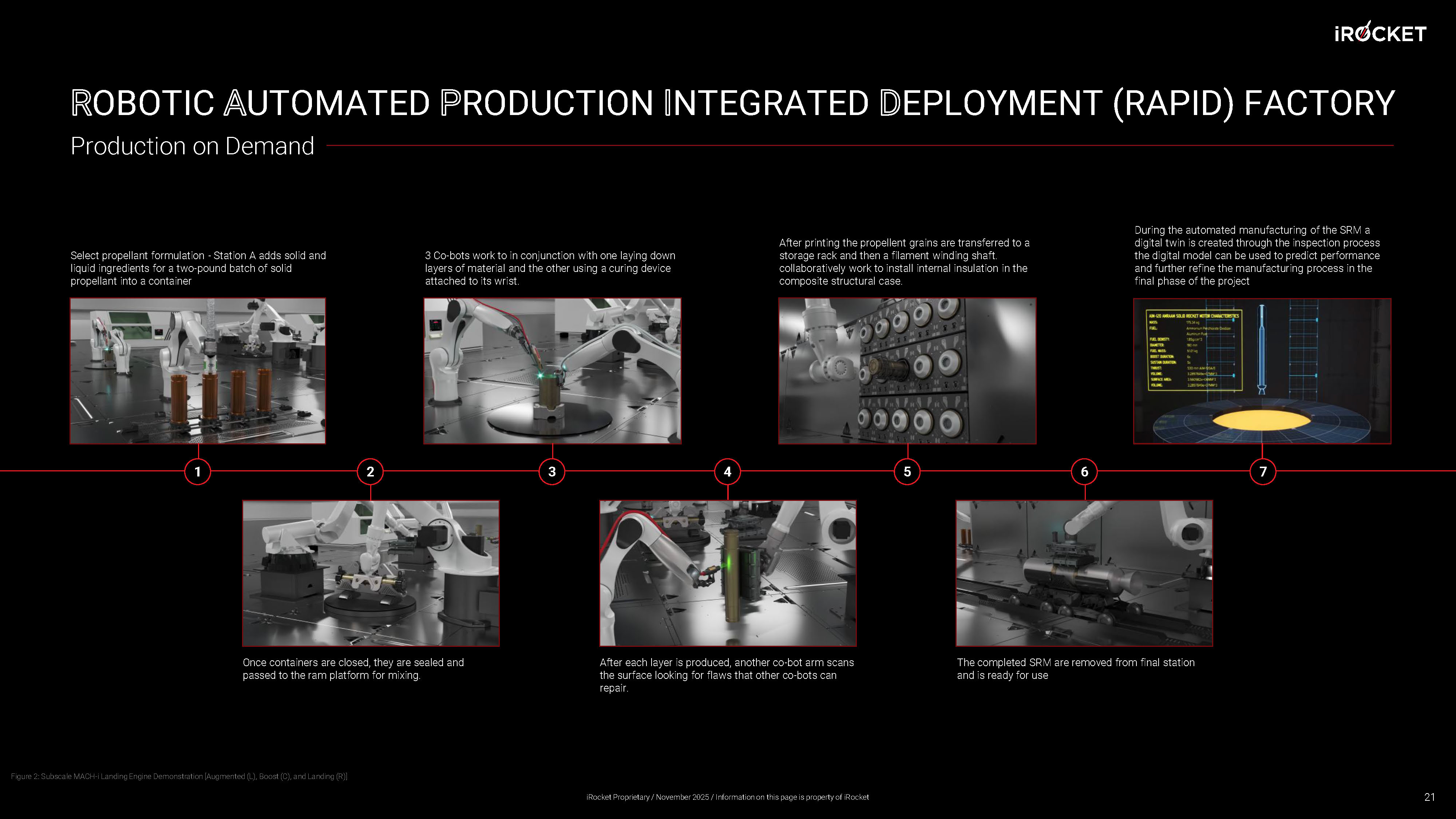 OBOTIC UTOMATED RODUCTION NTEGRATED EPLOYMENT (RAPID) FACTORY Select propellant formulation - Station A adds solid and liquid ingredients for a two - pound batch of solid propellant into a container Once containers are closed, they are sealed and passed to the ram platform for mixing. 3 Co - bots work to in conjunction with one laying down layers of material and the other using a curing device attached to its wrist. After each layer is produced, another co - bot arm scans the surface looking for flaws that other co - bots can repair. After printing the propellent grains are transferred to a storage rack and then a filament winding shaft. collaboratively work to install internal insulation in the composite structural case. The completed SRM are removed from final station and is ready for use During the automated manufacturing of the SRM a digital twin is created through the inspection process the digital model can be used to predict performance and further refine the manufacturing process in the final phase of the project Production on Demand 1 2 3 4 5 6 7 21 Figure 2: Subscale MACH - i Landing Engine Demonstration [Augmented (L), Boost (C), and Landing (R)] iRocket Proprietary / November 2025 / Information on this page is property of iRocket