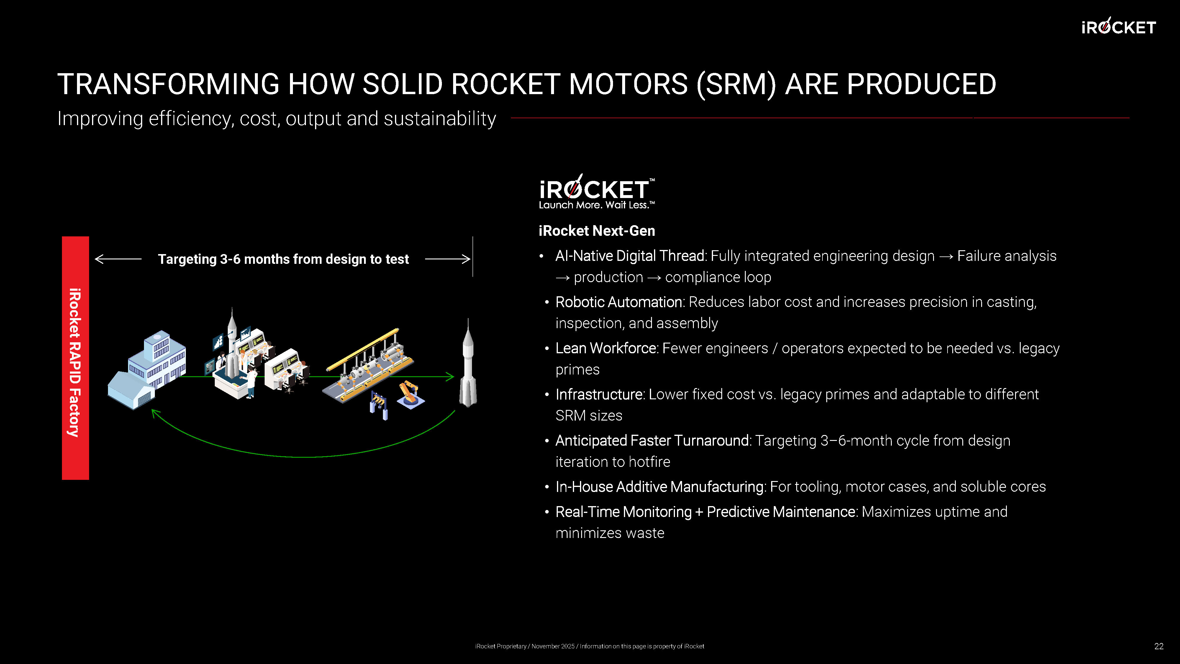 TRANSFORMING HOW SOLID ROCKET MOTORS (SRM) ARE PRODUCED iRocket RAPID Factory Targeting 3 - 6 months from design to test Improving efficiency, cost, output and sustainability 22 iRocket Next - Gen • AI - Native Digital Thread : Fully integrated engineering design → Failure analysis → production → compliance loop • Robotic Automation : Reduces labor cost and increases precision in casting, inspection, and assembly • Lean Workforce : Fewer engineers / operators expected to be needed vs. legacy primes • Infrastructure : Lower fixed cost vs. legacy primes and adaptable to different SRM sizes • Anticipated Faster Turnaround : Targeting 3 – 6 - month cycle from design iteration to hotfire • In - House Additive Manufacturing : For tooling, motor cases, and soluble cores • Real - Time Monitoring + Predictive Maintenance : Maximizes uptime and minimizes waste iRocket Proprietary / November 2025 / Information on this page is property of iRocket