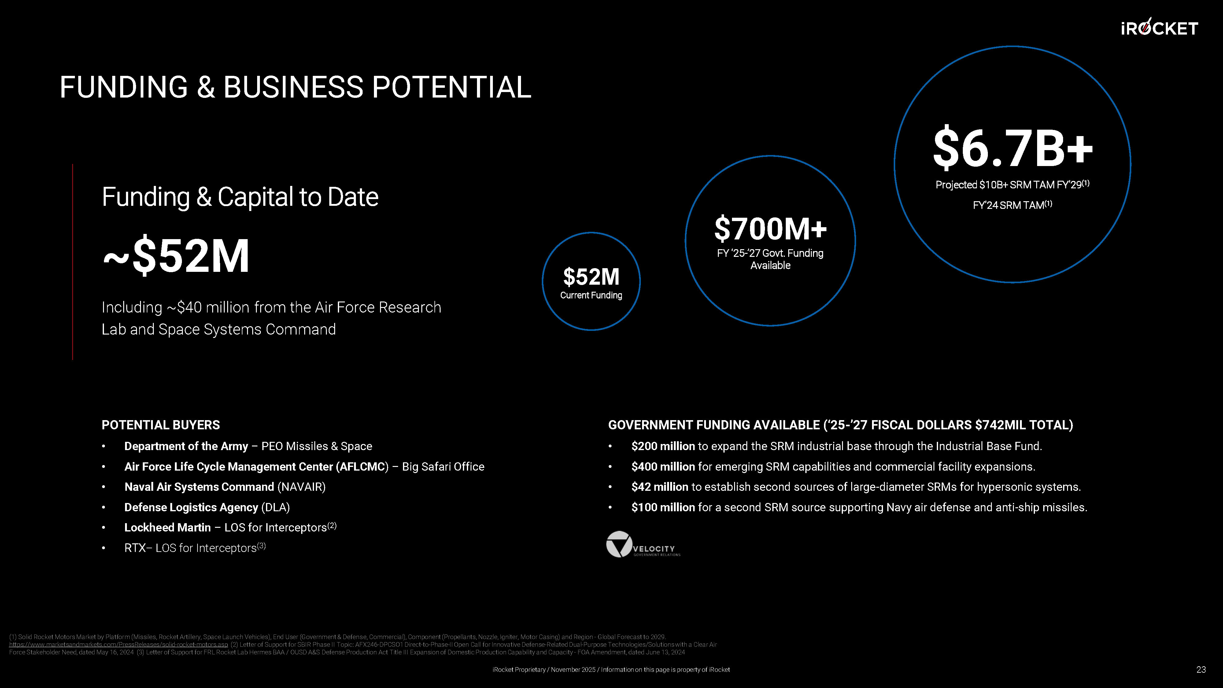 FUNDING & BUSINESS POTENTIAL GOVERNMENT FUNDING AVAILABLE (‘25 - ’27 FISCAL DOLLARS $742MIL TOT AL) • $200 million to expand the SRM industrial base through the Industrial Base Fund. • $400 million for emerging SRM capabilities and commercial facility expansions. • $42 million to establish second sources of large - diameter SRMs for hypersonic systems. • $100 million for a second SRM source supporting Navy air defense and anti - ship missiles. POTENTIAL BUYERS • Department of the Army – PEO Missiles & Space • Air Force Life Cycle Management Center (AFLCMC ) – Big Safari Office • Naval Air Systems Command (NAVAIR) • Defense Logistics Agency (DLA) • Lockheed Martin – LOS for Interceptors (2) • RTX – LOS for Interceptors (3) Funding & Capital to Date ~$52M Including ~$40 million from the Air Force Research Lab and Space Systems Command $52M Current Funding $6.7B+ Projected $10B+ SRM TAM FY’29 (1) FY’24 SRM TAM (1) $700M+ FY ‘25 - ’27 Govt. Funding Available 23 (1) Solid Rocket Motors Market by Platform (Missiles, Rocket Artillery, Space Launch Vehicles), End User (Government & Defens e, Commercial), Component (Propellants, Nozzle, Igniter, Motor Casing) and Region - Global Forecast to 2029. https://www.marketsandmarkets.com/PressReleases/solid - rocket - motors.asp (2) Letter of Support for SBIR Phase II Topic: AFX246 - DPCSO1 Direct - to - Phase - II Open Call for Innovative Defense - Related Dual - Purpose Technologies/Solutions with a Clear Air Force Stakeholder Need, dated May 16, 2024 (3) Letter of Support for FRL Rocket Lab Hermes BAA / OUSD A&S Defense Production Ac t Title III Expansion of Domestic Production Capability and Capacity - FOA Amendment, dated June 13, 2024 iRocket Proprietary / November 2025 / Information on this page is property of iRocket