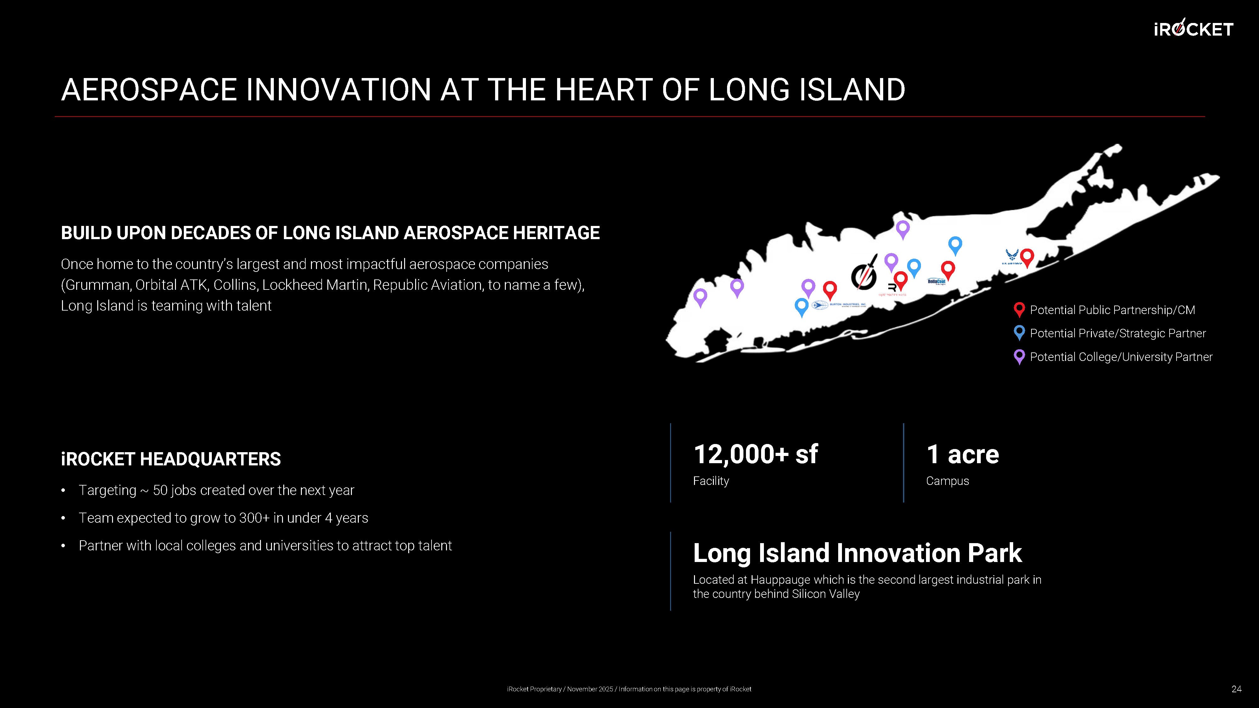 AEROSPACE INNOVATION AT THE HEART OF LONG ISLAND BUILD UPON DECADES OF LONG ISLAND AEROSPACE HERITAGE Once home to the country’s largest and most impactful aerospace companies (Grumman, Orbital ATK, Collins, Lockheed Martin, Republic Aviation, to name a few), Long Island is teaming with talent 24 12,000+ sf Facility Long Island Innovation Park Located at Hauppauge which is the second largest industrial park in the country behind Silicon Valley Potential Public Partnership/CM Potential Private/Strategic Partner Potential College/University Partner i ROCKET HEADQUARTERS • Targeting ~ 50 jobs created over the next year • Team expected to grow to 300+ in under 4 years • Partner with local colleges and universities to attract top talent iRocket Proprietary / November 2025 / Information on this page is property of iRocket 1 acre Campus