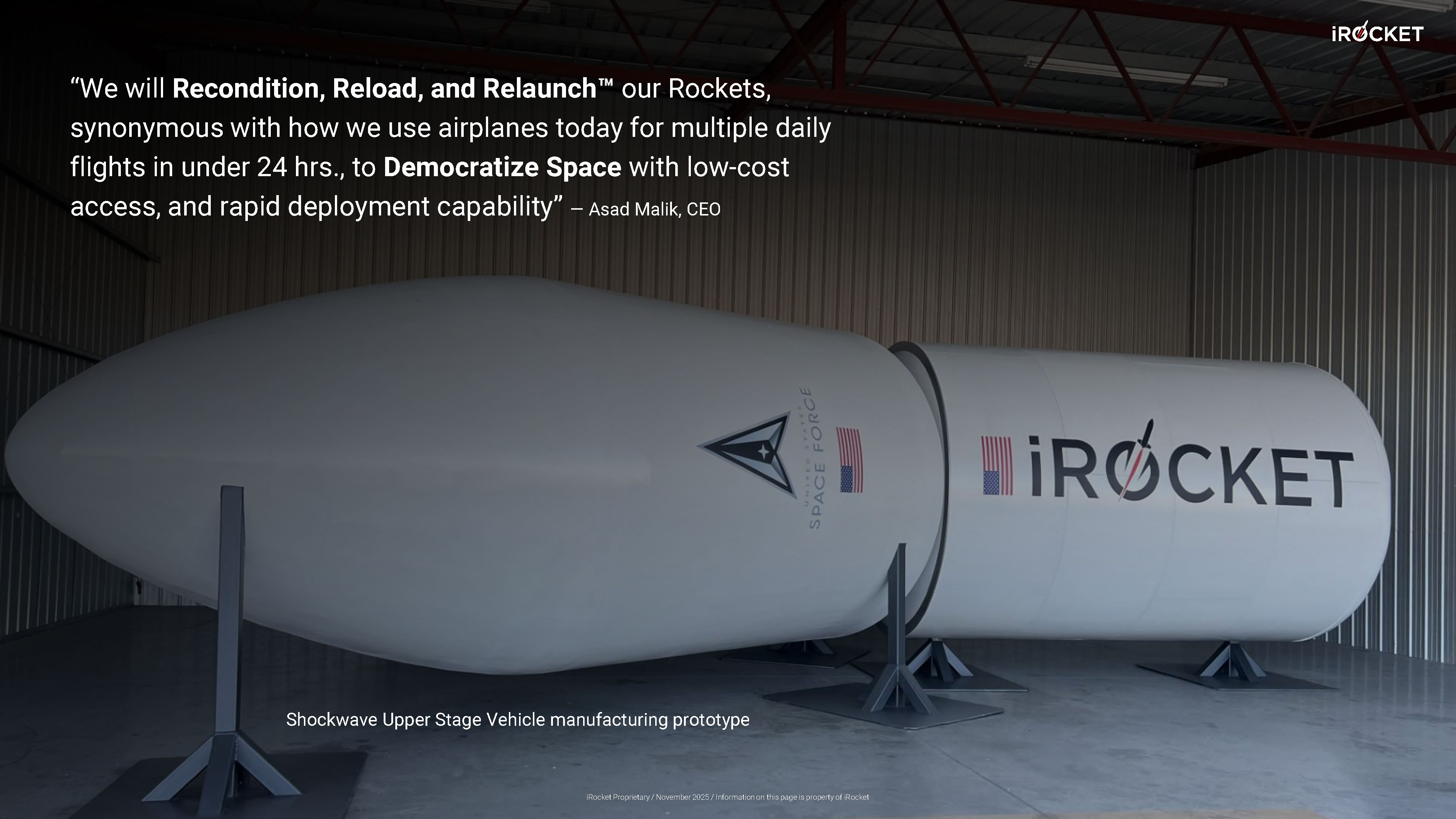Shockwave Upper Stage Vehicle manufacturing prototype “We will Recondition, Reload, and Relaunch our Rockets, synonymous with how we use airplanes today for multiple daily flights in under 24 hrs., to Democratize Space with low - cost access, and rapid deployment capability” — Asad Malik, CEO iRocket Proprietary / November 2025 / Information on this page is property of iRocket