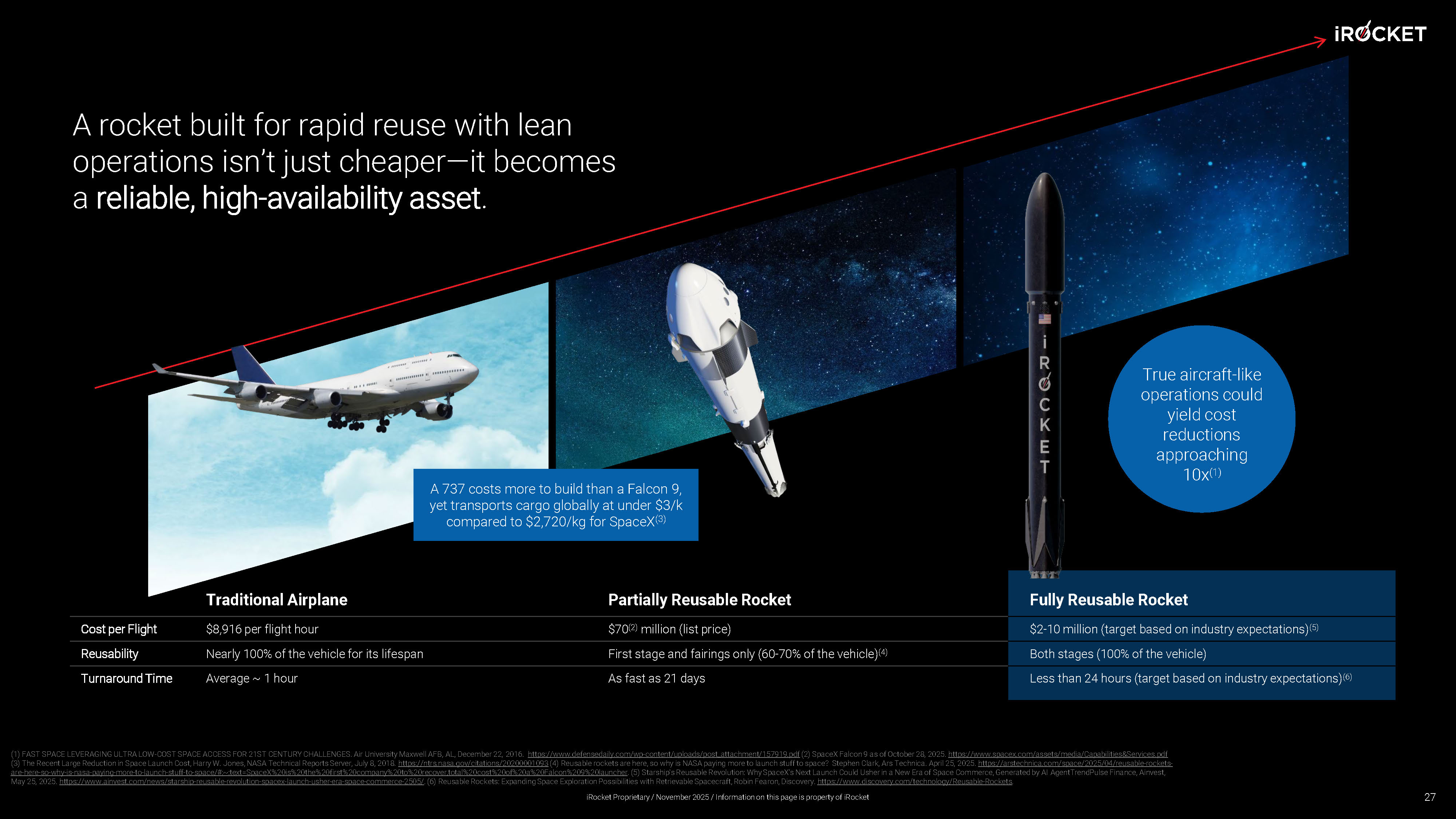Fully Reusable Rocket Partially Reusable Rocket Traditional Airplane $2 - 10 million (target based on industry expectations) (5) $70 (2) million (list price) $8,916 per flight hour Cost per Flight Both stages (100% of the vehicle) First stage and fairings only (60 - 70% of the vehicle) (4) Nearly 100% of the vehicle for its lifespan Reusability Less than 24 hours (target based on industry expectations) (6) As fast as 21 days Average ~ 1 hour Turnaround Time True aircraft - like operations could yield cost reductions approaching 10x (1) A rocket built for rapid reuse with lean operations isn’t just cheaper — it becomes a reliable, high - availability asset . A 737 costs more to build than a Falcon 9, yet transports cargo globally at under $3/k compared to $2,720/kg for SpaceX (3) 27 (1) FAST SPACE LEVERAGING ULTRA LOW - COST SPACE ACCESS FOR 21ST CENTURY CHALLENGES. Air University Maxwell AFB, AL, December 22, 2016. https://www.defensedaily.com/wp - content/uploads/post_attachment/157919.pdf (2) SpaceX Falcon 9 as of October 28, 2025. https://www.spacex.com/assets/media/Capabilities&Services.pdf (3) The Recent Large Reduction in Space Launch Cost, Harry W. Jones, NASA Technical Reports Server, July 8, 2018. https://ntrs.nasa.gov/citations/20200001093 (4) Reusable rockets are here, so why is NASA paying more to launch stuff to space? Stephen Clark, Ars Technica. April 25, 2 02 5. https://arstechnica.com/space/2025/04/reusable - rockets - are - here - so - why - is - nasa - paying - more - to - launch - stuff - to - space/#:~:text=SpaceX%20is%20the%20first%20company%20to%20recover,total%2 0cost%20of%20a%20Falcon%209%20launcher . (5) Starship's Reusable Revolution: Why SpaceX's Next Launch Could Usher in a New Era of Space Commerce, Generated by AI AgentTrendPulse Finance, Ainvest , May 25, 2025. https://www.ainvest.com/news/starship - reusable - revolution - spacex - launch - usher - era - space - commerce - 2505/ . (6) Reusable Rockets: Expanding Space Exploration Possibilities with Retrievable Spacecraft, Robin Fearon, Discovery. https://www.discovery.com/technology/Reusable - Rockets . iRocket Proprietary / November 2025 / Information on this page is property of iRocket