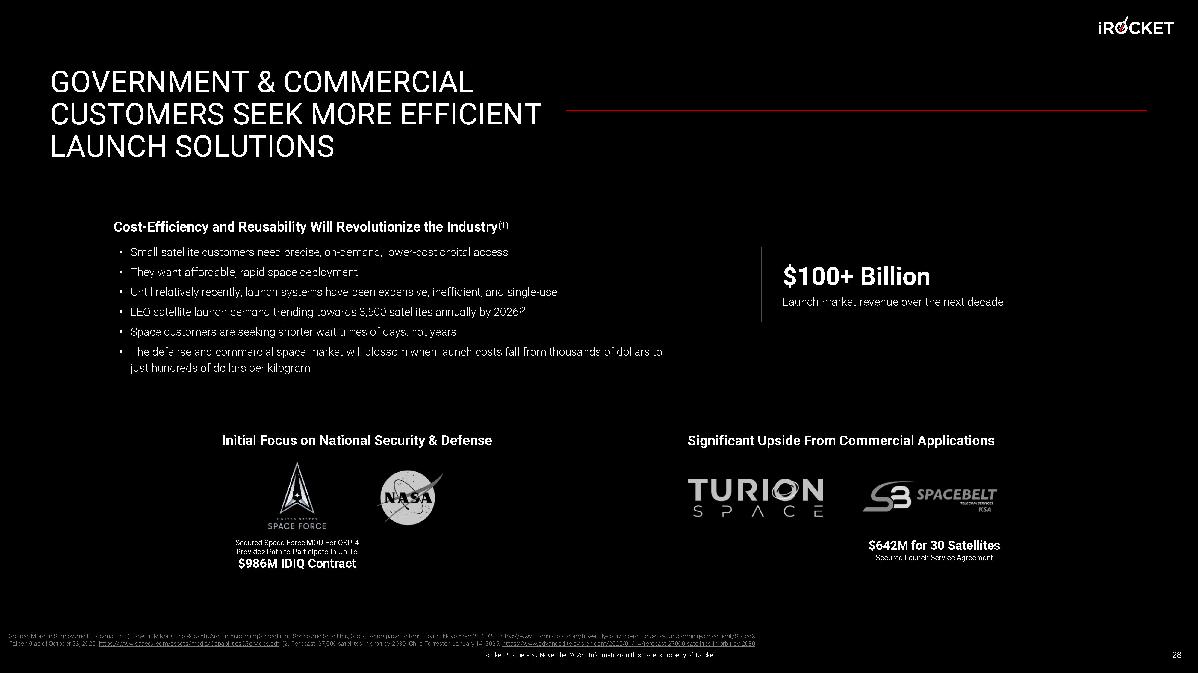 GOVERNMENT & COMMERCIAL CUSTOMERS SEEK MORE EFFICIENT LAUNCH SOLUTIONS Cost - Efficiency and Reusability Will Revolutionize the Industry (1) • Small satellite customers need precise, on - demand, lower - cost orbital access • They want affordable, rapid space deployment • Until relatively recently, launch systems have been expensive, inefficient, and single - use • LEO satellite launch demand trending towards 3,500 satellites annually by 2026 (2) • Space customers are seeking shorter wait - times of days, not years • The defense and commercial space market will blossom when launch costs fall from thousands of dollars to just hundreds of dollars per kilogram Significant Upside From Commercial Applications Initial Focus on National Security & Defense $100+ Billion Launch market revenue over the next decade 28 Source: Morgan Stanley and Euroconsult: (1) How Fully Reusable Rockets Are Transforming Spaceflight, Space and Satellites, Gl oba l Aerospace Editorial Team. November 21, 2024. https://www.global - aero.com/how - fully - reusable - rockets - are - transforming - spaceflig ht/SpaceX Falcon 9 as of October 28, 2025. https://www.spacex.com/assets/media/Capabilities&Services.pdf (2) Forecast: 27,000 satellites in orbit by 2030. Chris Forrester. January 14, 2025. https://www.advanced - television.com/2025/01/14/forecast - 27000 - satellites - in - orbit - by - 2030 iRocket Proprietary / November 2025 / Information on this page is property of iRocket Secured Space Force MOU For OSP - 4 Provides Path to Participate in Up To $986M IDIQ Contract $642M for 30 Satellites Secured Launch Service Agreement