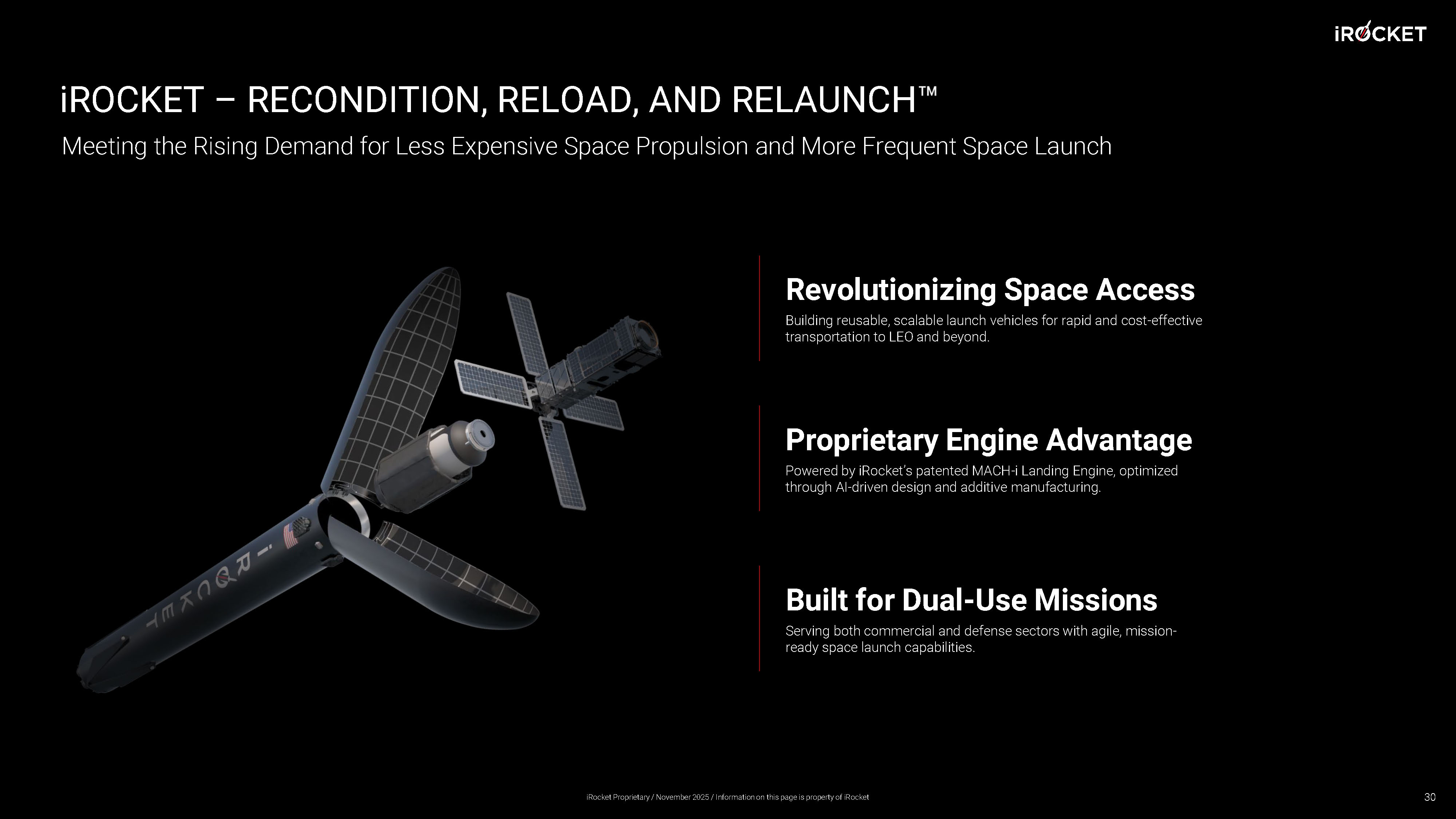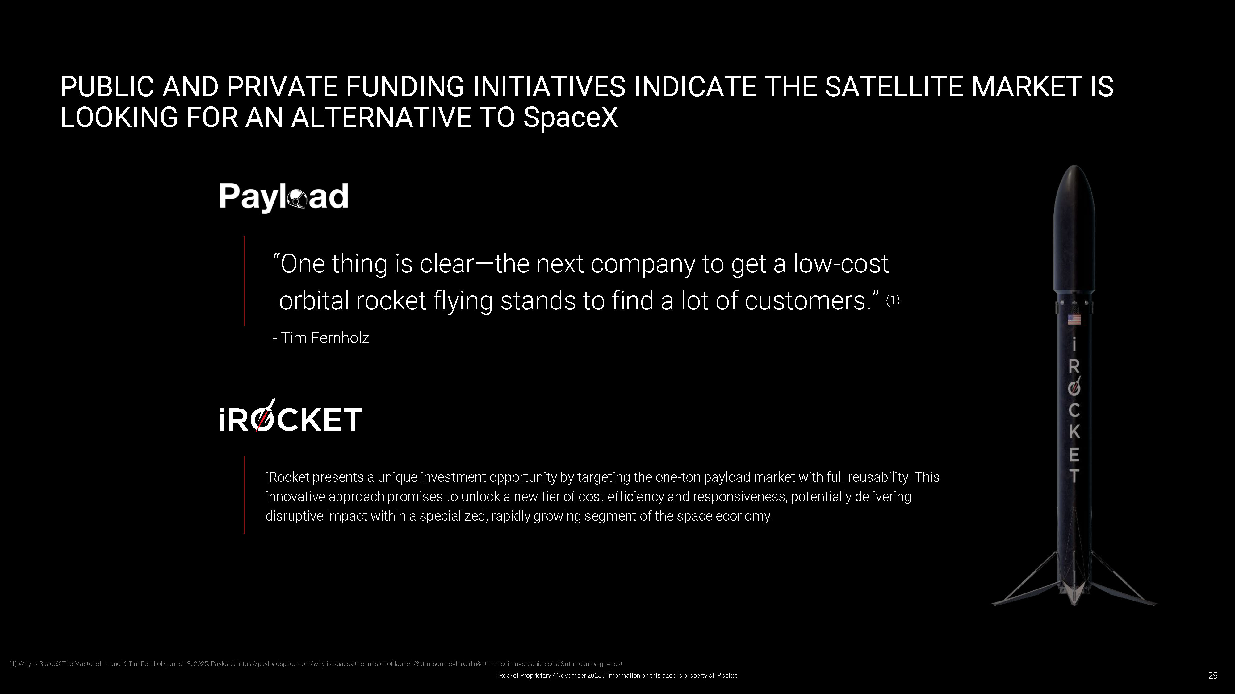 PUBLIC AND PRIVATE FUNDING INITIATIVES INDICATE THE SATELLITE MA RKET IS LOOKING FOR AN ALTERNATIVE TO SpaceX “One thing is clear — the next company to get a low - cost orbital rocket flying stands to find a lot of customers.” (1) - Tim Fernholz iRocket presents a unique investment opportunity by targeting the one - ton payload market with full reusability. This innovative approach promises to unlock a new tier of cost efficiency and responsiveness, potentially delivering disruptive impact within a specialized, rapidly growing segment of the space economy. 29 (1) Why Is SpaceX The Master of Launch? Tim Fernholz, June 13, 2025. Payload. https://payloadspace.com/why - is - spacex - the - master - of - launch/?utm_source=linkedin&utm_medium=organic - social&utm_campaign=post iRocket Proprietary / November 2025 / Information on this page is property of iRocket