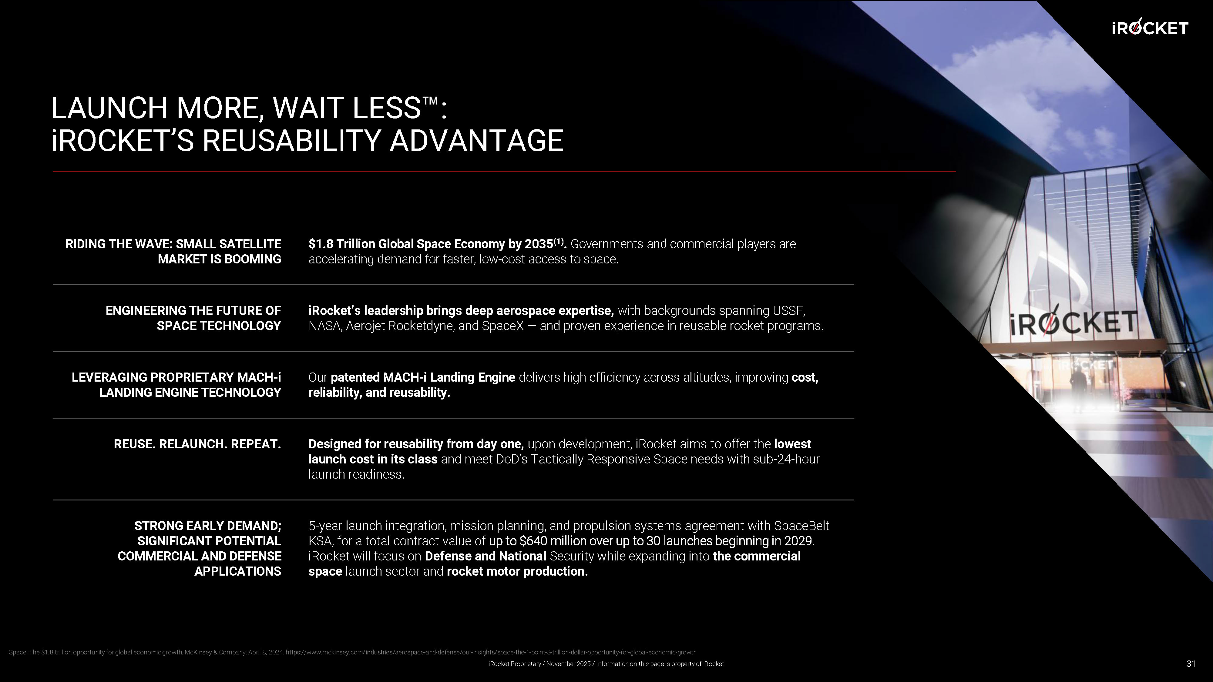 LAUNCH MORE, WAIT LESS : i ROCKET’S REUSABILITY ADVANTAGE $1.8 Trillion Global Space Economy by 2035 (1) . Governments and commercial players are accelerating demand for faster, low - cost access to space. RIDING THE WAVE: SMALL SATELLITE MARKET IS BOOMING iRocket’s leadership brings deep aerospace expertise, with backgrounds spanning USSF, NASA, Aerojet Rocketdyne, and SpaceX — and proven experience in reusable rocket programs. ENGINEERING THE FUTURE OF SPACE TECHNOLOGY Our patented MACH - i Landing Engine delivers high efficiency across altitudes, improving cost, reliability, and reusability. LEVERAGING PROPRIETARY MACH - i LANDING ENGINE TECHNOLOGY Designed for reusability from day one, upon development, iRocket aims to offer the lowest launch cost in its class and meet DoD’s Tactically Responsive Space needs with sub - 24 - hour launch readiness. REUSE. RELAUNCH. REPEAT. 5 - year launch integration, mission planning, and propulsion systems agreement with SpaceBelt KSA, for a total contract value of up to $640 million over up to 30 launches beginning in 2029 . iRocket will focus on Defense and National Security while expanding into the commercial space launch sector and rocket motor production. STRONG EARLY DEMAND; SIGNIFICANT POTENTIAL COMMERCIAL AND DEFENSE APPLICATIONS 31 Space: The $1.8 trillion opportunity for global economic growth. McKinsey & Company. April 8, 2024. https://www.mckinsey.com/ ind ustries/aerospace - and - defense/our - insights/space - the - 1 - point - 8 - trillion - dollar - opportunity - for - global - economic - growth iRocket Proprietary / November 2025 / Information on this page is property of iRocket