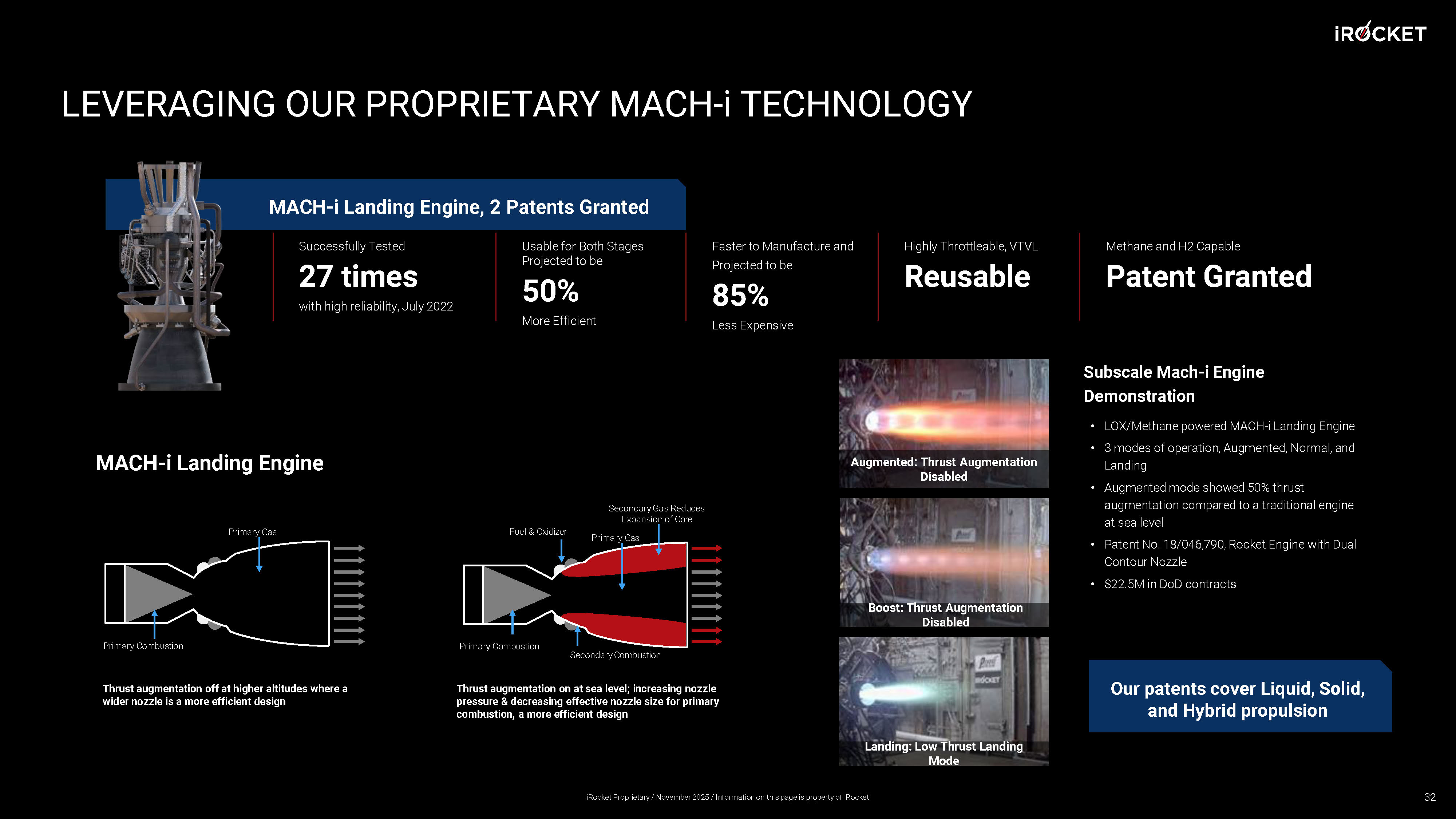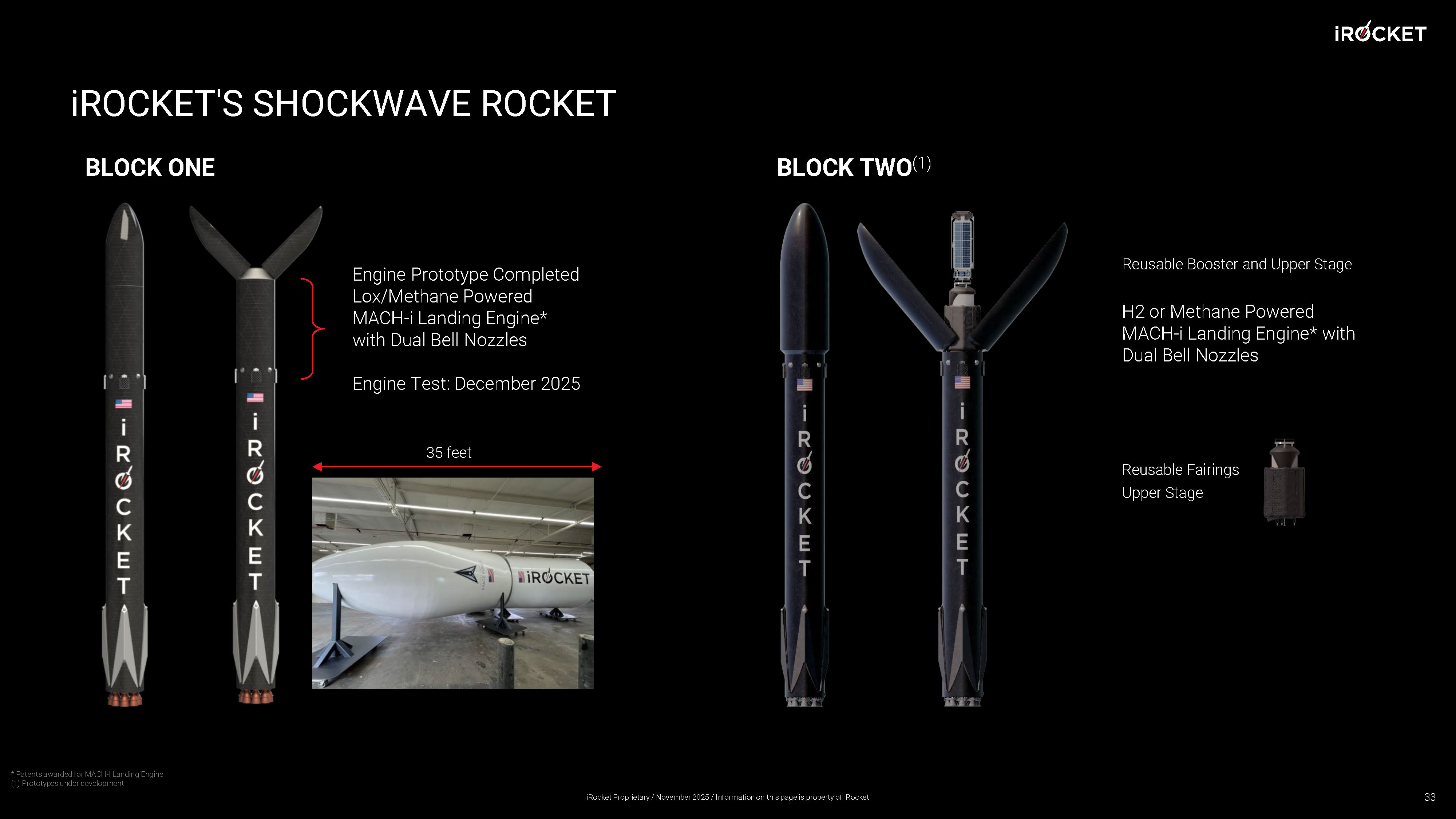 LEVERAGING OUR PROPRIETARY MACH - i TECHNOLOGY Successfully Tested 27 times with high reliability, July 2022 MACH - i Landing Engine, 2 Patents Granted Usable for Both Stages Projected to be 50% More Efficient Faster to Manufacture and Projected to be 85% Less Expensive Highly Throttleable, VTVL Reusable Methane and H2 Capable Patent Granted Thrust augmentation off at higher altitudes where a wider nozzle is a more efficient design Thrust augmentation on at sea level; increasing nozzle pressure & decreasing effective nozzle size for primary combustion, a more efficient design Primary Combustion Primary Gas Primary Gas Fuel & Oxidizer Primary Combustion Secondary Gas Reduces Expansion of Core Secondary Combustion MACH - i Landing Engine Subscale Mach - i Engine Demonstration • LOX/Methane powered MACH - i Landing Engine • 3 modes of operation, Augmented, Normal, and Landing • Augmented mode showed 50% thrust augmentation compared to a traditional engine at sea level • Patent No. 18/046,790, Rocket Engine with Dual Contour Nozzle • $22.5M in DoD contracts Augmented: Thrust Augmentation Disabled Boost: Thrust Augmentation Disabled Landing: Low Thrust Landing Mode Our patents cover Liquid, Solid, and Hybrid propulsion 32 iRocket Proprietary / November 2025 / Information on this page is property of iRocket