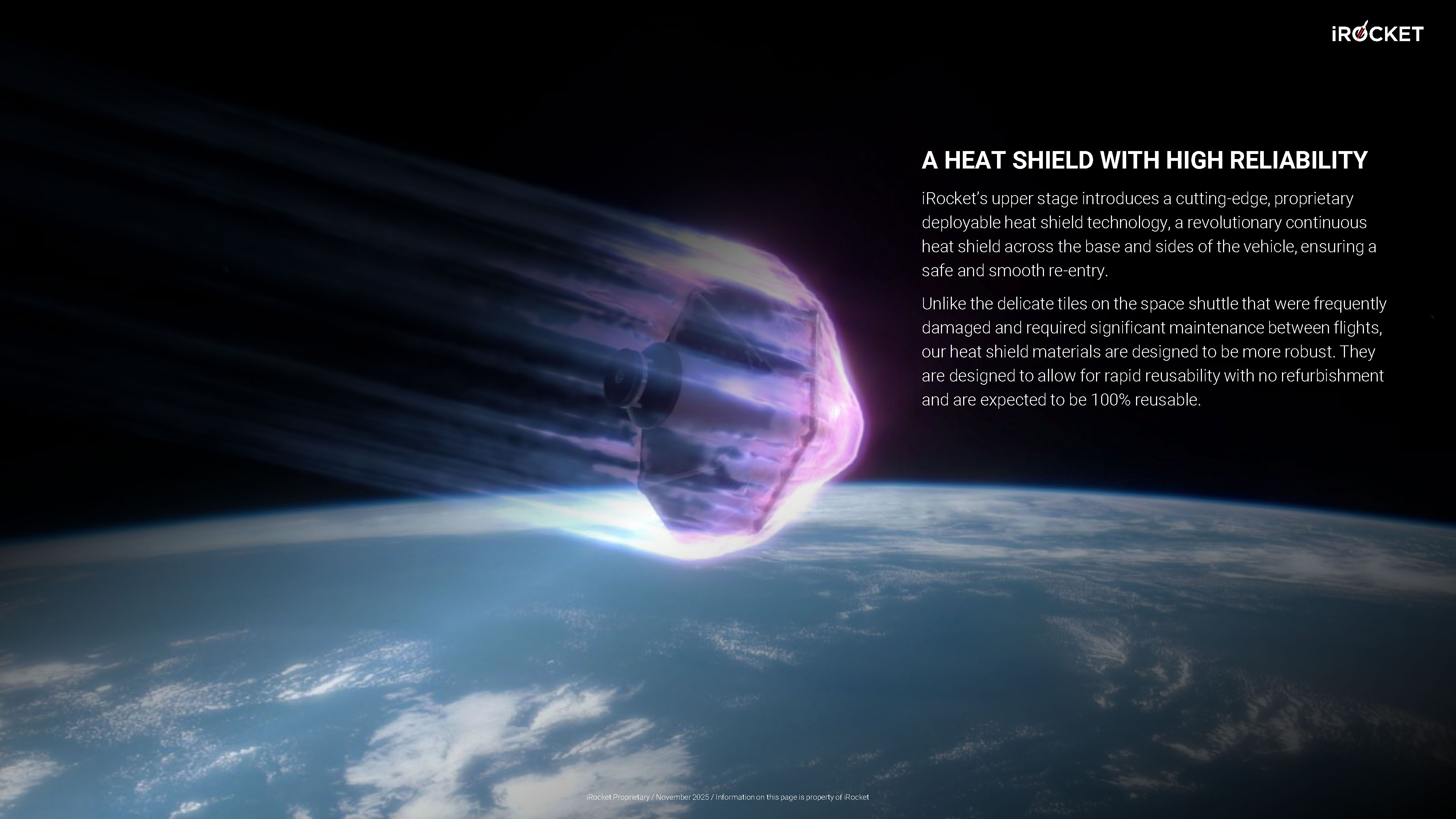 iRocket Proprietary / November 2025 / Information on this page is property of iRocket A HEAT SHIELD WITH HIGH RELIABILITY iRocket’s upper stage introduces a cutting - edge, proprietary deployable heat shield technology, a revolutionary continuous heat shield across the base and sides of the vehicle, ensuring a safe and smooth re - entry. Unlike the delicate tiles on the space shuttle that were frequently damaged and required significant maintenance between flights, our heat shield materials are designed to be more robust. They are designed to allow for rapid reusability with no refurbishment and are expected to be 100% reusable.