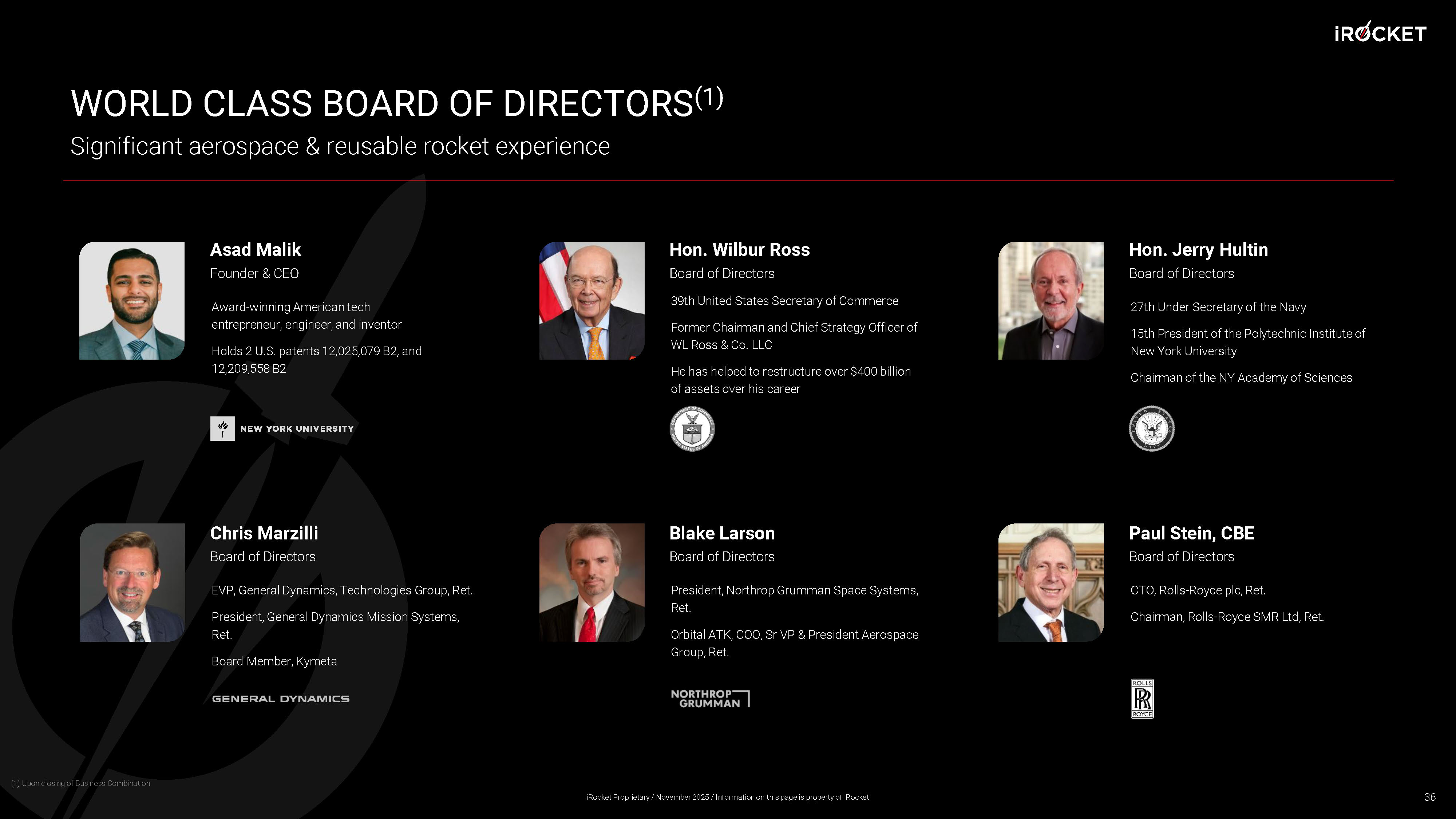 Asad Malik Founder & CEO Award - winning American tech entrepreneur, engineer, and inventor Holds 2 U.S. patents 12,025,079 B2, and 12,209,558 B2 WORLD CLASS BOARD OF DIRECTORS (1) Hon. Wilbur Ross Board of Directors 39th United States Secretary of Commerce Former Chairman and Chief Strategy Officer of WL Ross & Co. LLC He has helped to restructure over $400 billion of assets over his career Hon. Jerry Hultin Board of Directors 27th Under Secretary of the Navy 15th President of the Polytechnic Institute of New York University Chairman of the NY Academy of Sciences Chris Marzilli Board of Directors EVP, General Dynamics, Technologies Group, Ret. President, General Dynamics Mission Systems, Ret. Board Member, Kymeta Blake Larson Board of Directors President, Northrop Grumman Space Systems, Ret. Orbital ATK, COO, Sr VP & President Aerospace Group, Ret. Paul Stein, CBE Board of Directors CTO, Rolls - Royce plc, Ret. Chairman, Rolls - Royce SMR Ltd, Ret. Significant aerospace & reusable rocket experience 36 (1) Upon closing of Business Combination iRocket Proprietary / November 2025 / Information on this page is property of iRocket