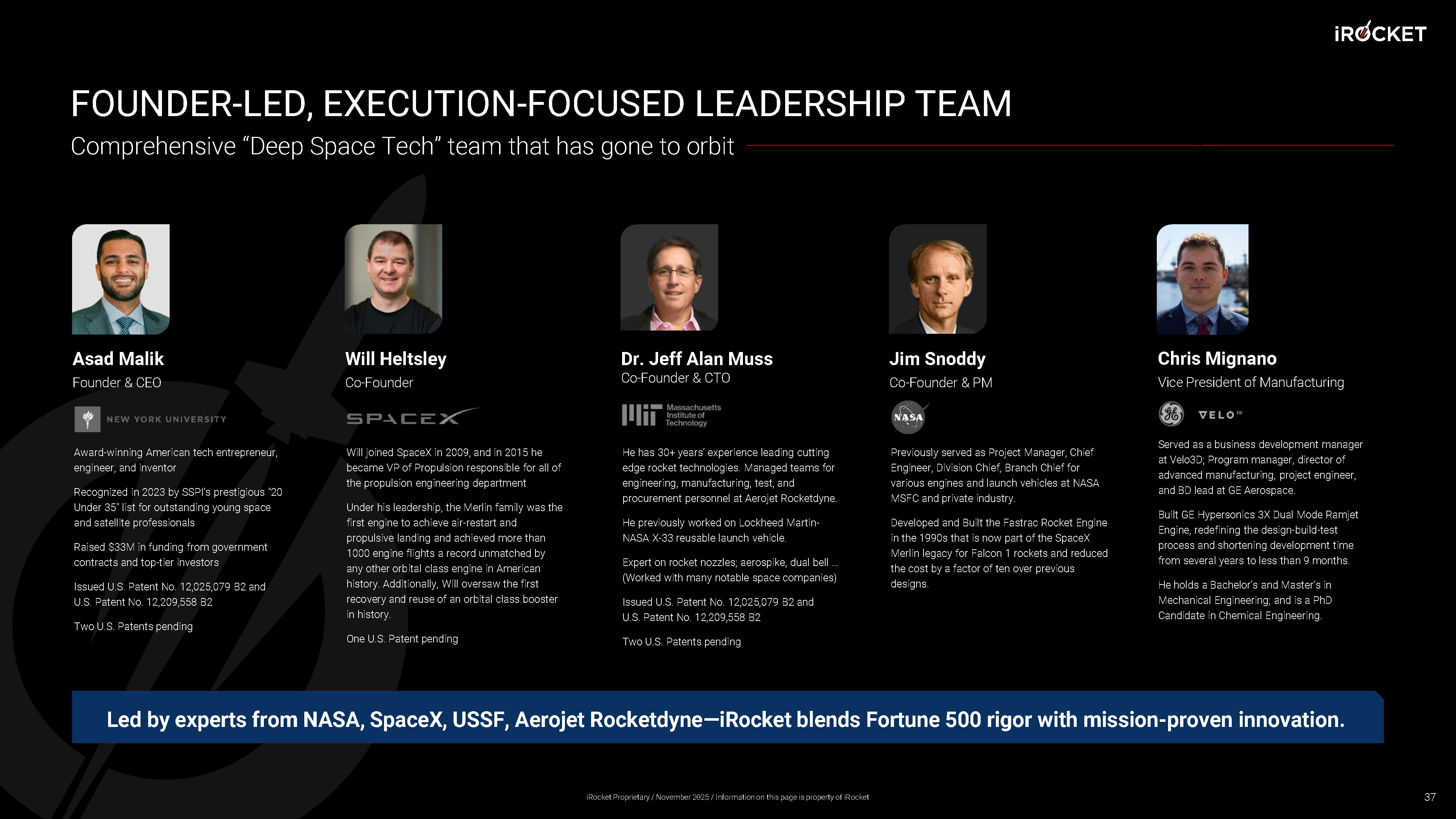 Asad Malik Founder & CEO Award - winning American tech entrepreneur, engineer, and inventor Recognized in 2023 by SSPI’s prestigious "20 Under 35" list for outstanding young space and satellite professionals Raised $33M in funding from government contracts and top - tier investors Issued U.S. Patent No. 12,025,079 B2 and U.S. Patent No. 12,209,558 B2 Two U.S. Patents pending FOUNDER - LED, EXECUTION - FOCUSED LEADERSHIP TEAM 37 Will Heltsley Co - Founder Will joined SpaceX in 2009, and in 2015 he became VP of Propulsion responsible for all of the propulsion engineering department Under his leadership, the Merlin family was the first engine to achieve air - restart and propulsive landing and achieved more than 1000 engine flights a record unmatched by any other orbital class engine in American history. Additionally, Will oversaw the first recovery and reuse of an orbital class booster in history. One U.S. Patent pending Dr. Jeff Alan Muss Co - Founder & CTO He has 30+ years’ experience leading cutting edge rocket technologies. Managed teams for engineering, manufacturing, test, and procurement personnel at Aerojet Rocketdyne. He previously worked on Lockheed Martin - NASA X - 33 reusable launch vehicle. Expert on rocket nozzles; aerospike, dual bell … (Worked with many notable space companies) Issued U.S. Patent No. 12,025,079 B2 and U.S. Patent No. 12,209,558 B2 Two U.S. Patents pending Jim Snoddy Co - Founder & PM Previously served as Project Manager, Chief Engineer, Division Chief, Branch Chief for various engines and launch vehicles at NASA MSFC and private industry. Developed and Built the Fastrac Rocket Engine in the 1990s that is now part of the SpaceX Merlin legacy for Falcon 1 rockets and reduced the cost by a factor of ten over previous designs. Comprehensive “Deep Space Tech” team that has gone to orbit Led by experts from NASA, SpaceX, USSF, Aerojet Rocketdyne — iRocket blends Fortune 500 rigor with mission - proven innovation. Chris Mignano Vice President of Manufacturing Served as a business development manager at Velo3D; Program manager, director of advanced manufacturing, project engineer, and BD lead at GE Aerospace. Built GE Hypersonics 3X Dual Mode Ramjet Engine, redefining the design - build - test process and shortening development time from several years to less than 9 months. He holds a Bachelor’s and Master’s in Mechanical Engineering; and is a PhD Candidate in Chemical Engineering. iRocket Proprietary / November 2025 / Information on this page is property of iRocket