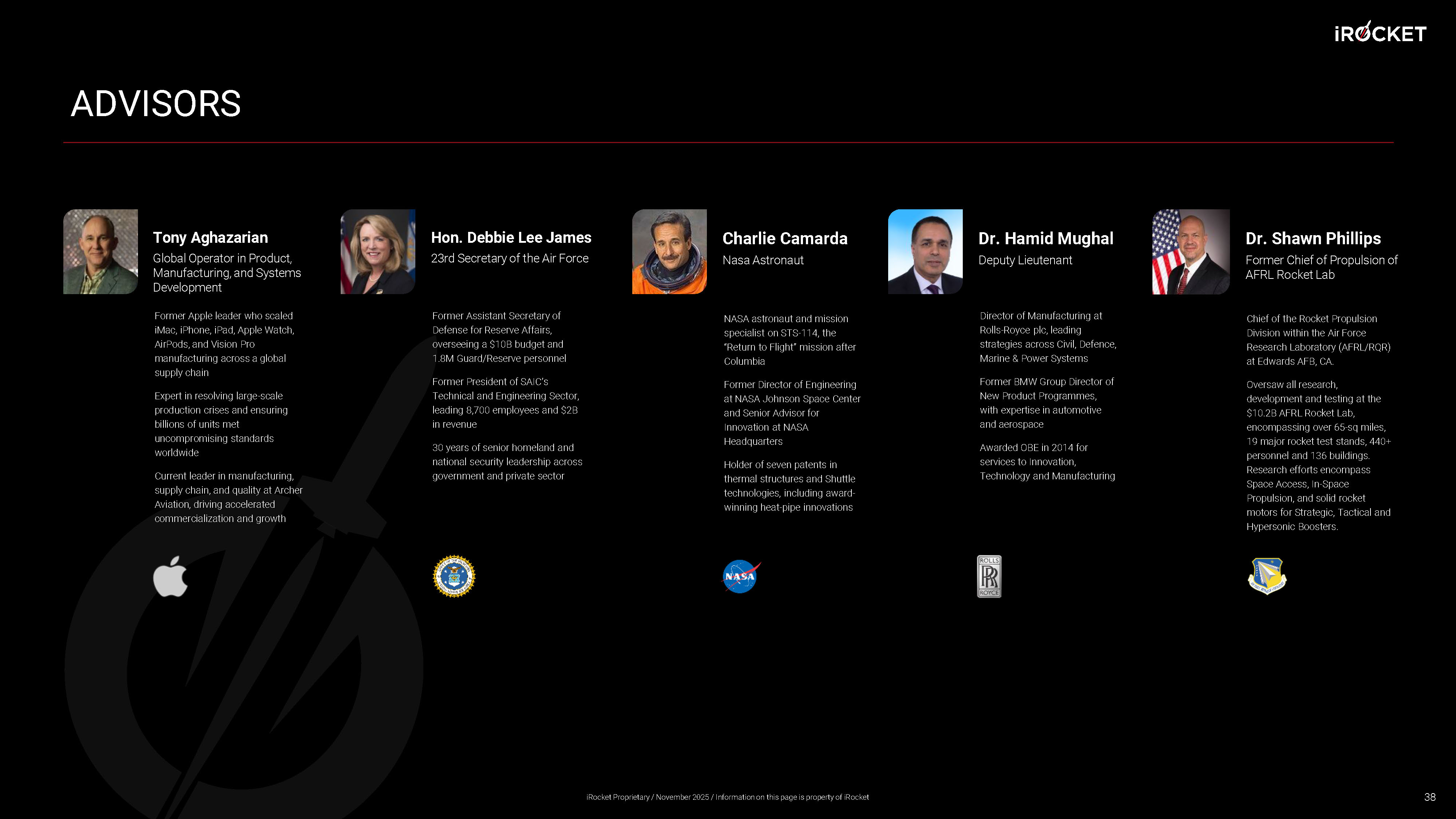 ADVISORS 38 Hon. Debbie Lee James 23rd Secretary of the Air Force Former Assistant Secretary of Defense for Reserve Affairs, overseeing a $10B budget and 1.8M Guard/Reserve personnel Former President of SAIC’s Technical and Engineering Sector, leading 8,700 employees and $2B in revenue 30 years of senior homeland and national security leadership across government and private sector Charlie Camarda Nasa Astronaut NASA astronaut and mission specialist on STS - 114, the “Return to Flight” mission after Columbia Former Director of Engineering at NASA Johnson Space Center and Senior Advisor for Innovation at NASA Headquarters Holder of seven patents in thermal structures and Shuttle technologies, including award - winning heat - pipe innovations Dr. Hamid Mughal Deputy Lieutenant Director of Manufacturing at Rolls - Royce plc, leading strategies across Civil, Defence , Marine & Power Systems Former BMW Group Director of New Product Programmes , with expertise in automotive and aerospace Awarded OBE in 2014 for services to Innovation, Technology and Manufacturing Dr. Shawn Phillips Former Chief of Propulsion of AFRL Rocket Lab Chief of the Rocket Propulsion Division within the Air Force Research Laboratory (AFRL/RQR) at Edwards AFB, CA. Oversaw all research, development and testing at the $10.2B AFRL Rocket Lab, encompassing over 65 - sq miles, 19 major rocket test stands, 440+ personnel and 136 buildings. Research efforts encompass Space Access, In - Space Propulsion, and solid rocket motors for Strategic, Tactical and Hypersonic Boosters. Tony Aghazarian Global Operator in Product, Manufacturing, and Systems Development Former Apple leader who scaled iMac, iPhone, iPad, Apple Watch, AirPods, and Vision Pro manufacturing across a global supply chain Expert in resolving large - scale production crises and ensuring billions of units met uncompromising standards worldwide Current leader in manufacturing, supply chain, and quality at Archer Aviation, driving accelerated commercialization and growth iRocket Proprietary / November 2025 / Information on this page is property of iRocket