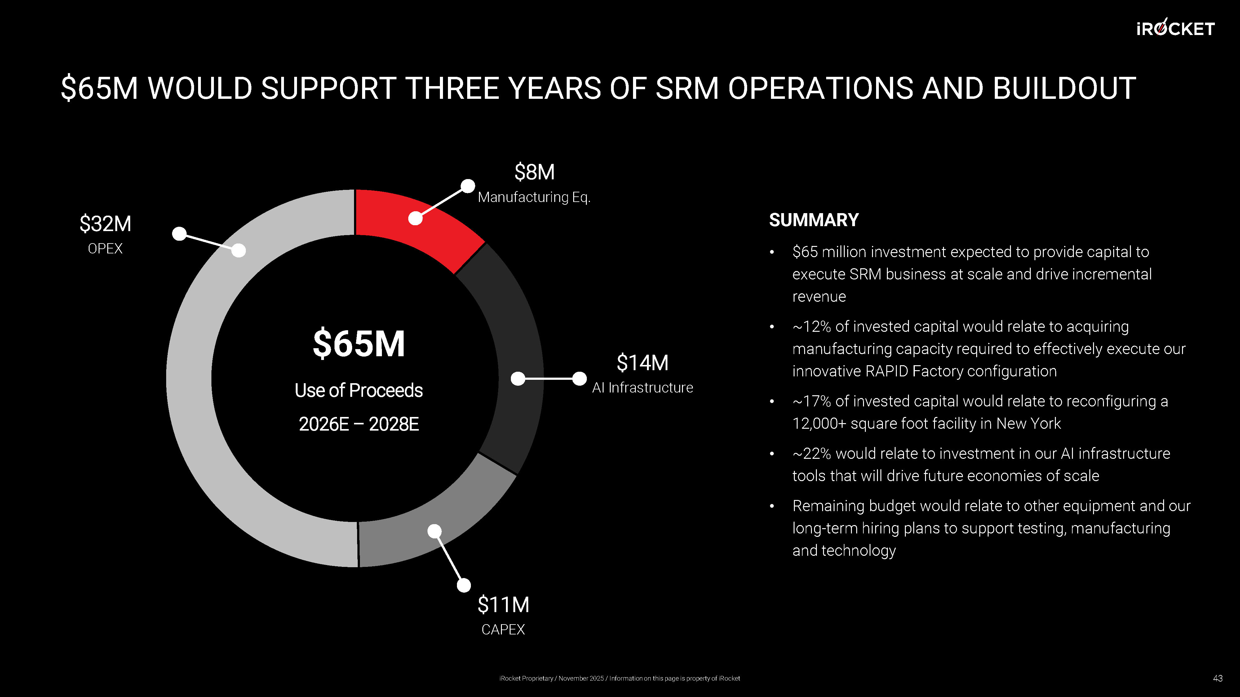 $65M WOULD SUPPORT THREE YEARS OF SRM OPERATIONS AND BUILDOUT 43 SUMMARY • $65 million investment expected to provide capital to execute SRM business at scale and drive incremental revenue • ~12% of invested capital would relate to acquiring manufacturing capacity required to effectively execute our innovative RAPID Factory configuration • ~17% of invested capital would relate to reconfiguring a 12,000+ square foot facility in New York • ~22% would relate to investment in our AI infrastructure tools that will drive future economies of scale • Remaining budget would relate to other equipment and our long - term hiring plans to support testing, manufacturing and technology $65M Use of Proceeds 2026E – 2028E $11M CAPEX $14M AI Infrastructure $32M OPEX $8M Manufacturing Eq. iRocket Proprietary / November 2025 / Information on this page is property of iRocket