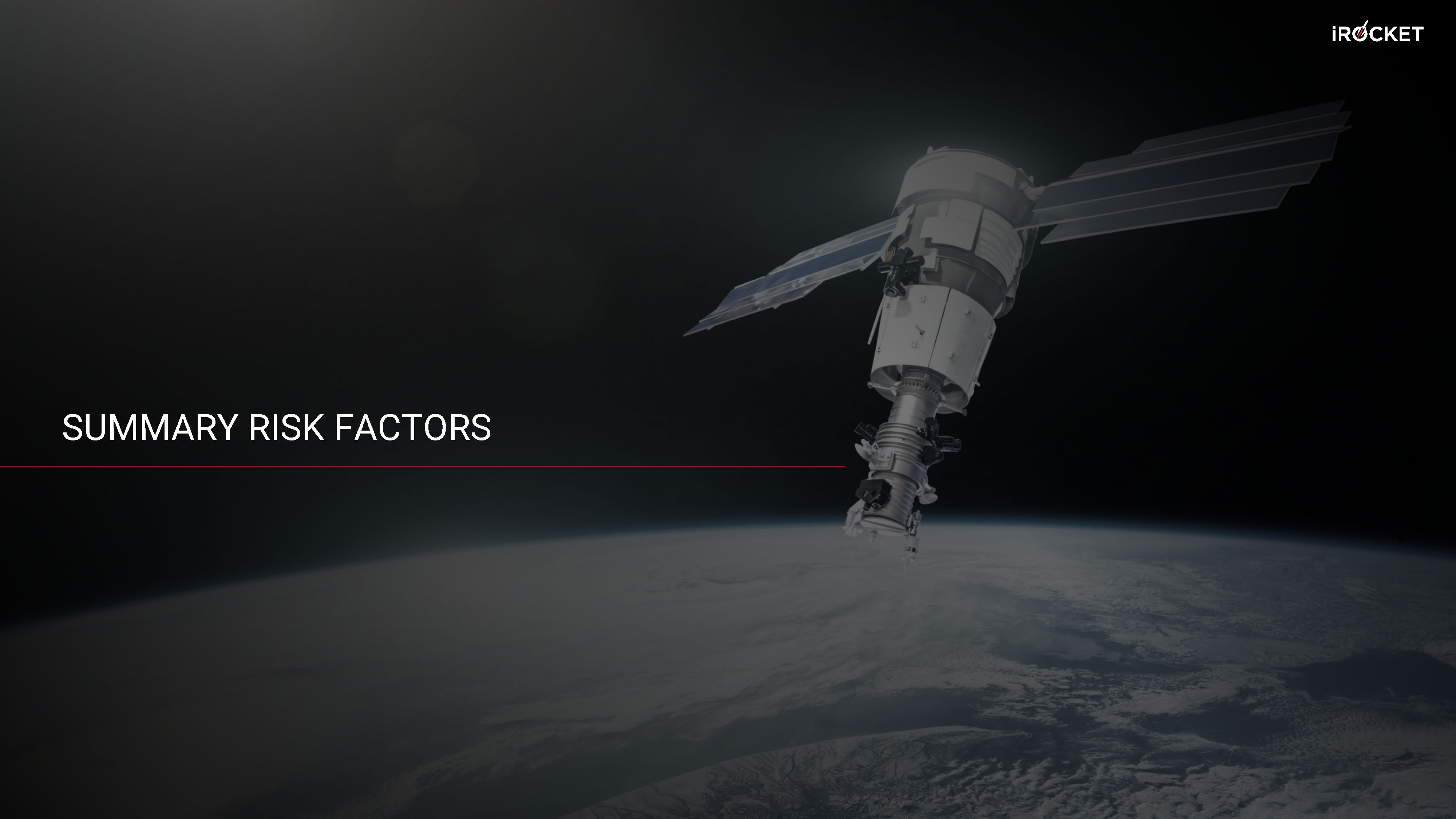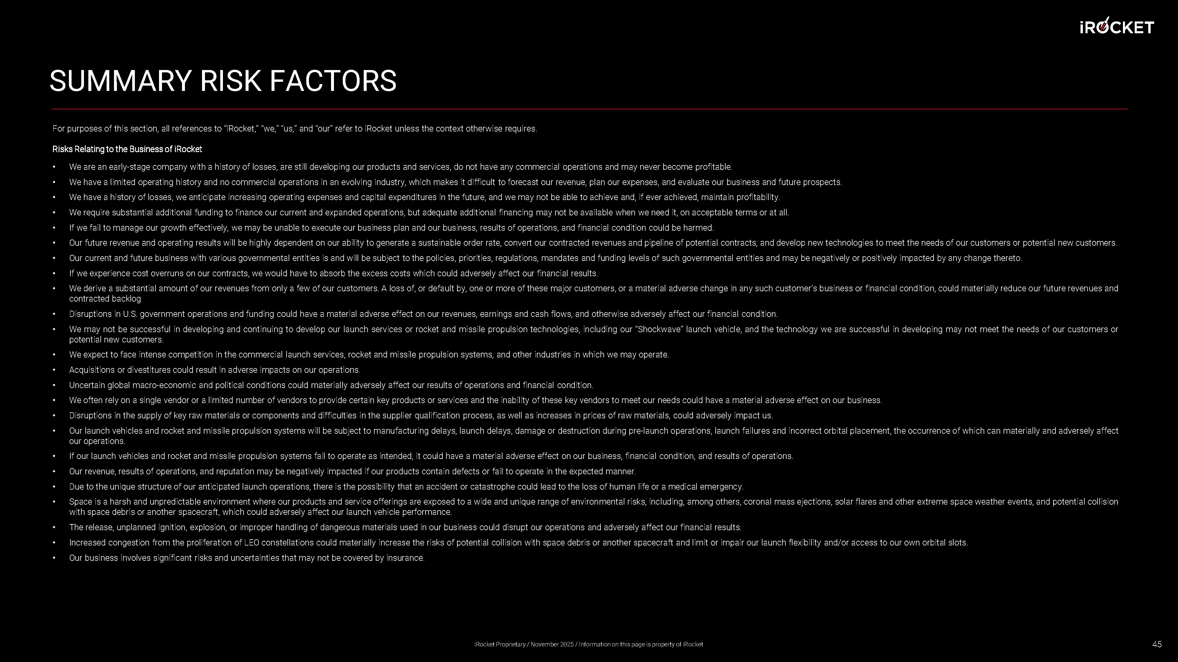For purposes of this section, all references to “ iRocket ,” “we,” “us,” and “our” refer to iRocket unless the context otherwise requires . Risks Relating to the Business of iRocket • We are an early - stage company with a history of losses, are still developing our products and services, do not have any commercial operations and may never become profitable . • We have a limited operating history and no commercial operations in an evolving industry, which makes it difficult to forecast our revenue, plan our expenses, and evaluate our business and future prospects . • We have a history of losses, we anticipate increasing operating expenses and capital expenditures in the future, and we may not be able to achieve and, if ever achieved, maintain profitability . • We require substantial additional funding to finance our current and expanded operations, but adequate additional financing may not be available when we need it, on acceptable terms or at all . • If we fail to manage our growth effectively, we may be unable to execute our business plan and our business, results of operations, and financial condition could be harmed . • Our future revenue and operating results will be highly dependent on our ability to generate a sustainable order rate, convert our contracted revenues and pipeline of potential contracts, and develop new technologies to meet the needs of our customers or potential new customers . • Our current and future business with various governmental entities is and will be subject to the policies, priorities, regulations, mandates and funding levels of such governmental entities and may be negatively or positively impacted by any change thereto . • If we experience cost overruns on our contracts, we would have to absorb the excess costs which could adversely affect our financial results . • We derive a substantial amount of our revenues from only a few of our customers . A loss of, or default by, one or more of these major customers, or a material adverse change in any such customer’s business or financial condition, could materially reduce our future revenues and contracted backlog • Disruptions in U . S . government operations and funding could have a material adverse effect on our revenues, earnings and cash flows, and otherwise adversely affect our financial condition . • We may not be successful in developing and continuing to develop our launch services or rocket and missile propulsion technologies, including our “Shockwave” launch vehicle, and the technology we are successful in developing may not meet the needs of our customers or potential new customers . • We expect to face intense competition in the commercial launch services, rocket and missile propulsion systems, and other industries in which we may operate . • Acquisitions or divestitures could result in adverse impacts on our operations . • Uncertain global macro - economic and political conditions could materially adversely affect our results of operations and financial condition . • We often rely on a single vendor or a limited number of vendors to provide certain key products or services and the inability of these key vendors to meet our needs could have a material adverse effect on our business . • Disruptions in the supply of key raw materials or components and difficulties in the supplier qualification process, as well as increases in prices of raw materials, could adversely impact us . • Our launch vehicles and rocket and missile propulsion systems will be subject to manufacturing delays, launch delays, damage or destruction during pre - launch operations, launch failures and incorrect orbital placement, the occurrence of which can materially and adversely affect our operations . • If our launch vehicles and rocket and missile propulsion systems fail to operate as intended, it could have a material adverse effect on our business, financial condition, and results of operations . • Our revenue, results of operations, and reputation may be negatively impacted if our products contain defects or fail to operate in the expected manner . • Due to the unique structure of our anticipated launch operations, there is the possibility that an accident or catastrophe could lead to the loss of human life or a medical emergency . • Space is a harsh and unpredictable environment where our products and service offerings are exposed to a wide and unique range of environmental risks, including, among others, coronal mass ejections, solar flares and other extreme space weather events, and potential collision with space debris or another spacecraft, which could adversely affect our launch vehicle performance . • The release, unplanned ignition, explosion, or improper handling of dangerous materials used in our business could disrupt our operations and adversely affect our financial results . • Increased congestion from the proliferation of LEO constellations could materially increase the risks of potential collision with space debris or another spacecraft and limit or impair our launch flexibility and/or access to our own orbital slots . • Our business involves significant risks and uncertainties that may not be covered by insurance . SUMMARY RISK FACTORS 45 iRocket Proprietary / November 2025 / Information on this page is property of iRocket