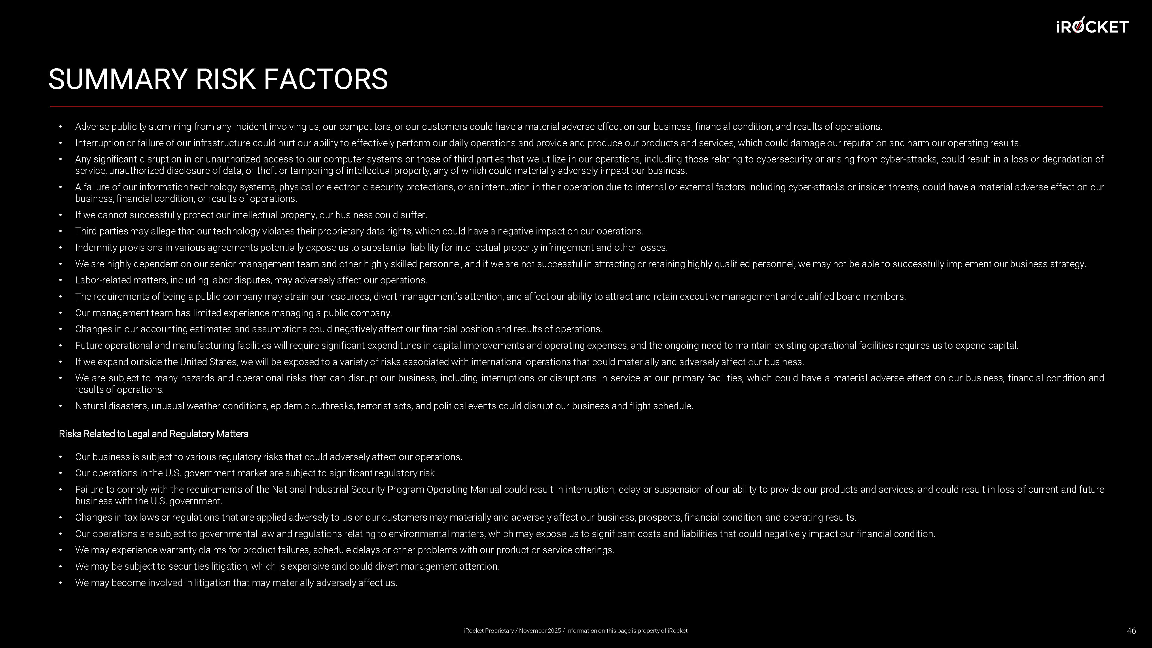 SUMMARY RISK FACTORS • Adverse publicity stemming from any incident involving us, our competitors, or our customers could have a material adverse effect on our business, financial condition, and results of operations . • Interruption or failure of our infrastructure could hurt our ability to effectively perform our daily operations and provide and produce our products and services, which could damage our reputation and harm our operating results . • Any significant disruption in or unauthorized access to our computer systems or those of third parties that we utilize in our operations, including those relating to cybersecurity or arising from cyber - attacks, could result in a loss or degradation of service, unauthorized disclosure of data, or theft or tampering of intellectual property, any of which could materially adversely impact our business . • A failure of our information technology systems, physical or electronic security protections, or an interruption in their operation due to internal or external factors including cyber - attacks or insider threats, could have a material adverse effect on our business, financial condition, or results of operations . • If we cannot successfully protect our intellectual property, our business could suffer . • Third parties may allege that our technology violates their proprietary data rights, which could have a negative impact on our operations . • Indemnity provisions in various agreements potentially expose us to substantial liability for intellectual property infringement and other losses . • We are highly dependent on our senior management team and other highly skilled personnel, and if we are not successful in attracting or retaining highly qualified personnel, we may not be able to successfully implement our business strategy . • Labor - related matters, including labor disputes, may adversely affect our operations . • The requirements of being a public company may strain our resources, divert management’s attention, and affect our ability to attract and retain executive management and qualified board members . • Our management team has limited experience managing a public company . • Changes in our accounting estimates and assumptions could negatively affect our financial position and results of operations . • Future operational and manufacturing facilities will require significant expenditures in capital improvements and operating expenses, and the ongoing need to maintain existing operational facilities requires us to expend capital . • If we expand outside the United States, we will be exposed to a variety of risks associated with international operations that could materially and adversely affect our business . • We are subject to many hazards and operational risks that can disrupt our business, including interruptions or disruptions in service at our primary facilities, which could have a material adverse effect on our business, financial condition and results of operations . • Natural disasters, unusual weather conditions, epidemic outbreaks, terrorist acts, and political events could disrupt our business and flight schedule . Risks Related to Legal and Regulatory Matters • Our business is subject to various regulatory risks that could adversely affect our operations . • Our operations in the U . S . government market are subject to significant regulatory risk . • Failure to comply with the requirements of the National Industrial Security Program Operating Manual could result in interruption, delay or suspension of our ability to provide our products and services, and could result in loss of current and future business with the U . S . government . • Changes in tax laws or regulations that are applied adversely to us or our customers may materially and adversely affect our business, prospects, financial condition, and operating results . • Our operations are subject to governmental law and regulations relating to environmental matters, which may expose us to significant costs and liabilities that could negatively impact our financial condition . • We may experience warranty claims for product failures, schedule delays or other problems with our product or service offerings . • We may be subject to securities litigation, which is expensive and could divert management attention . • We may become involved in litigation that may materially adversely affect us . 46 iRocket Proprietary / November 2025 / Information on this page is property of iRocket