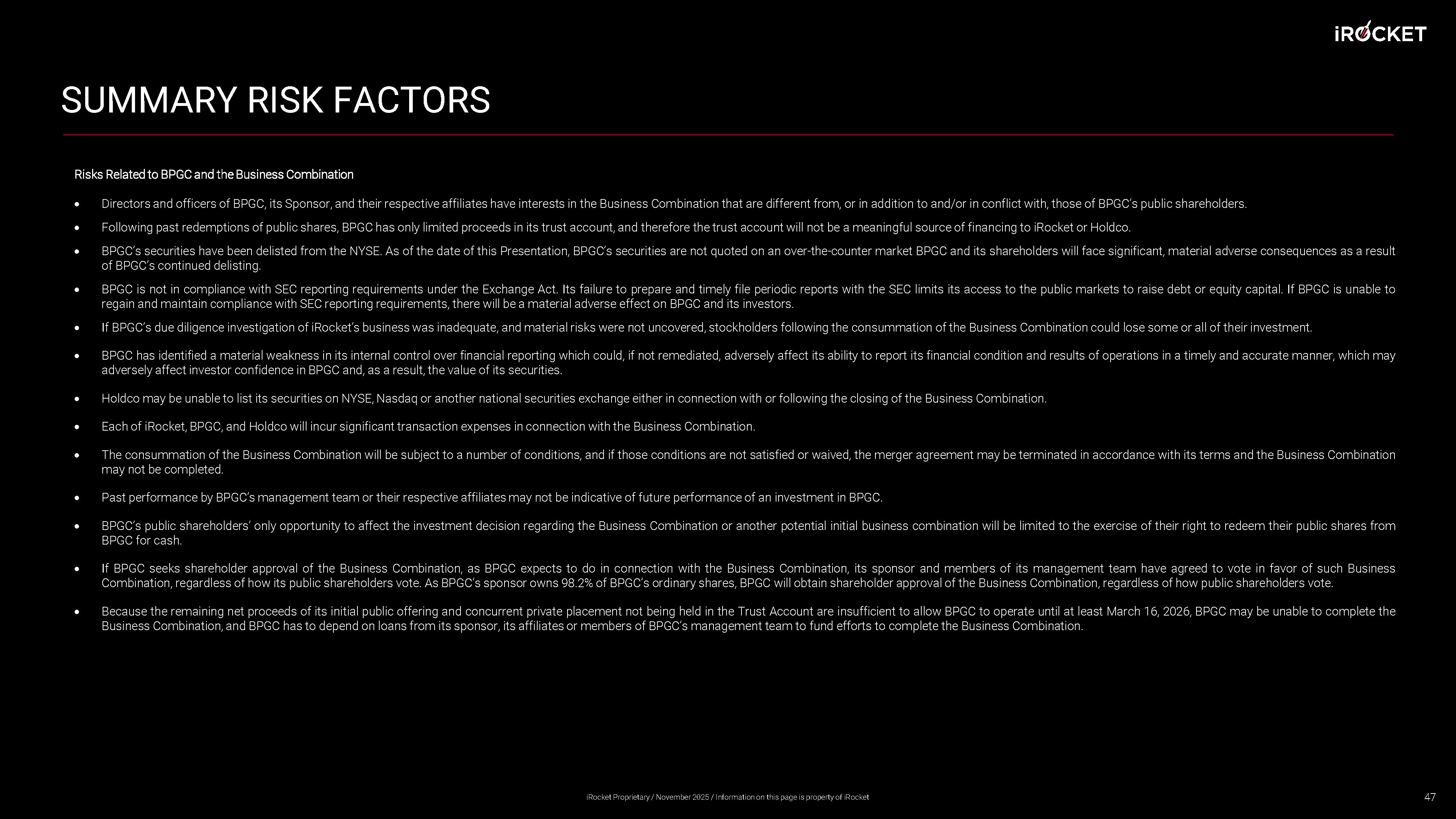 SUMMARY RISK FACTORS Risks Related to BPGC and the Business Combination Directors and officers of BPGC, its Sponsor, and their respective affiliates have interests in the Business Combination that are different from, or in addition to and/or in conflict with, those of BPGC’s public shareholders . Following past redemptions of public shares, BPGC has only limited proceeds in its trust account, and therefore the trust account will not be a meaningful source of financing to iRocket or Holdco . BPGC’s securities have been delisted from the NYSE . As of the date of this Presentation, BPGC’s securities are not quoted on an over - the - counter market BPGC and its shareholders will face significant, material adverse consequences as a result of BPGC’s continued delisting . BPGC is not in compliance with SEC reporting requirements under the Exchange Act . Its failure to prepare and timely file periodic reports with the SEC limits its access to the public markets to raise debt or equity capital . If BPGC is unable to regain and maintain compliance with SEC reporting requirements, there will be a material adverse effect on BPGC and its investors . If BPGC’s due diligence investigation of iRocket’s business was inadequate, and material risks were not uncovered, stockholders following the consummation of the Business Combination could lose some or all of their investment . BPGC has identified a material weakness in its internal control over financial reporting which could, if not remediated, adversely affect its ability to report its financial condition and results of operations in a timely and accurate manner, which may adversely affect investor confidence in BPGC and, as a result, the value of its securities . Holdco may be unable to list its securities on NYSE, Nasdaq or another national securities exchange either in connection with or following the closing of the Business Combination . Each of iRocket , BPGC, and Holdco will incur significant transaction expenses in connection with the Business Combination . The consummation of the Business Combination will be subject to a number of conditions, and if those conditions are not satisfied or waived, the merger agreement may be terminated in accordance with its terms and the Business Combination may not be completed . Past performance by BPGC’s management team or their respective affiliates may not be indicative of future performance of an investment in BPGC . BPGC’s public shareholders’ only opportunity to affect the investment decision regarding the Business Combination or another potential initial business combination will be limited to the exercise of their right to redeem their public shares from BPGC for cash . If BPGC seeks shareholder approval of the Business Combination, as BPGC expects to do in connection with the Business Combination, its sponsor and members of its management team have agreed to vote in favor of such Business Combination, regardless of how its public shareholders vote . As BPGC’s sponsor owns 98 . 2 % of BPGC’s ordinary shares, BPGC will obtain shareholder approval of the Business Combination, regardless of how public shareholders vote . Because the remaining net proceeds of its initial public offering and concurrent private placement not being held in the Trust Account are insufficient to allow BPGC to operate until at least March 16 , 2026 , BPGC may be unable to complete the Business Combination, and BPGC has to depend on loans from its sponsor, its affiliates or members of BPGC’s management team to fund efforts to complete the Business Combination . 47 iRocket Proprietary / November 2025 / Information on this page is property of iRocket