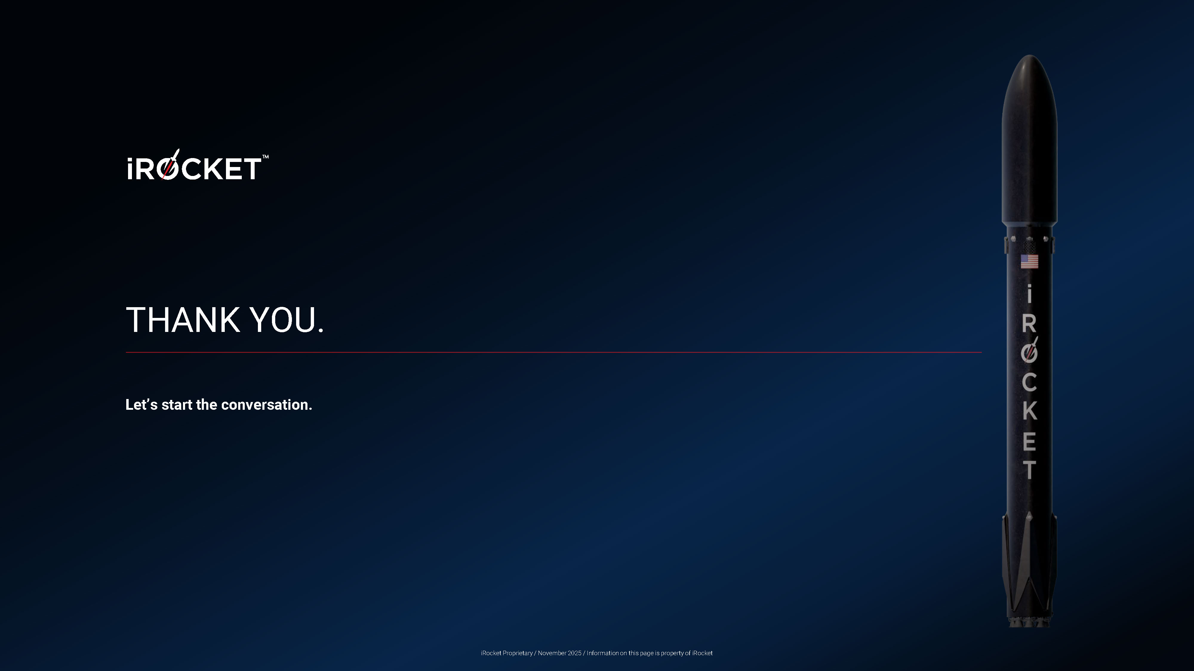 THANK YOU. Let’s start the conversation. iRocket Proprietary / November 2025 / Information on this page is property of iRocket