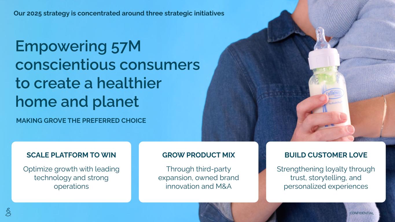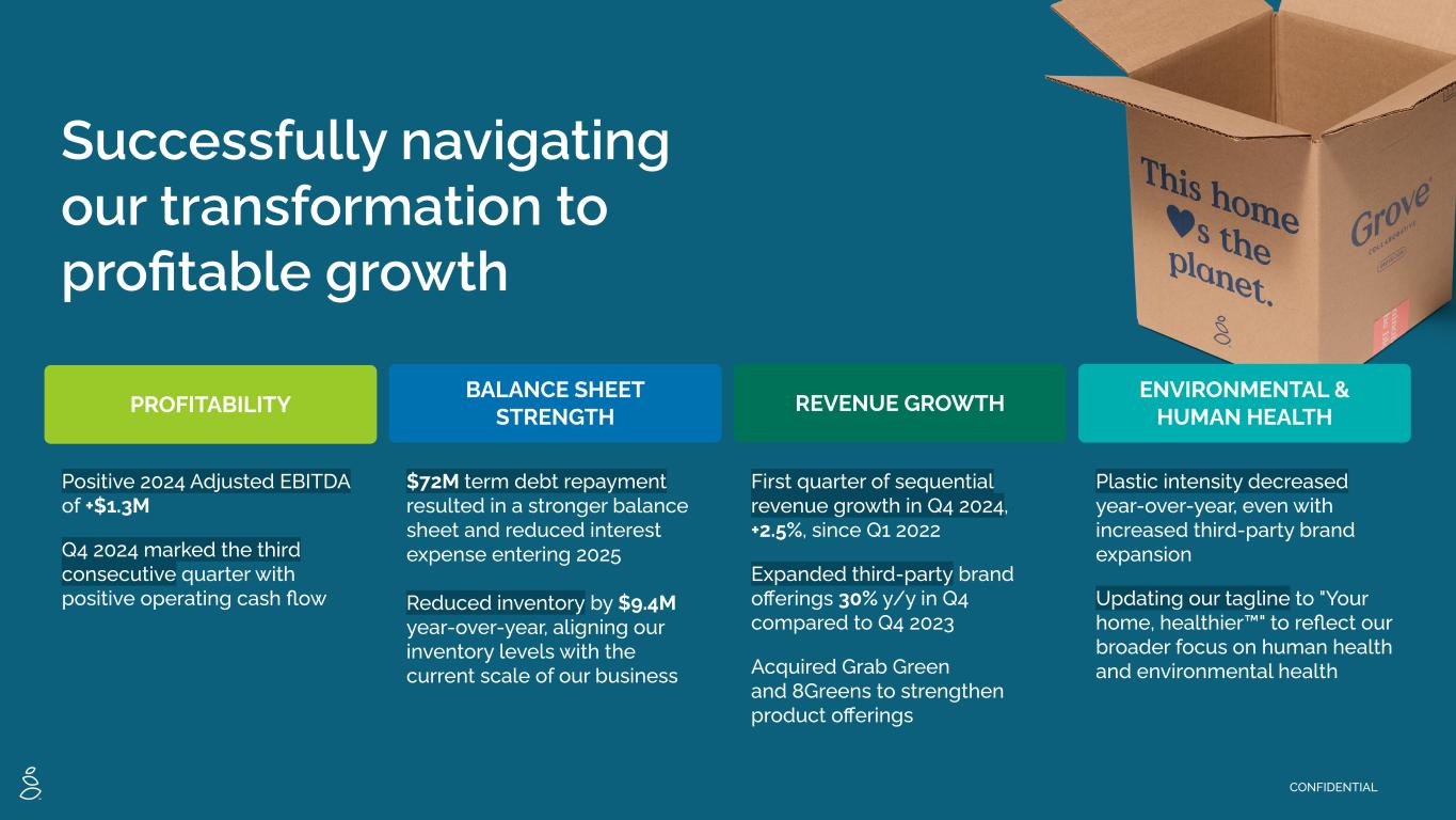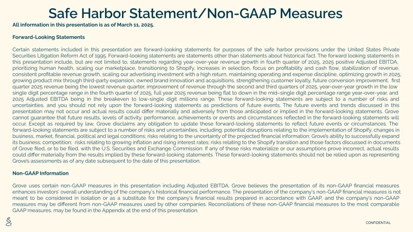 CONFIDENTIAL All information in this presentation is as of March 11, 2025. Forward-Looking Statements Certain statements included in this presentation are forward-looking statements for purposes of the safe harbor provisions under the United States Private Securities Litigation Reform Act of 1995. Forward-looking statements are statements other than statements about historical fact. The forward looking statements in this presentation include, but are not limited to, statements regarding year-over-year revenue growth in fourth quarter of 2025, 2025 positive Adjusted EBITDA, prioritizing human health, scaling our marketplace, transitioning to Shopify, increases in selection, focus on profitability and cash flow, stabilization of revenue, consistent profitable revenue growth, scaling our advertising investment with a high return, maintaining operating and expense discipline, optimizing growth in 2025, growing product mix through third-party expansion, owned brand innovation and acquisitions, strengthening customer loyalty, future conversion improvement, first quarter 2025 revenue being the lowest revenue quarter, improvement of revenue through the second and third quarters of 2025, year-over-year growth in the low single digit percentage range in the fourth quarter of 2025, full year 2025 revenue being flat to down in the mid–single digit percentage range year-over-year, and 2025 Adjusted EBITDA being in the breakeven to low-single digit millions range. These forward-looking statements are subject to a number of risks and uncertainties, and you should not rely upon the forward-looking statements as predictions of future events. The future events and trends discussed in this presentation may not occur and actual results could differ materially and adversely from those anticipated or implied in the forward-looking statements. Grove cannot guarantee that future results, levels of activity, performance, achievements or events and circumstances reflected in the forward-looking statements will occur. Except as required by law, Grove disclaims any obligation to update these forward-looking statements to reflect future events or circumstances. The forward-looking statements are subject to a number of risks and uncertainties, including: potential disruptions relating to the implementation of Shopify, changes in business, market, financial, political and legal conditions; risks relating to the uncertainty of the projected financial information; Grove’s ability to successfully expand its business; competition; risks relating to growing inflation and rising interest rates; risks relating to the Shopify transition and those factors discussed in documents of Grove filed, or to be filed, with the U.S. Securities and Exchange Commission. If any of these risks materialize or our assumptions prove incorrect, actual results could differ materially from the results implied by these forward-looking statements. These forward-looking statements should not be relied upon as representing Grove’s assessments as of any date subsequent to the date of this presentation. Non-GAAP Information Grove uses certain non-GAAP measures in this presentation including Adjusted EBITDA. Grove believes the presentation of its non-GAAP financial measures enhances investors' overall understanding of the company's historical financial performance. The presentation of the company's non-GAAP financial measures is not meant to be considered in isolation or as a substitute for the company's financial results prepared in accordance with GAAP, and the company's non-GAAP measures may be different from non-GAAP measures used by other companies. Reconciliations of these non-GAAP financial measures to the most comparable GAAP measures, may be found in the Appendix at the end of this presentation. Safe Harbor Statement/Non-GAAP Measures