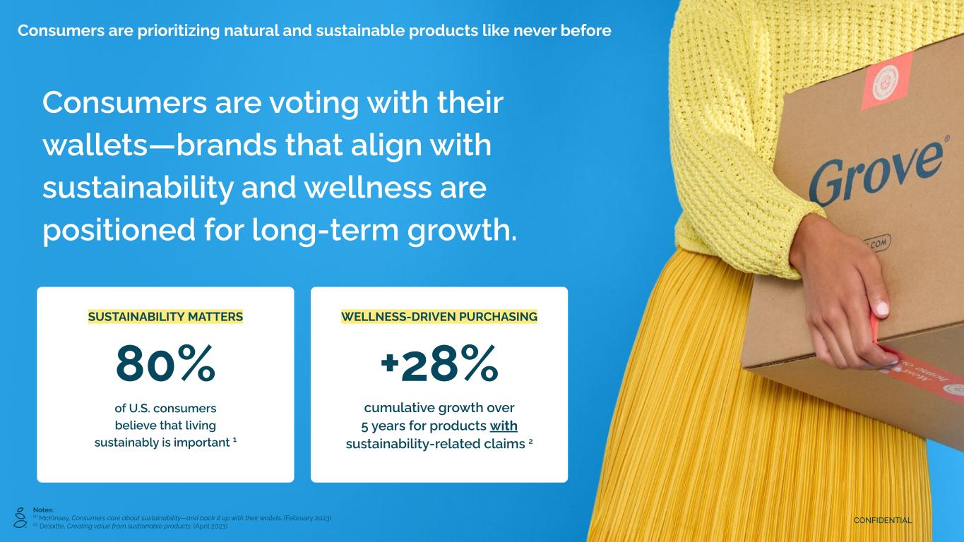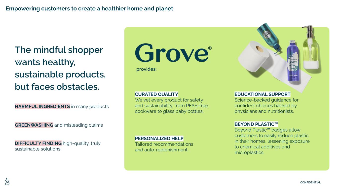 CONFIDENTIAL Grove Collaborative: The leading platform for conscientious consumers A differentiated alternative to Amazon and mass retailers. Helping consumers reduce exposure to chemical additives and microplastics. Every product meets rigorous standards for health, sustainability, and performance. Leading the way Beyond Plastic™A higher standard Vetted essentials for a healthier home, body, and planet