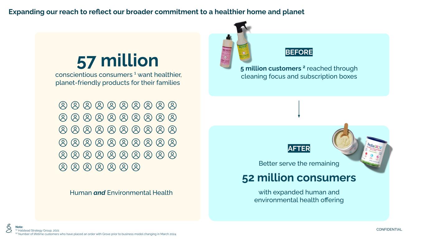 CONFIDENTIAL Expanding our reach to reflect our broader commitment to a healthier home and planet Human and Environmental Health BEFORE 5 million customers 2 reached through cleaning focus and subscription boxes 57 million conscientious consumers 1 want healthier, planet-friendly products for their families Note: (1) Halstead Strategy Group, 2021 (2) Number of lifetime customers who have placed an order with Grove prior to business model changing in March 2024 AFTER Better serve the remaining 52 million consumers with expanded human and environmental health offering