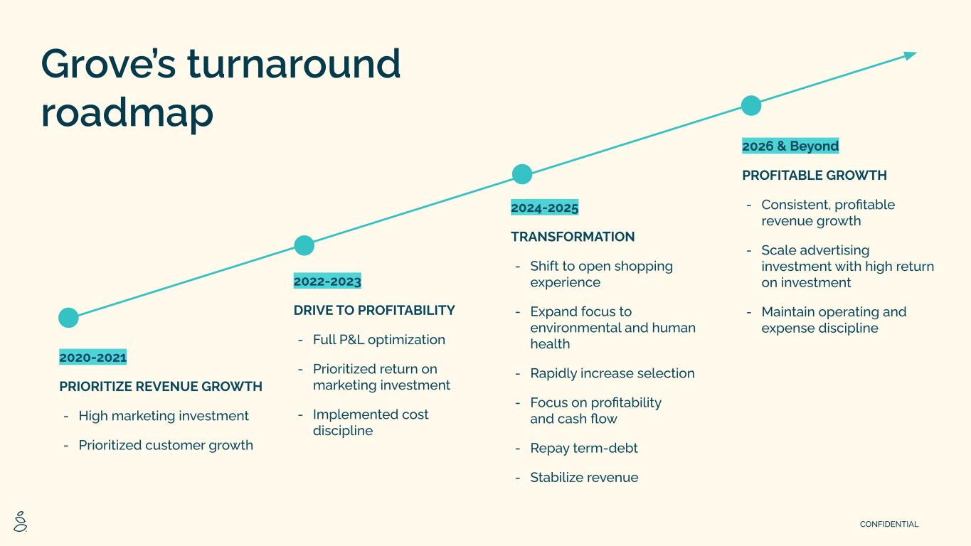 CONFIDENTIAL Grove’s turnaround roadmap 2020-2021 PRIORITIZE REVENUE GROWTH - High marketing investment - Prioritized customer growth 2022-2023 DRIVE TO PROFITABILITY - Full P&L optimization - Prioritized return on marketing investment - Implemented cost discipline 2024-2025 TRANSFORMATION - Shift to open shopping experience - Expand focus to environmental and human health - Rapidly increase selection - Focus on profitability and cash flow - Repay term-debt - Stabilize revenue 2026 & Beyond PROFITABLE GROWTH - Consistent, profitable revenue growth - Scale advertising investment with high return on investment - Maintain operating and expense discipline