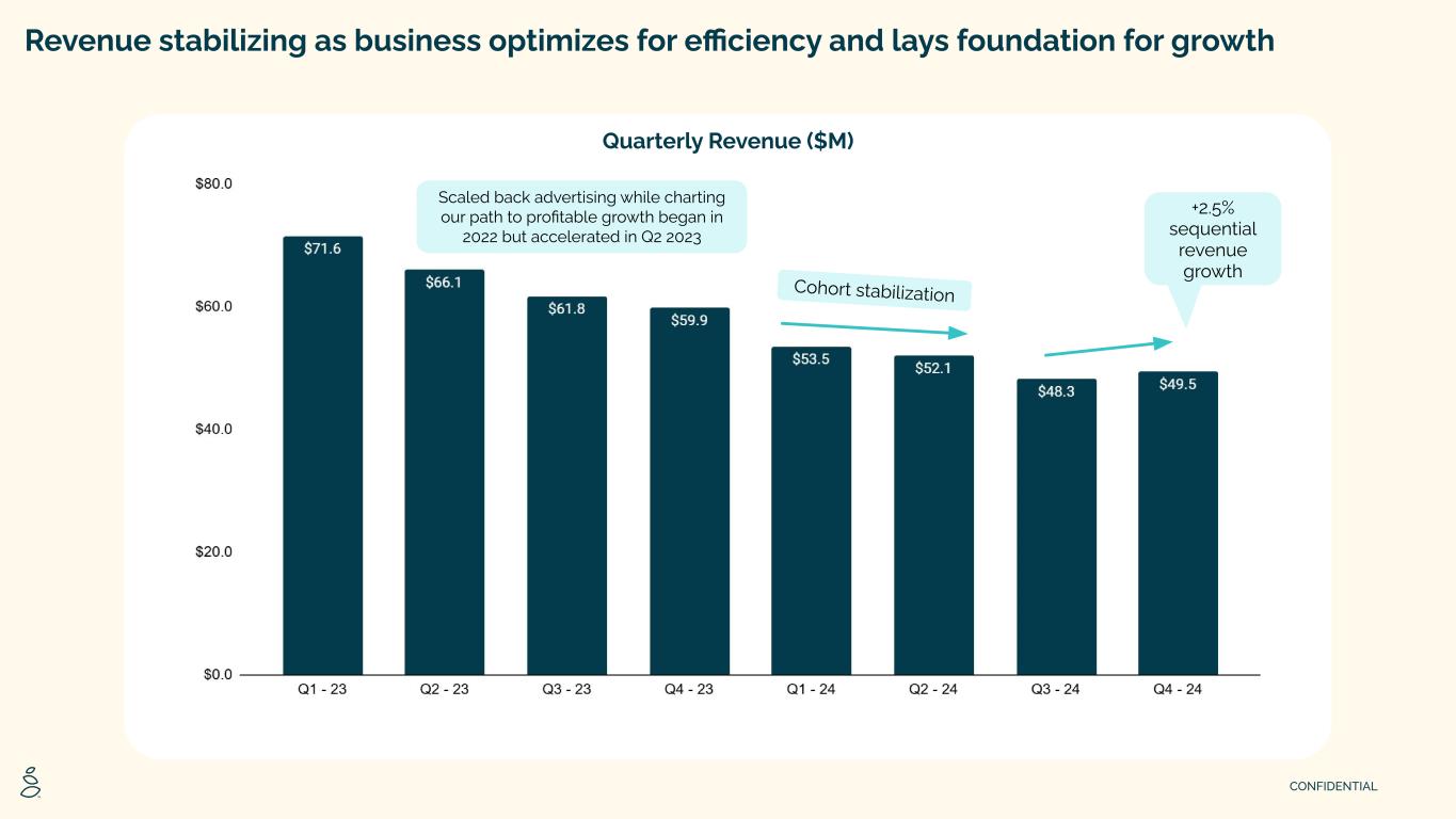 CONFIDENTIAL Scaled back advertising while charting our path to profitable growth began in 2022 but accelerated in Q2 2023 +2.5% sequential revenue growth Cohort stabilization Revenue stabilizing as business optimizes for efficiency and lays foundation for growth Quarterly Revenue ($M)